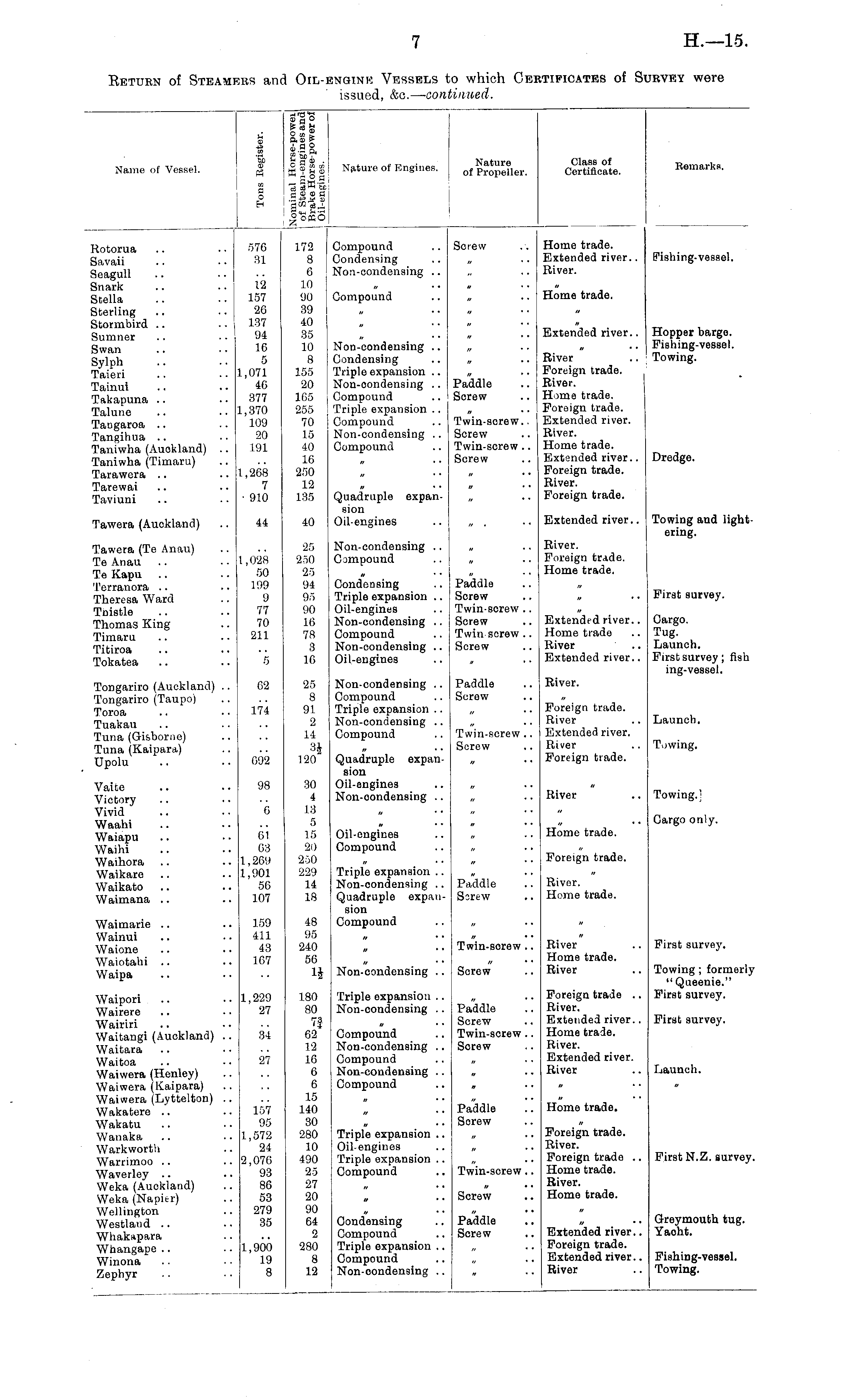 Name of Vessel. H a o H " 5Sfl° III ill g |h Nature of Engine.. o( $*»&„. ,— S h- 1 ■- eg tc d a> a> fl &*& Class of Certificate. Remarks. Rotorua Bavaii Seagull Snark Stella Sterling Stormbird Sumner Swan Sylph Taieri Tainui Takapuna Talune Tangaroa .. Tangihua Taniwha (Auckland) .. Taniwha (Timaru) Tarawera Tarewai Taviuni 576 172 8 6 10 90 39 40 35 10 8 155 20 165 255 70 15 40 L6 250 12 185 Compound Condensing Non-condensing .. Screw Home trade. Extended river.. River. Fishing-vessel. 12 157 26 137 94 16 5 1,071 46 377 1,370 109 20 L91 Compound Non-condensing .. Condensing Triple expansion .. Non-oondensing .. Compound Triple expansion .. Compound Non-condensing .. Compound Home trade. Extended river.. River Foreign trade. River. Home trade. Foreign trade. Extended river. River. Home trade. Extended river.. Foreign trade. River. Foreign trade. Hopper bargo. Fishing-vessel. Towing. Paddle Screw Twin-screw.. Screw Twin-screw .. Screw 1,268 7 ■ 910 Dredge. Quadruple expansion Oil-engines Towing and lightering. Tawera (Auckland) 44 40 Extended river.. Tawera (Te Anau) Te Anau Te Kapu Terranora Theresa Ward Thistle Thomas King Timaru Titiroa Tokatea 1,028 50 199 9 77 70 211 25 250 25 94 95 90 16 78 8 16 Non-condensing .. Compound River. Foreign trade. Home trade. Condensing Triple expansion .. Oil-engines Non-condensing .. Compound Non-condensing .. Oil-engines Paddle Screw Twin-screw .. Screw Twin screw .. Screw First survey. 5 Extended river.. Home trade River Extended river.. Cargo. Tug. Launch. First survey; fish ing-vessel. Tongariro (Auckland) .. Tongariro (Taupo) Toroa Tuakau Tuna (Gisborne) Tuna (Kaipara) Upolu 62 25 8 91 2 14 3J 120 Non-condensing .. Compound Triple expansion .. Non-condensing .. Compound Paddle Screw River. 174 Twin-screw .. Screw Foreign trade. River Extended river. River Foreign trade. Launch. Towing. 692 Quadruple expansion Oil-engines Non-oondensing .. Vaite Victory Vivid Waahi Waiapu Waihi Waihora Waikare Waikato Waimana 98 30 4 13 5 15 20 250 229 14 18 River Towing.' 6 Cargo only. 61 G3 1,269 1,901 56 107 Oil-engines Compound Home trade. Foreign trade. Triple expansion .. Non-condensing .. Quadruple expansion Compound Paddle Sirew River. Home trade. Waimarie Wainui Waione Waiotahi Waipa 159 411 43 167 48 95 240 56 4 Twin-screw .. River Home trade. River First survey. Non-condensing .. Screw Towing ; formerly "Queenie." First survey. Waipori Wairere Wairiri Waitangi (Auckland) .. Waitara Waitoa Waiwera (Henley) Waiwera (Kaipara) Waiwera (Lyttelton) .. Wakatere Wakatu Wanaka Warkworth Warrimoo Waverley Weka (Auckland) Weka (Napier) Wellington Westland .. Whakapara Whangape Winona Zephyr 1,229 27 34 180 80 7J 62 12 16 6 6 15 140 30 280 10 490 25 27 20 90 64 2 280 8 12 Triple oxpansion .. Non-condensing .. Compound Non-condensing .. Compound Non-condensing .. Compound i Paddle I Screw Twin-screw .. Screw Foreign trade .. River. Extended river.. Home trade. River. Extended river. River First survey. 27 Launch. 157 95 1,572 21 2,076 93 86 53 279 35 Paddle !! Screw Home trade. Triple expansion .. Oilengines Triple oxpansion .. Compound Foreign trade. River. Foreign trade .. Home trade. River. Home trade. First N.Z. survey. Twin-screw .. Screw Greymouth tug. Yacht. 1,900 19 8 Condensing Compound Triple expansion .. Compound Non-condensing .. Paddle !! Screw Extended river.. Foreign trade. Extended river.. River Fishing-vessel. Towing.