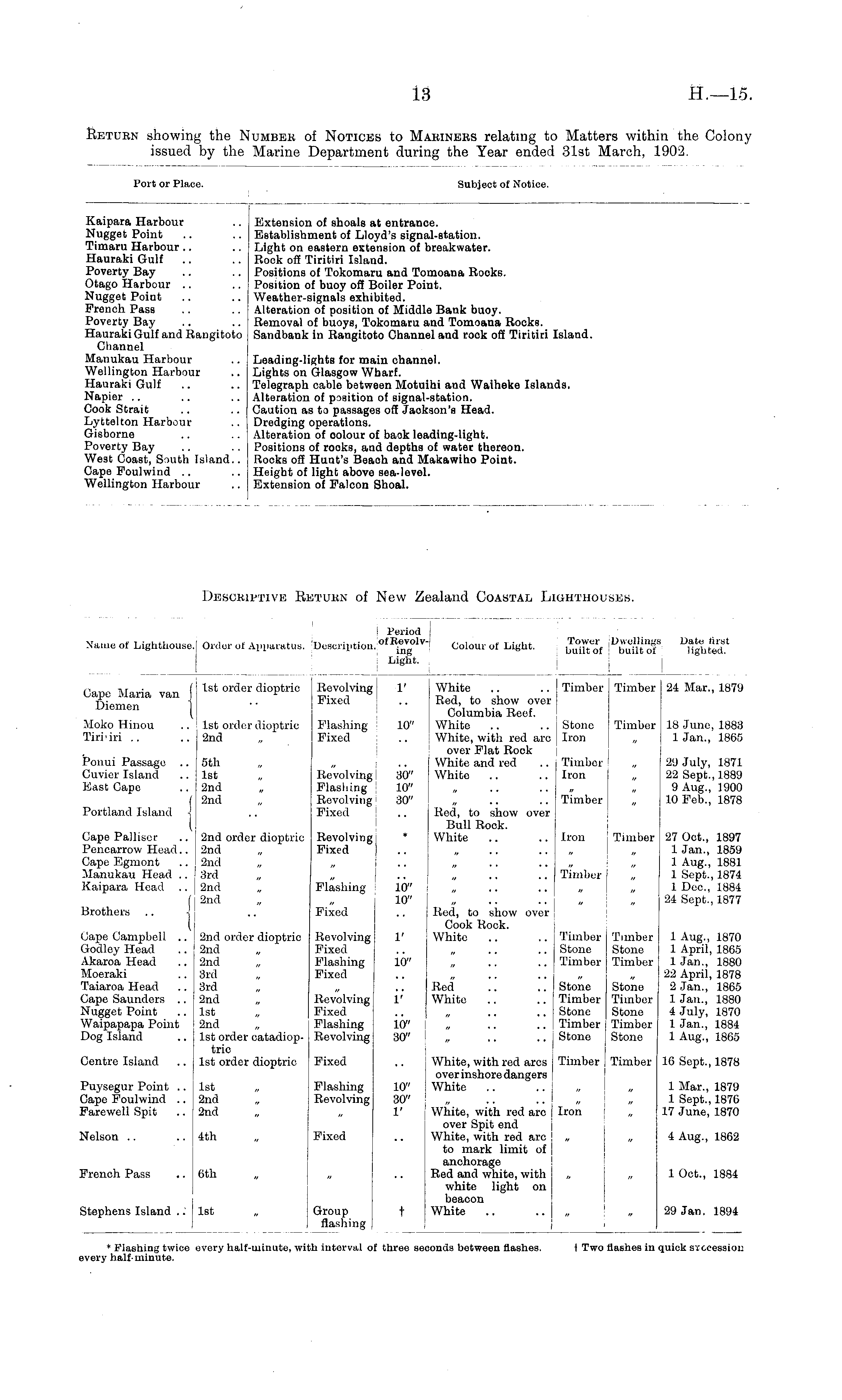 Descriptive Return of New Zealand Coastal Lighthouses.