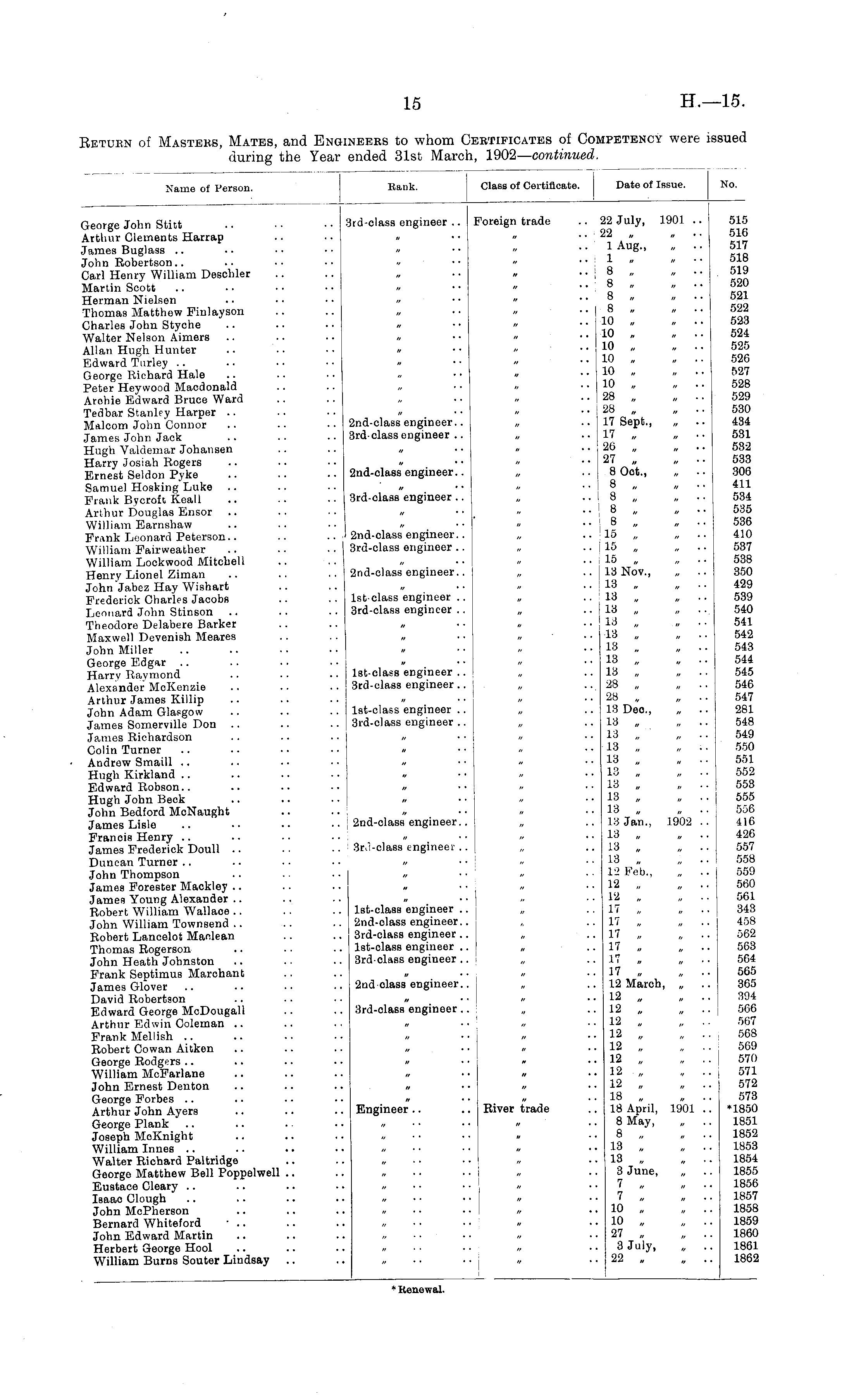 Name of Person. Rank. Class of Certificate. Date of Issue. No. George John Stitt Arthur Clements Harrap James Buglass John Robertson.. Carl Henry William Deschler Martin Scott Herman Nielsen Thomas Matthew Fiulayson Charles John Styche Walter Nelson Aimers Allan Hugh Hunter Edward Turley George Richard Hale Peter Heywood Macdonald Arohie Edward Bruce Ward Tedbar Stanley Harper Malcom John Connor James John Jack Hugh Valdemar Johansen Harry Josiah Rogers Ernest Seldon Pyke Samuel Hosking Luke .. Frank Bycroft Keall Arthur Douglas Ensor William Earnshaw Frank Leonard Peterson.. William Fairweather William Lockwood Mitchell Henry Lionel Ziman John Jabez Hay Wishart Frederick Charles Jacobs Leonard John Stinson Theodore Delabere Barker Maxwell Devenish Meares John Miller George Edgar Harry Raymond Alexander McKenzie Arthur James Killip John Adam Glasgow James Somerville Don James Richardson Colin Turner Andrew Smaill .. Hugh Kirkland Edward Robson.. Hugh John Beck John Bedford McNaught James Lisle Francis Henry James Frederick Doull Duncan Turner John Thompson James Forester Mackley James Young Alexander Robert William Wallaoe John William Townsend .. Robert Lancelot Maclean Thomas Rogerson John Heath Johnston Frank Septimus Marchant James Glover David Robertson Edward George McDougall Arthur Edwin Coleman Frank Mellish Robert Cowan Aitken George Rodgers William McFarlane John Ernest Denton George Forbes Arthur John Ayers George Plank Joseph MoKnight William Innes Walter Richard Paltridgo George Matthew Bell Poppelwell .. Eustace Cleary Isaac Clough John McPherson Bernard Whiteford • .. John Edward Martin Herbert George Hool William Burns Souter Lindsay 3rd-class engineer .. j Foreign trade 2nd-class engineer.. 3rd-class engineer .. 2nd-class engineer.. 3rd-class engineer.. 2nd-olass engineer.. 3rd-class engineer .. 2nd-class engineer.. lst-class engineer .. 3rd-class engineer .. lst-class engineer .. 3rd-class engineer ... lst-class engineer .. 3rd-class engineer .. .. I I .. 22 July, 1901 .. 22 „ » ■ • 1 Aug., „ .. 1 „ „ ■■ 8 „ „ •• 8 „ „ .. 8 . „ .. 8 „ „ .. 10 „ , .. 10 „ „ .. 10 „ „ .. 10 . „ .. 10 „ „ .. 10 . „ .. 28 „ „ .. 28 , , .. 17 Sept., „ .. 17 , . •• 26 , „ .. 27 „ . .. 8 Oct., „ • • 8 ■ . „ ■■ 8 8 . „ ■■ 8 15 15 . „ ■• 15 „ „ ■■ 13 Nov., „ .. 13 „ „ .. 13 „ „ .. 13 13 „ „ .. 13 13 „ „ • ■ 13 „ „ .. 13 28 28 „ 13 Deo., „ • ■ 18 „ „ .. 13 „ „ •• 13 „ „ .. 13 „ „ .. 18 „ „ .. 13 „ „ .. 13 , „ .. 13 „ „ .. 18 Jan., 1902 .. 18 „ „ .. 13 „ „ .. 18 12 Feb., „ .. 12 „ „ .. 12 „ „ .. 17 „ „ .. 17 „ „ .. 17 „ „ .. 17 „ „ .. 17 „ „ ■■ 17 „ „ .. 12 March, „ .. 12 , „ .. 12 „ , .. 12 . „ .. 12 „ „ .. 12 12 , „ .. 12 „ „ .. 12 „ „ .. 18 „ „ .. 18 April, 1901 .. 8 May, „ .. 8 „ „ .. 13 . „ .. 13 , „ .. 3 June, 7 „ „ .. 7 „ „ .. 10 „ „ .. 10 „ „ .. 27 . , .. 3 July, „ .. 22 „ „ .. 515 516 517 518 519 520 521 522 523 524 525 526 527 528 529 530 434 531 532 533 306 411 534 535 536 410 537 538 350 429 539 540 541 542 543 544 545 540 547 281 548 549 550 551 552 553 555 556 416 426 557 558 559 560 561 343 458 562 503 564 565 365 894 566 507 568 569 570 571 572 573 •1850 1851 1852 1853 1854 1855 1856 1857 1858 1859 1860 1861 1862 2nd-class engineer.. 3r<l-class engineer .. „ lst-class engineer .. 2nd-class engineer.. 3rd-class engineer lst-olass engineer .. 3rd-class engineer .. " - • 1 " 2ud class engineer.. ; 3rd-elass engineer .. // • ■ « Engineer .. .. River trade " ine ral.