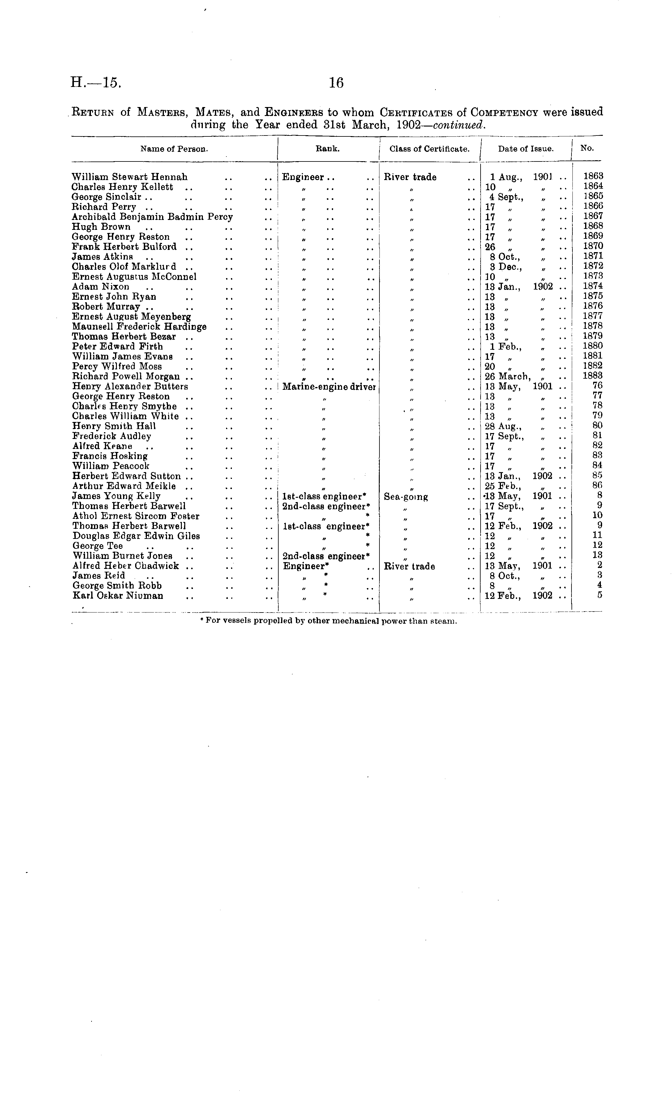 Return of Masters, Mates, and Engineers to whom Certificates of Competency were issued during the Year ended 31st March, 1902— continued.