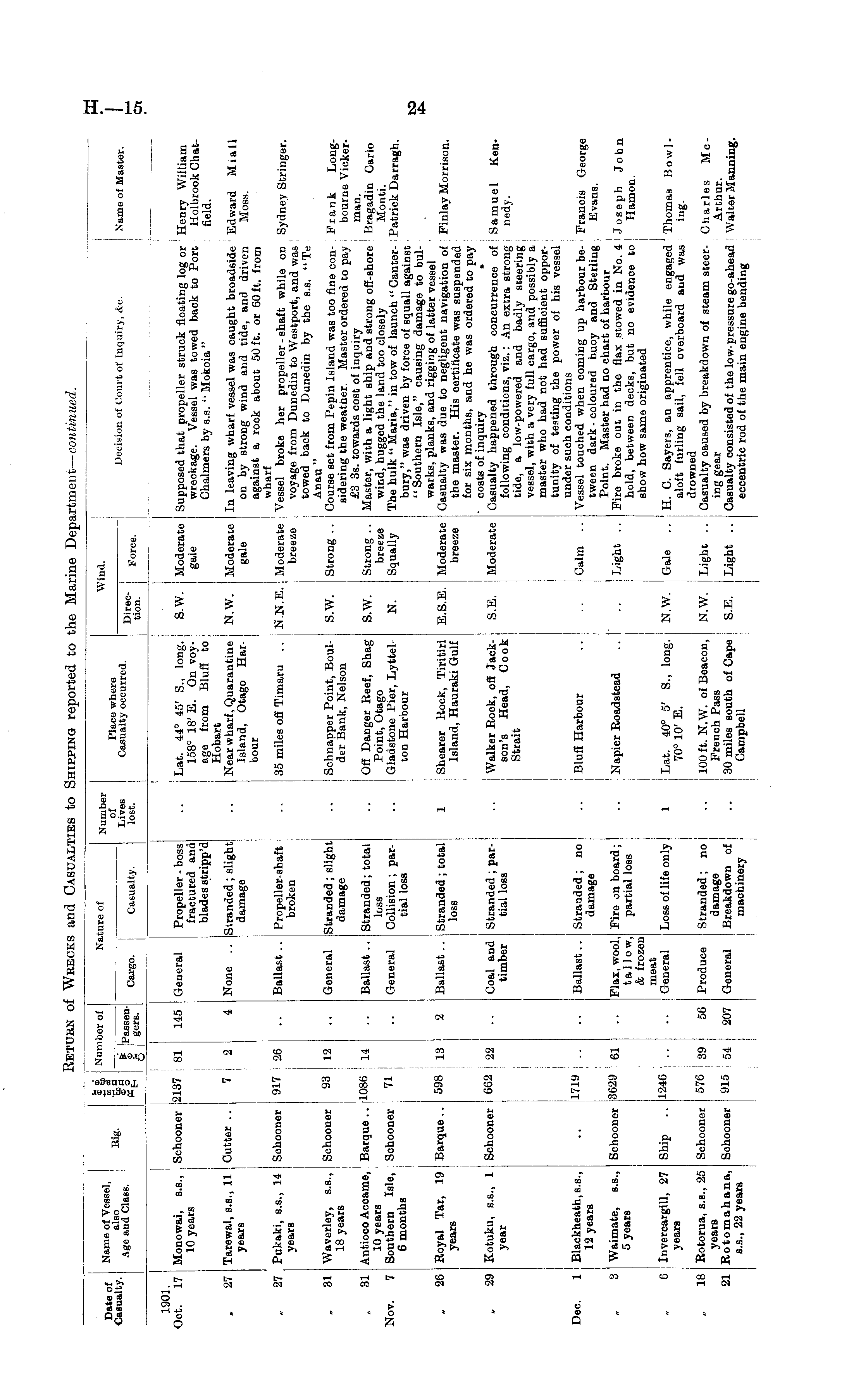Date of Casualty. Name of Vessel, also Age and Class. » s Number of Cargo. Nature of Natu: ire of Casualty. Number _ of Lives lost. Place where Casualty occurrec Wind. Decision of Court of Inquiry, &c. Name of Master. I Passes* Direction. Force. 1901. let. 17 Monowai, s.s., Schooner 10 years 2137 81 145 General Propeller - boss fractured and blades stripp'd Supposed that propeller struck floating log or Henry William wreokage. Vessel was towed back to Port Holbrook ChatChalmers by s.s. " Mokoia " field. Lat. 44° 45' S., long. 158° 18' E. On voyage from Bluff to Hobart Near wharf, Quarantine Island, Otago Harbour S.W. Moderate gale m 27 Tarewai, s.e., 11 Cutter .. years 7 2 None .. Stranded ; slight: damage N.W. Moderate gale In leaving wharf vessel was caught broadside Edward Mi all on by strong wind and tide, and driven Moss. against a rock about 50 ft. or 60 ft. from wharf Vessel broke her propeller -shaft while on Sydney Stringer. voyage from Dunedin to Westport, and was towed back to Dunedin by the s.s. "Te An&u " Course set from Pepin Island was too fine con- Frank Longsidering the weather Master ordered to pay bourne Vieker£3 3s. towards cost of inquiry man. Master, with a light ship and strong off-shore Bragadin Carlo wind, hugged the land too closely Monti. The hulk " Maria," in tow of launch " Canter- Patrick Darragh. bury," was driven by force of squall against "Southern Isle," causing damage to bulwarks, planks, and rigging of latter vessel Casualty was due to negligent navigation of Finlay Morrison. the master. His certificate was suspended for six months, and he was ordered to pay ■ costs of inquiry Casualty happened through concurrence of Samuel Kenfollowing conditions, viz.: An extra Btrong nedy. tide, a low-powered and badly steering vessel, with a very full cargo, and possibly a master who had not had sufficient opportunity of testing the power of his vessel under such conditions Vessel touched when coming up harbour be- Francis George tween dark - coloured buoy and Sterling Evans. Point. Master had no chart of harbour Fire broke out in the flax stowed in No. 4 Joseph John hold, between decks, but no evidence to Hamon. show how same originated 27 Pukaki, s.s., 14 Sohooner years 917 26 Ballast .. Propeller-shaft broken 35 miles off Timaru N.N.E. Moderate breeze * 31 Waverley, s.s., Sohooner 18 years 93 12 General Stranded; slight damage Schnapper Point, Boulder Bank, Nelson S.W. Strong .. 31 Antiooo Aooame, Barque .. 10 years Southern Isle, Schooner 6 months I 11086 I 14 Ballast .. Stranded; total loss Collision ; partial loss Off Danger Reef, Shag Point, Otago Gladstone Pier, Lyttel ton Harbour S.W. Strong .. breeze Squally Nov. 7 71 ! General N. 26 Royal Tar, 19 Barque .. years 598 13 Ballast .. Stranded; total loss 1 Shearer Rock, Tiritiri Island, Hauraki Gulf E.S.B. Moderate breeze 29 Kotuku, s.s., 1 Schooner year 662 22 Coal and timber Stranded ; partial loss Walker Rock, off Jackson's Head, Cook Strait S.E. Moderate Blackheath,s.s., 12 years 1719 Stranded; no damage Bluff Harbour Dec. 1 Ballast.. Calm .. 3 6 Waimate, e.s., Schooner 5 years Schooner Ship .. 3629 61 Flax, wool, tallow, & frozen meat General Fire on board; partial loss Napier Roadstead Light .. Invercargill, 27 Ship years 1246 Loss of life only 1 Lat. 40° 5' 8., long. 70° 10' E. N.W. Gale .. H. C. Sayers, an apprentice, while engaged Thomas Bowlaloft furling sail, fell overboard and was ing. drowned Casualty caused by breakdown of steam steer- Charles Moing gear Arthur. Casualty consisted of the low-pressure go-ahead Walter Manning, eccentric rod of the main engine bending 18 Eotorua, s.s., 25 Schooner years Botomahana, Schooner s.s., 22 years Schooner 576 56 Produce Stranded; no damage Breakdown of machinery 100 ft. N.W. of Beacon, French Pass 30 miles south of Cape Campbell N.W. Light .. 39 21 Schooner 915 54 207 General S.E. Light .. I