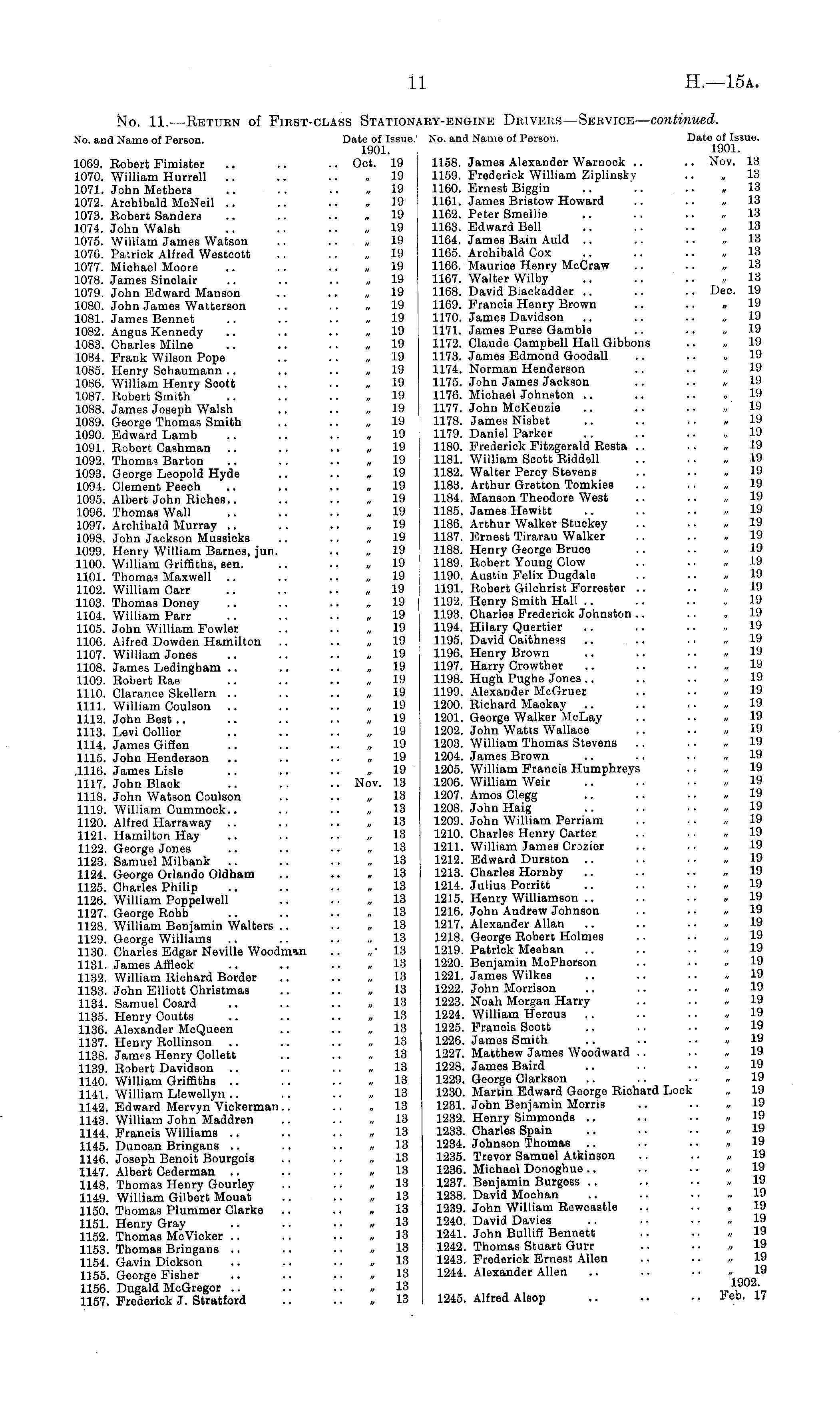 No. and Name of Person. Date of Issue. 1901. 1158. James Alexander Waruock .. .. Nov. 13 1159. Frederick William Ziplinsky .. „ 13 1160. Ernest Biggin .. '.. .. ,13 1161. James Bristow Howard .. .. ~13 1162. Peter Smellie .. .. .. ~13 1163. Edward Bell .. .. .. ~13 ; 1164. James Bain Auld .. .. .. ~13 1165. Archibald Cox .. .. .. ~13 1166. Maurice Henry McCraw .. .. ~13 1167. Walter Wilby .. .. .. ~13 1168. David Biackadder .. .. .. Dec. 19 1169. Francis Henry Brown .. .. ~19 1170. James Davidson .. .. .. ~19 1171. James Purse Gamble .. .. ~19 1172. Claude Campbell Hall Gibbons .. „ 19 1173. James Edmond Goodall .. .. ~19 1174. Norman Henderson .. .. ~19 1175. John James Jackson .. .. ~19 1176. Miohael Johnston .. .. .. ~19 1177. John McKenzie .. .. .. ~19 1178. James Nisbet .. .. .. ~39 1179. Daniel Parker .. .. .. ~19 1180. Frederick Fitzgerald Resta .. .. ~19 1181. William Soott Riddell .. .. ~19 1182. Walter Percy Stevens .. .. ~19 1183. Arthur Gretton Tomkies .. .. ~19 1184. Manson Theodore West .. .. ~19 1185. James Hewitt .. .. .. ~19 1186. Arthur Walker Stuckey .. .. ~19 1187. Ernest Tirarau Walker .. .. ~19 ! 1188. Henry George Bruce .. .. ~19 1 1189. Robert Young Clow .. .. ~19 I 1190. Austin Felix Dugdale .. .. ,19 1191. Robert Gilchrist Forrester .. .. ~19 1192. Henry Smith Hall .. .. .. ~19 1193. Charles Frederick Johnston .. .. ~19 1194. Hilary Quertier .. .. .. ~19 1195. David Caithness .. ... •• ~19 1196. Henry Brown .. .. .. ~19 1197. Harry Crowther .. .. .. ~19 1198. Hugh Pughe Jones .. .. .. ~19 1199. Alexander McGruer .. .. ~19 1200. Richard Mackay .. .. .. ~19 1201. George Walker M.c Lay .. .. ~19 1202. John Watts Wallace .. .. ~19 1203. William Thomas Stevens .. .. ~19 1204. James Brown .. .. .. ~19 1205. William Francis Humphreys .. „ 19 1206. William Weir .. .. • • ~19 1207. Amos Clegg .. .. .. ~19 1208. John Haig .. .. .. ~19 1209. John William Perriam .. .. ~19 1210. Charles Henry Carter .. .. ~19 1211. William James Crozier .. .. ~19 1212. Edward Durston .. .. • ■ ~19 1213. Charles Hornby .. .. .. ~19 1214. Julius Porritt .. .. • • ~19 1215. Henry Williamson .. .. •• ~19 1216. John Andrew Johnson .. . • ~19 1217. Alexander Allan .. .. • ■ ~19 1218. George Robert Holmes .. .. ~19 1219. Patrick Meehan .. .. ■ ■ ~19 1220. Benjamin MoPherson .. •. ~19 1221. James Wilkes .. .. .. ~19 1222. John Morrison .. .. ■ • ~19 1223. Noah Morgan Harry .. .. ~19 1224. William Herous .. .. • ■ 19 1225. Francis Soott .. .. ■ • ~19 1226. James Smith .. .. • • ~19 1227. Matthew James Woodward .. .. ~19 1228. James Baird .. .. • • ~19 1229. George Clarkson .. • • • • 19 1230. Martin Edward George Richard Lock „ 19 1231. John Benjamin Morris .. .. ~19 1232. Henry Simmonds .. .. •■ ~19 1233. Charles Spain .. .. • • ~19 1234. Johnson Thomas .. .. • ■ 19 1235. Trevor Samuel Atkinson .. .. ~19 1236. Michael Donoghue .. .. .. ~19 1237. Benjamin Burgess .. .. • • ~19 1238. David Mochan .. .. • • ~19 1239. John William Rewcastle .. .. 19 1240. David Davies .. .. • • ~19 1241. John Bulliff Bennett .. .. ~19 1242. Thomas Stuart Gurr .. .. ~19 1243. Frederick Ernest Allen .. .. ~19 1244. Alexander Allen .. .. • • ~19 1902. 1245. Alfred Alsop .. • • • • Feb. 17