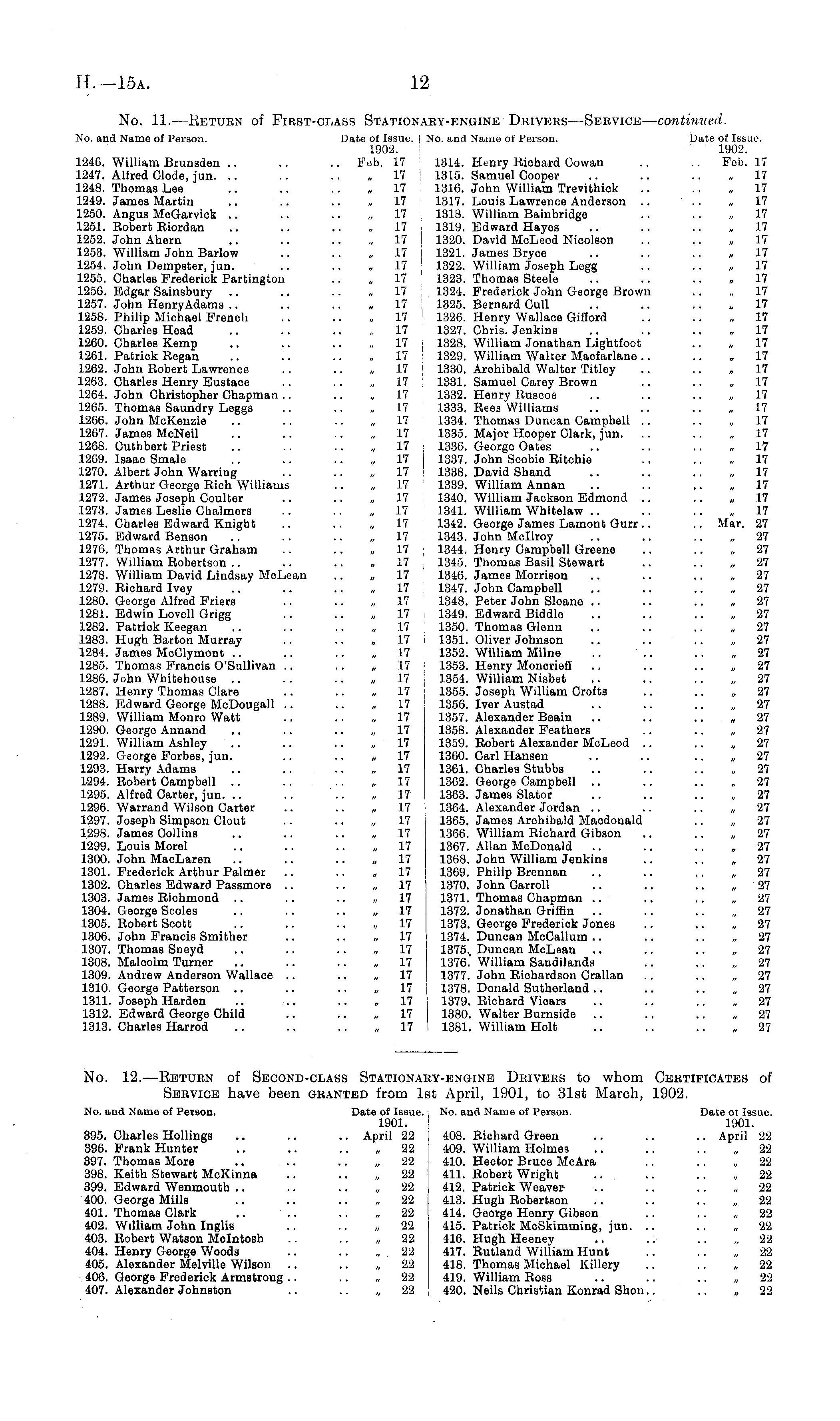 No. 12.—Return of Second-class Stationaky-bngine Drivers to whom Certificates of Service have been granted from Ist April, 1901, to 31st March, 1902.