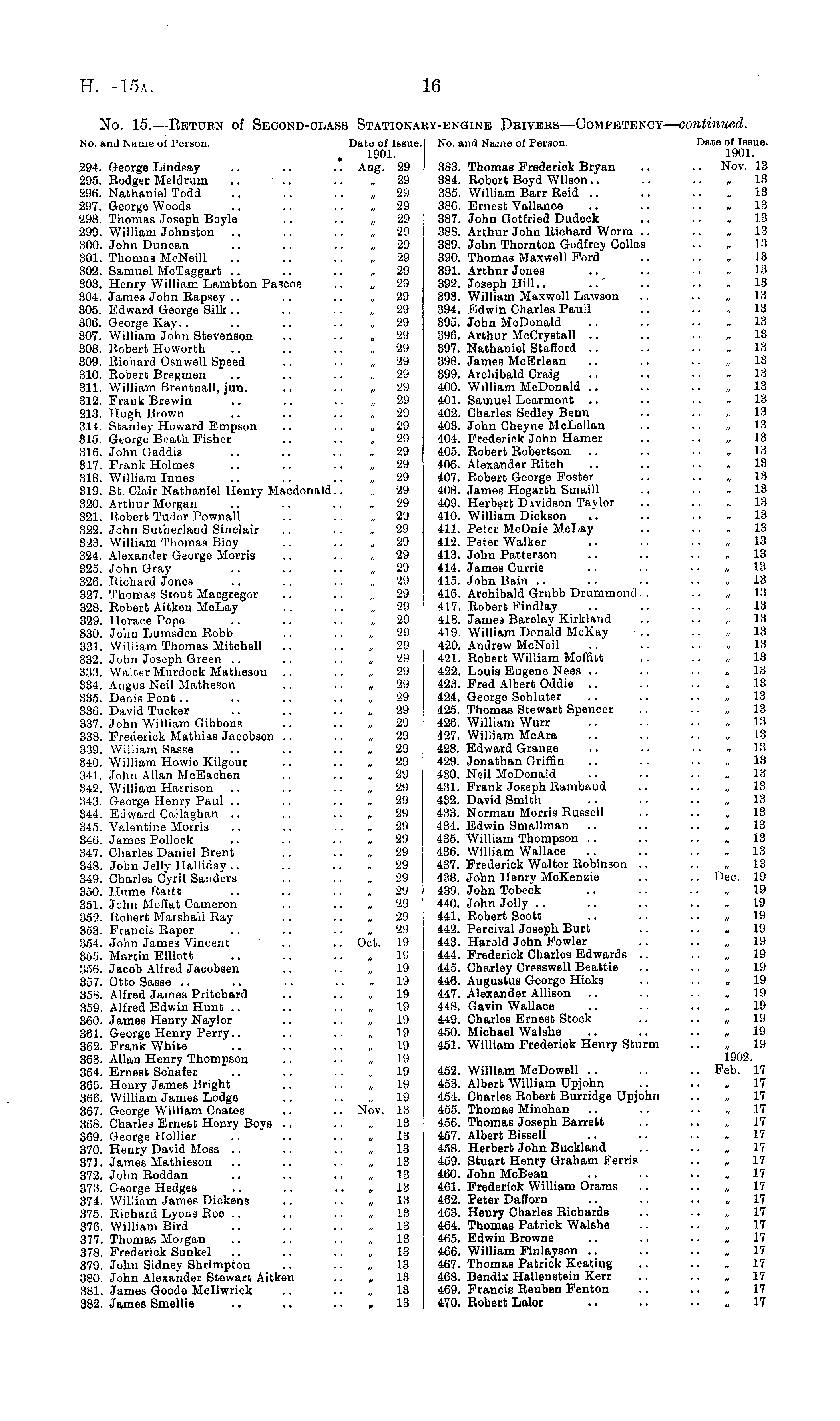 No. a,nd Name of Person. Date of Issue. . 1901. 294. George Lindsay .. .. .. Aug. 29 295. Rodger Meldrum .. .. .. ~29 296. Nathaniel Todd .. .. .. ~29 297. George Woods .. .. .. ~29 298. Thomas Joseph Boyle .. .. ~29 299. William Johnston .. .. .. ~29 300. John Duncan .. .. .. ~29 301. Thomas McNeill .. .. .. ~29 302. Samuel McTaggart .. .. .. ~29 303. Henry William Lambton Pascoe .. „ 29 304. James John Rapsey .. .. .. ~29 305. Edward George Silk .. .. .. ~29 306. George Kay.. .. .. .. ~29 307. William John Stevenson .. .. ~29 308. Robert Howorth .. .. .. ~29 309. Richard Osnwell Speed .. .. ~29 310. Robert Bregmen .. .. .. ~29 311. William Brentnall, jun. .. .. 29 312. Frank Brewin .. .. .. ~29 213. Hugh Brown .. .. .. ~29 314. Stanley Howard Empson .. .. ~29 315. George Beath Fisher .. .. ~29 316. John Gaddis .. .. .. ~29 317. Frank Holmes .. .. .. ~29 318. William Innes .. .. .. ~29 319. St. Clair Nathaniel Henry Macdonald.. „ 29 320. Arthur Morgan .. .. .. ~29 321. Robert Tudor Pownall .. .. ~29 322. John Sutherland Sinclair .. .. ~29 323. William Thomas Bloy .. .. ~29 324. Alexander George Morris .. .. ~29 325. John Gray .. .. .. ~29 326. Richard Jones .. .. .. ~29 327. Thomas Stout Macgregor .. .. ~29 328. Robert Aitken McLay .. .. ~29 329. Horace Pope .. .. .. ~29 330. John Lumsden Robb .. .. „ 29 331. William Thomas Mitchell .. .. „ 29 332. John Joseph Green .. .. .. „ 29 333. Walter Mnrdook Matheson .. .. „ 29 334. Angus Neil Matheson .. .. „ 29 335. Denis Pont.. .. .. 29 336. David Tucker .. .. .. „ 29 337. John William Gibbons .. .. „ 29 338. Frederick Mathias Jaeobsen .. .. ~29 339. William Sasse .. .. .. ~29 340. William Howie Kilgour .. .. „ 29 341. J.hn Allan McEachen .. .. „ 29 342. William Harrison .. .. 29 343. George Henry Paul .. .. 29 344. Edward Callaghan .. .. .. „ 29 345. Valentine Morris .. .. 29 346. James Pollock .. .. .. ~29 347. Charles Daniel Brent .. .. „ 29 348. John Jelly Halliday.. .. .. „ 29 349. Charles Cyril Sanders .. .. „ 29 350. Hume Raitt .. .. .. „ 29 351. John Moffat Cameron .. .. „ 29 352. Robert Marshall Ray .. .. „ 29 353. Francis Raper .. .. .. „ 29 354. John James Vincent .. .. Oct. 19 355. Martin Elliott .. .. .. „ 19 356. Jacob Alfred Jaeobsen .. .. „ 19 357. Otto Sasse .. .. .. 19 358. Alfred James Pritchard .. .. „ 19 359. Alfred Edwin Hunt .. .. .. „ 19 360. James Henry Naylor .. .. „ 19 361. George Henry Perry.. .. .. „ 19 362. Frank White .. .. .. „ 19 363. Allan Henry Thompson .. .. „ 19 364. Ernest Schafer .. .. .. „ 19 365. Henry James Bright .. .. „ 19 366. William James Lodge .. .. „ 19 367. George William Coates .. .. Nov. 13 368. Charles Ernest Henry Boys .. .. „ 13 369. George Hollier .. .. .. „ 13 370. Henry David Moss .. .. .. „ 13 371. James Mathieson .. .. .. „ 13 372. John Roddan .. .. .. „ 13 373. George Hedges .. .. .. „ 13 374. William James Dickens .. .. „ 13 375. Richard Lyons Roe .. .. .. „ 13 376. William Bird .. .. 13 377. Thomas Morgan .. .. .. „ 13 378. Frederick Sunkel .. .. .. „ 13 379. John Sidney Shrimpton .. .. . „ 13 380. John Alexander Stewart Aitken .. „ 13 381. James Goode Mcllwrick .. .. „ 13 382. James Smellie .. .. .. . 13