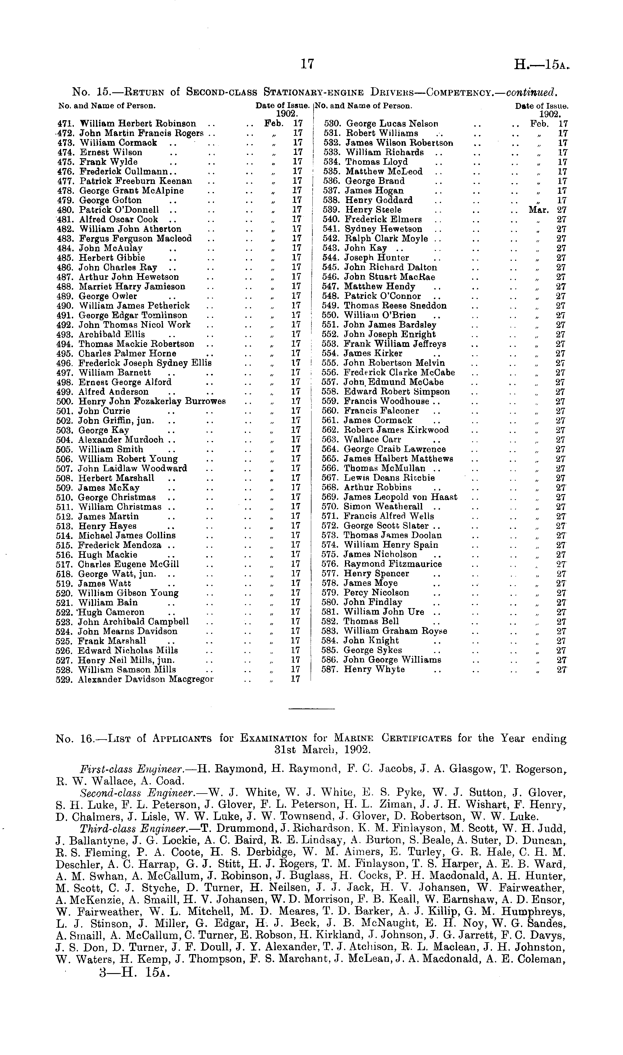 No. 15. —Beturn of Second-class Stationary-engine Drivers—Competency.— continued.