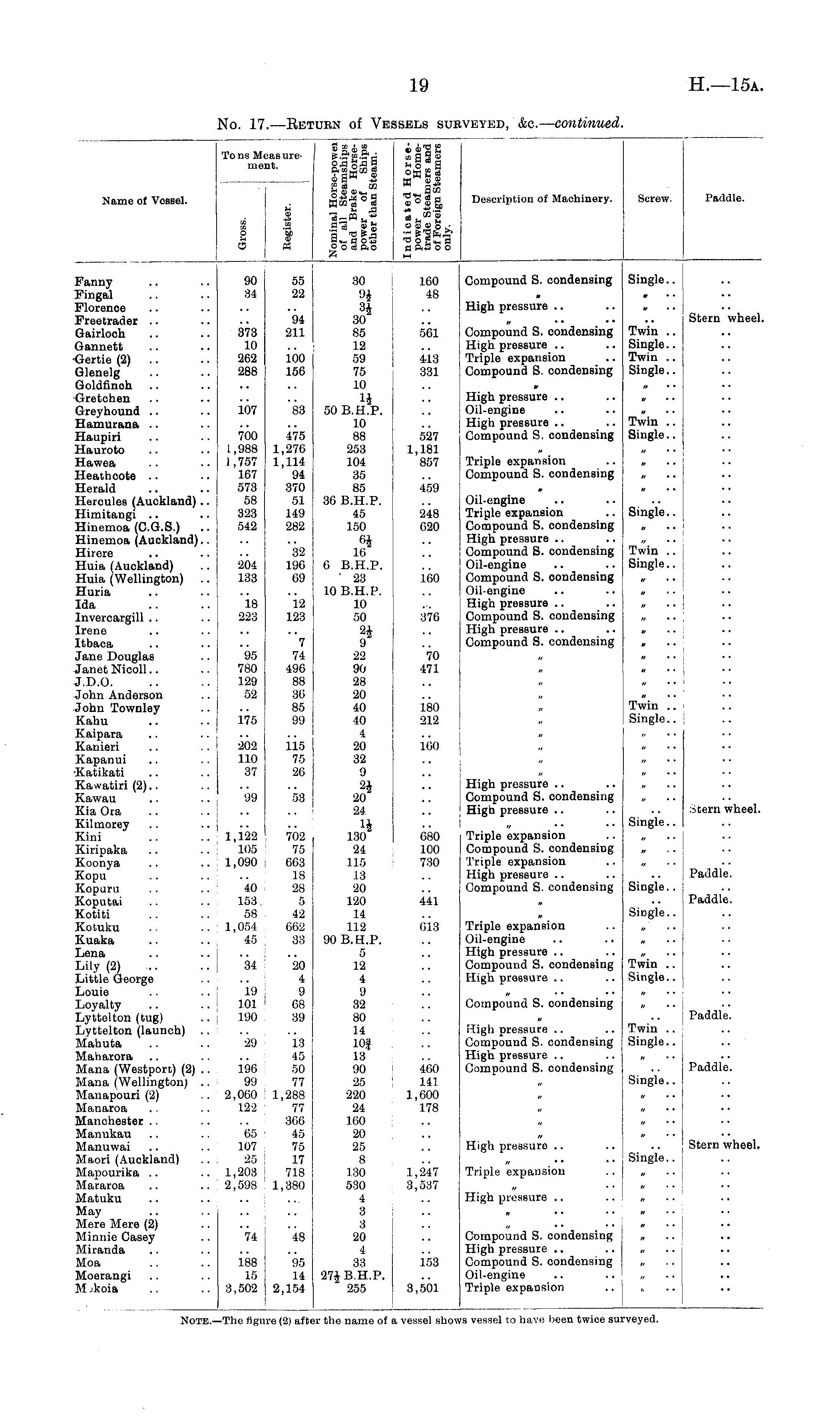 Name of Vessel. Tons Measurement. i .1 g 8f 3 S i g. o .a it ,a a ft»,2cc =« iS K £ S° <8 CC r< oi 0J.M _ - I 5 „_ a oi o o d ao "Sal e i s § B 2-8 o * a 4» H.« r, C/J 01 * r, U o8»oc •- I'ShA' •o o r =r. a a p.w o o Description of Machinery. Screw. Paddle. in o I Fanny .. .. 90 55 Fingal .. .. 34 22 Florence Freetrader .. .. .. 94 Gairlooh .. .. 373 211 Gannett .. .. 10 ■Gertie (2) .. .. 262 100 Glenelg .. .. 288 156 Goldfinoh Gretchen Greyhound .. .. 107 83 Hamurana Haupiri .. .. 700 475 Hauroto .. .. L.988 1,276 Hawea .. .. 1,757 1,114 Heathcote .. .. 167 94 Herald .. .. 573 370 Hercules (Auckland) .. ! 58 51 Himitangi .. .. 323 149 Hinemoa (C.G.S.) .. | 542 282 Hinemoa (Auckland) Hirere .. .. .. 32 Huia (Auckland) .. 204 196 Huia (Wellington) .. 133 69 Huria Ida .. .. 18 12 Invercargill .. .. 223 123 Irene Itbaca .. .. .. 7 Jane Douglas .. 95 74 Janet Nicoll.. .. 780 496 J.D.O. .. .. 129 88 John Anderson .. 52 36 John Townley .. .. 85 Kahu .. .. 175 99 Kaipara Kanieri .. .. 202 115 Kapanui .. .. 110 75 ■Katikati .. .. 37 26 Kawatiri (2).. Kawau .. .. 99 53 Kia Ora Kilmorey Kini .. .. 1,122 702 Kiripaka .. .. 105 75 Koonya .. .. 1,090 I 663 Kopu .. .. .. 18 Kopuru .. .. 40 28 Koputai .. .. 153. 5 Kotiti .. .. 58 42 Kotuku .. ..1,064 662 Kuaka .. .. 45 33 Lena Lily (2) .. .. 34 20 Little George .. .. 4 Louie .. .. 19 9 Loyalty .. .. 101 ' 08 Lyttelton (tug) .. i 190 39 Lyttelton (launch) Mahuta .. .. 29 13 Maharora .. .. .. 45 Mana (Westport) (2) .. 196 50 Mana (Wellington) .. 99 77 Mauapouri (2) .. 2,060 11,288 Manaroa .. .. 122 77 Manchester .. .. .. 366 Manukau .. .. 65 45 Manuwai .. .. 107 75 Maori (Auckland) .. 25 17 Mapourika .. .. 1,203 718 Mararoa .. .. 2,598 ! 1,380 Matuku May Mere Mere (2) Minnie Casey .. 74 48 Miranda Moa .. .. 188 95 Moerangi .. .. 15 14 Mikoia .. .. 3,502 2,154 30 160 9J 48 3J 30 85 561 12 59 413 75 331 10 1* 50B.H.P. 10 88 527 253 ; 1,181 104 857 35 85 459 30 B.H.P. 45 248 150 620 16 6 B.H.P. • 23 160 10 B.H.P. 10 50 376 2* 9 22 70 90 471 28 20 40 180 40 212 4 20 160 32 9 2J 20 24 1* 130 680 24 100 115 730 13 20 120 441 14 112 613 90 B.H.P. 5 12 4 9 32 80 14 10} 13 90 460 25 141 220 1,600 24 178 160 20 25 8 130 1,247 530 3,537 4 3 3 20 4 33 153 27* B.H.P. 255 3,501 Compound S. condensing Single.. High pressure Stern wheel, Compound S. condensing High pressure Triple expansion Compound S. condensing Twin .. Single.. Twin .. Single.. High pressure Oil-engine High pressure Compound S. condensing Twin .. Single.. Triple expansion Compound S. condensing Oil-engine Triple expansion Compound S. condensing High pressure Compound S. condensing Oil-engine Compound S. condensing Oil-engine High pressure Compound S. condensing High pressure Compound S. condensing Single.. Twin .. Single.. u . • Twin .. Single.. High pressure Compound S. condensing High pressure Stern wheel. Single.. Triple expansion Compound S. condensing Triple expansion High pressure Compound S. condensing Paddle. Single.. Paddle. Triple expansion Oil-engine High pressure Compound S. condensing High pressure Single.. Twin .. Single.. Compound S. condensing Paddle. High pressure Compound S. condensing High pressure Compound S. condensing Twin .. Single.. Paddle. Single.. High pressure Stern wheel. Single.. Triple expansion High pressure Compound S. condensing High pressure Compound S. condensing Oil-engine Triple expansion Note.—The figure (2) aft* si' the name of a vessel shows vessel to have been twice surveyed.