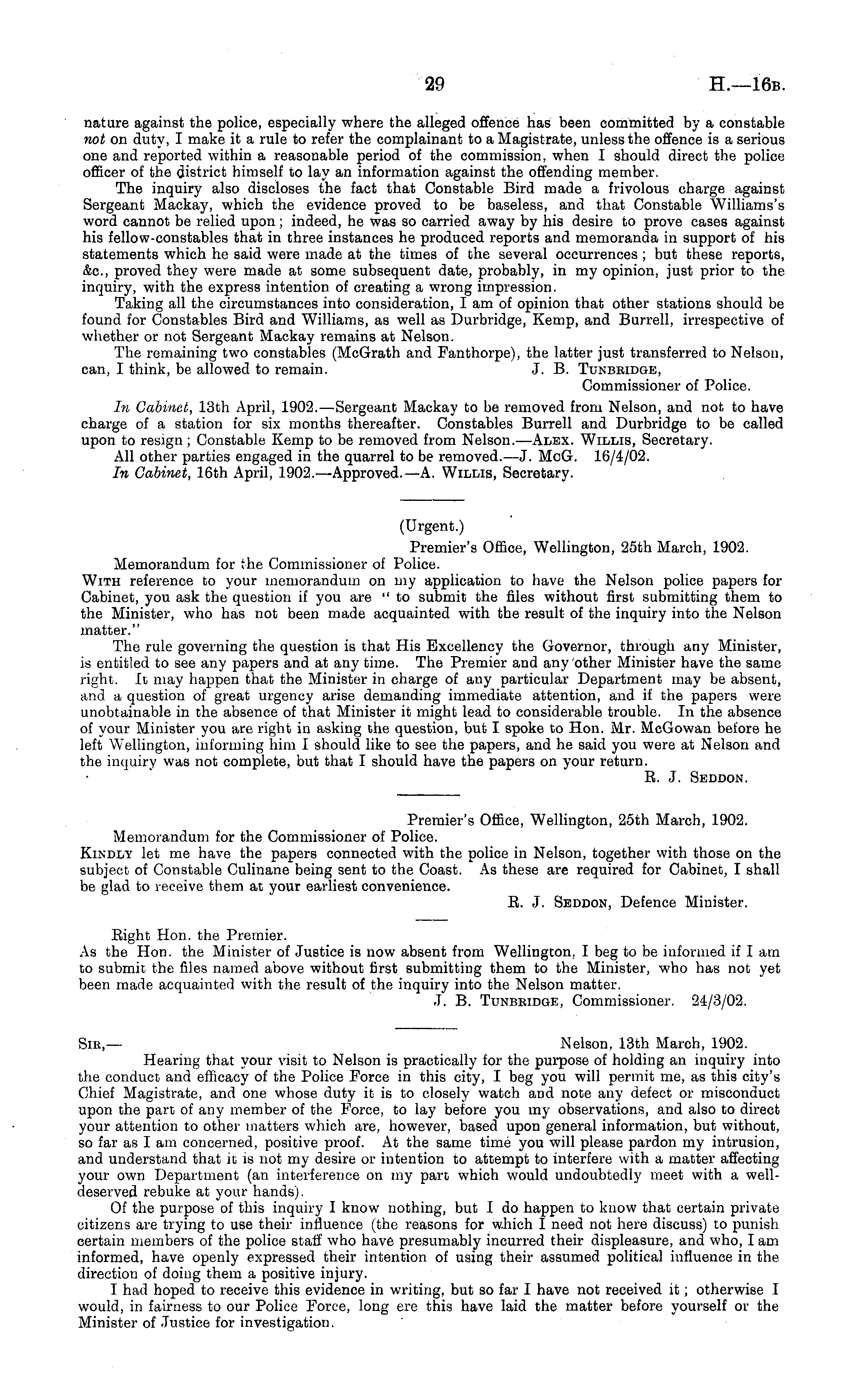 nature against the police, especially where the alleged offence has been committed by a constable not on duty, I make it a rule to refer the complainant to a Magistrate, unless the offence is a serious one and reported within a reasonable period of the commission, when I should direct the police officer of the district himself to lay an information against the offending member. The inquiry also discloses the fact that Constable Bird made a frivolous charge against Sergeant Mackay, which the evidence proved to be baseless, and that Constable Williams's word cannot be relied upon; indeed, he was so carried away by his desire to prove eases against his fellow-constables that in three instances he produced reports and memoranda in support of his statements which he said were made at the times of the several occurrences ; but these reports, &c, proved they were made at some subsequent date, probably, in my opinion, just prior to the inquiry, with the express intention of creating a wrong impression. Taking all the circumstances into consideration, I am of opinion that other stations should be found for Constables Bird and Williams, as well as Durbridge, Kemp, and Burrell, irrespective of whether or not Sergeant Mackay remains at Nelson. The remaining two constables (McGrath and Fanthorpe), the latter just transferred to Nelson, can, I think, be allowed to remain. J. B. Tunbridge, Commissioner of Police. In Cabinet, 13th April, 1902.—Sergeant Mackay to be removed from Nelson, and not to have charge of a station for six months thereafter. Constables Burrell and Durbridge to be called upon to resign; Constable Kemp to be removed from Nelson.—Alex. Willis, Secretary. All other parties engaged in the quarrel to be removed.—J. McG. 16/4/02. In Cabinet, 16th April, 1902.—Approved.—A. Willis, Secretary.