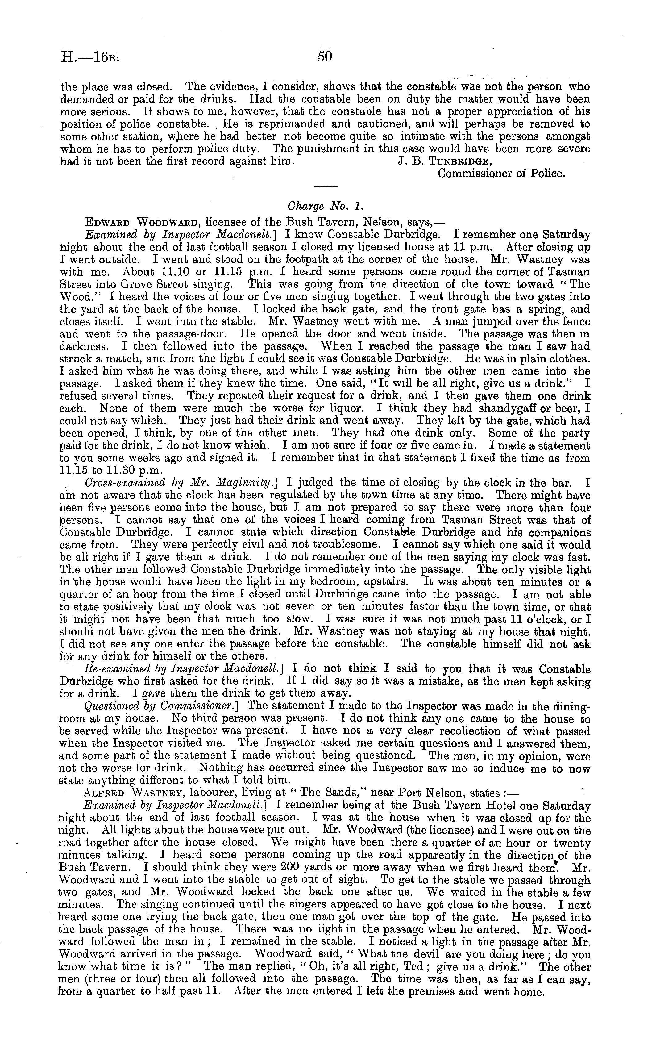 Charge No. 1. Edward Woodward, licensee of the Bush Tavern, Nelson, says,— Examined by Inspector Macdonell.] I know Constable Durbridge. I remember one Saturday night about the end of last football season I closed my licensed house at 11 p.m. After closing up I went outside. I went and stood on the footpath at the corner of the house. Mr. Wastney was with me. About 11.10 or 11.15 p.m. I heard some persons come round the corner of Tasman Street into Grove Street singing. This was going from the direction of the town toward " The Wood." I heard the voices of four or five men singing together. I went through the two gates into the yard at the back of the house. I locked the back gate, and the front gate has a spring, and closes itself. I went into the stable. Mr. Wastney went with me. A man jumped over the fence and went to the passage-door. He opened the door and went inside. The passage was then in darkness. I then followed into the passage. When I reached the passage the man I saw had struck a match, and from the light I could see it was Constable Durbridge. He was in plain clothes. I asked him what he was doing there, and while I was asking him the other men came into the passage. I asked them if they knew the time. One said, "It will be all right, give us a drink." I refused several times. They repeated their request for a drink, and I then gave them one drink each. None of them were much the worse for liquor. I think they had shandygaff or beer, I could not say which. They just had their drink and went away. They left by the gate, which had been opened, I think, by one of the other men. They had one drink only. Some of the party paid for the drink, Ido not know which. lam not sure if four or five came in. I made a statement to you some weeks ago and signed it. I remember that in that statement I fixed the time as from 11.15 to 11.30 p.m. Cross-examined by Mr. Maginnity.] I judged the time of closing by the clock in the bar. I am not aware that the clock has been regulated by the town time at any time. There might have been five persons come into the house, but I am not prepared to say there were more than four persons. I cannot say that one of the voices I heard coming from Tasman Street was that of Constable Durbridge. I cannot state which direction Constable Durbridge and his companions came from. They were perfectly civil and not troublesome. I cannot say which one said it would be all right if I gave them a drink. Ido not remember one of the men saying my clock was fast. The other men followed Constable Durbridge immediately into the passage. The only visible light in 'the house would have been the light in my bedroom, upstairs. It was about ten minutes or a quarter of an hour from the time I closed until Durbridge came into the passage. I am not able to state positively that my clock was not seven or ten minutes faster than the town time, or that it might not have been that much too slow. I was sure it was not much past 11 o'clock, or I should not have given the men the drink. Mr. Wastney was not staying at my house that night. I did not see any one enter the passage before the constable. The constable himself did not ask for any drink for himself or the others. Be-examined by Inspector Macdonell.] I do not think I said to you that it was Constable Durbridge who first asked for the drink. If I did say so it was a mistake, as the men kept asking for a drink. I gave them the drink to get them away. Questioned by Commissioner.] The statement I made to the Inspector was made in the diningroom at my house. No third person was present. Ido not think any one came to the house to be served while the Inspector was present. I have not a very clear recollection of what passed when the Inspector visited me. The Inspector asked me certain questions and I answered them, and some part of the statement I made without being questioned. The men, in my opinion, were not the worse for drink. Nothing has occurred since the Inspector saw me to induce me to now state anything different to what I told him. Alfred Wastney, labourer, living at " The Sands," near Port Nelson, states :— Examined by Inspector Macdonell.] I remember being at the Bush Tavern Hotel one Saturday night about the end of last football season. I was at the house when it was closed up for the night. All lights about the house were put out. Mr. Woodward (the licensee) and I were out on the road together after the house closed. We might have been there a quarter of an hour or twenty minutes talking. I heard some persons coming up the road apparently in the direction of the Bush Tavern. I should think they were 200 yards or more away when we first heard them* Mr. Woodward and I went into the stable to get out of sight. To get to the stable we passed through two gates, and Mr. Woodward locked the back one after us. We waited in the stable a few minutes. The singing continued until the singers appeared to have got close to the house. I next heard some one trying the back gate, then one man got over the top of the gate. He passed into the back passage of the house. There was no light in the passage when he entered. Mr. Woodward followed the man in ; I remained in the stable. I noticed a light in the passage after Mr. Woodward arrived in the passage. Woodward said, " What the devil are you doing here ;do you know what time it is ? " The man replied, " Oh, it's all right, Ted ; give us a drink." The other men (three or four) then all followed into the passage. The time was then, as far as I can say, from- a quarter to half past 11. After the men entered I left the premises and went home.