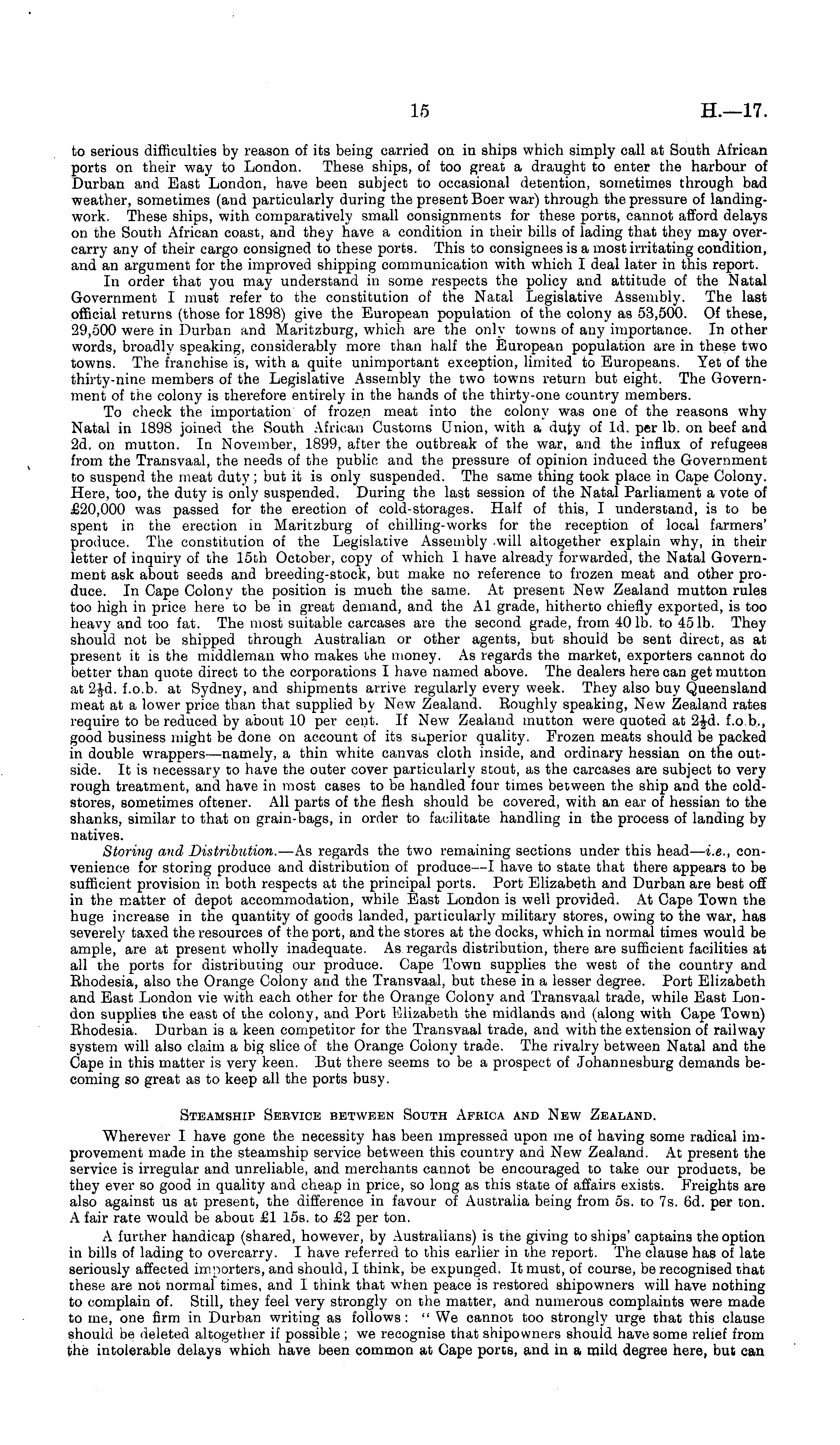 to serious difficulties by reason of its being carried on in ships which simply call at South African ports on their way to London. These ships, of too great a draught to enter the harbour of Durban and East London, have been subject to occasional detention, sometimes through bad weather, sometimes (and particularly during the present Boer war) through the pressure of landingwork. These ships, with comparatively small consignments for these ports, cannot afford delays on the South African coast, and they have a condition in their bills of lading that they may overcarry any of their cargo consigned to these ports. This to consignees is a most irritating condition, and an argument for the improved shipping communication with which I deal later in this report. In order that you may understand in some respects the policy and attitude of the Natal Government I must refer to the constitution of the Natal Legislative Assembly. The last official returns (those for 1898) give the European population of the colony as 53,500. Of these, 29,500 were in Durban and Maritzburg, which are the only towns of any importance. In other words, broadly speaking, considerably more than half the European population are in these two towns. The franchise is, with a quite unimportant exception, limited to Europeans. Yet of the thirty-nine members of the Legislative Assembly the two towns return but eight. The Government of the colony is therefore entirely in the hands of the thirty-one country members. To check the importation of frozen meat into the colony was one of the reasons why Natal in 1898 joined the South African Customs Union, with a duty of Id. per lb. on beef and 2d. on mutton. In November, 1899, after the outbreak of the war, and the influx of refugees from the Transvaal, the needs of the public and the pressure of opinion induced the Government to suspend the meat duty; but it is only suspended. The same thing took place in Cape Colony. Here, too, the duty is only suspended. During the last session of the Natal Parliament a vote of £20,000 was passed for the erection of cold-storages. Half of this, I understand, is to be spent in the erection in Maritzburg of chilling-works for the reception of local farmers' produce. The constitution of the Legislative Assembly .will altogether explain why, in their letter of inquiry of the 15th October, copy of which I have already forwarded, the Natal Government ask about seeds and breeding-stock, but make no reference to frozen meat and other produce. In Cape Colony the position is much the same. At present New Zealand mutton rules too high in price here to be in great demand, and the Al grade, hitherto chiefly exported, is too heavy and too fat. The most suitable carcases are the second grade, from 40 lb. to 45 lb. They should not be shipped through Australian or other agents, but should be sent direct, as at present it is the middleman who makes the money. As regards the market, exporters cannot do better than quote direct to the corporations I have named above. The dealers here can get mutton at f.o.b. at Sydney, and shipments arrive regularly every week. They also buy Queensland meat at a lower price than that supplied by New Zealand. Eoughly speaking, New Zealand rates require to be reduced by about 10 per cent. If New Zealand mutton were quoted at 2£d. f.0.b., good business might be done on account of its Superior quality. Frozen meats should be packed in double wrappers—namely, a thin white canvas cloth inside, and ordinary hessian on the outside. It is necessary to have the outer cover particularly stout, as the carcases are subject to very rough treatment, and have in most cases to be handled four times between the ship and the coldstores, sometimes oftener. All parts of the flesh should be covered, with an ear of hessian to the shanks, similar to that on grain-bags, in order to facilitate handling in the process of landing by natives. Storing and Distribution. —As regards the two remaining sections under this head— i.e., convenience for storing produce and distribution of produce—l have to state that there appears to be sufficient provision in both respects at the principal ports. Port Elizabeth and Durban are best off in the matter of depot accommodation, while East London is well provided. At Cape Town the huge increase in the quantity of goods landed, particularly military stores, owing to the war, has severely taxed the resources of the port, and the stores at the docks, which in normal times would be ample, are at present wholly inadequate. As regards distribution, there are sufficient facilities at all the ports for distributing our produce. Cape Town supplies the west of the country and Bhodesia, also the Orange Colony and the Transvaal, but these in a lesser degree. Port Elizabeth and East London vie with each other for the Orange Colony and Transvaal trade, while East London supplies the east of the colony, and Port Elizabeth the midlands and (along with Cape Town) Ehodesia. Durban is a keen competitor for the Transvaal trade, and with the extension of railway system will also claim a big slice of the Orange Colony trade. The rivalry between Natal and the Cape in this matter is very keen. But there seems to be a prospect of Johannesburg demands becoming so great as to keep all the ports busy. Steamship Service between South Africa and New Zealand. Wherever I have gone the necessity has been impressed upon me of having some radical improvement made in the steamship service between this country and New Zealand. At present the service is irregular and unreliable, and merchants cannot be encouraged to take our products, be they ever so good in quality and cheap in price, so long as this state of affairs exists. Freights are also against us at present, the difference in favour of Australia being from ss. to 7s. 6d. per ton. A fair rate would be about £1 15s. to £2 per ton. A further handicap (shared, however, by Australians) is the giving 