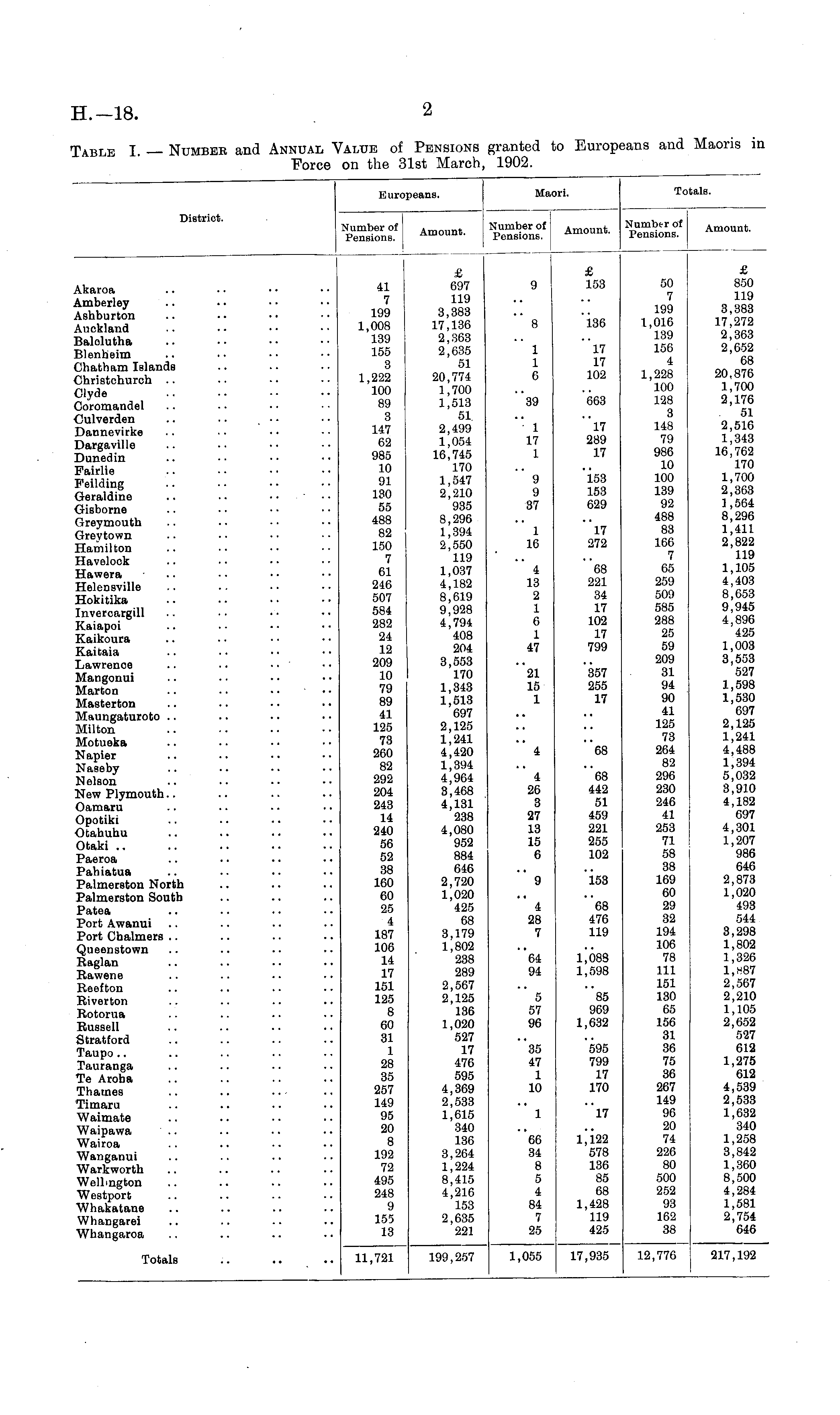 Table I.—Number and Annual Value of Pensions granted to Europeans and Maoris in Force on the 31st March, 1902.