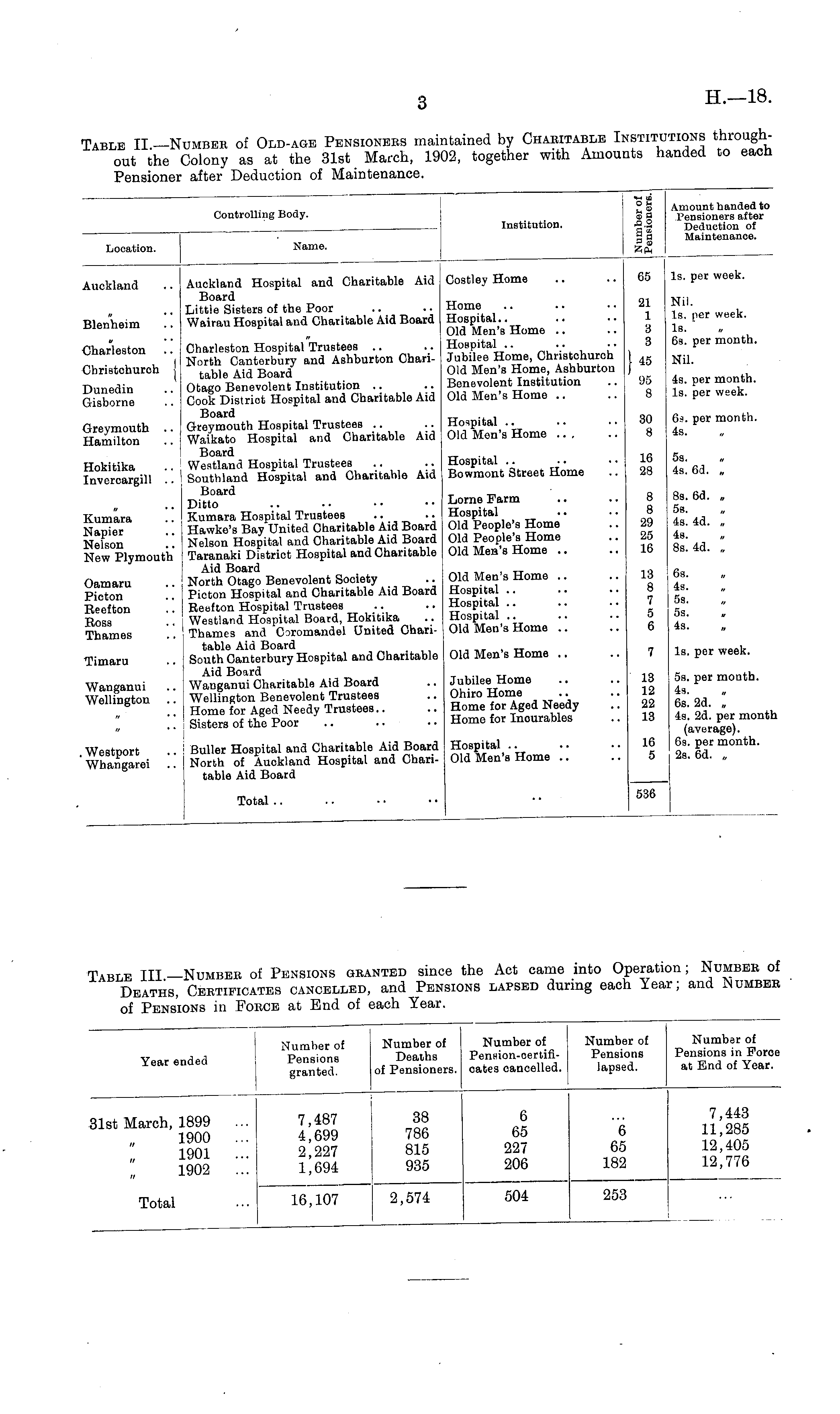 Table II.—Number of Old-age Pensioners maintained by Charitable Institutions throughout the Colony as at the 31st March, 1902, together with Amounts handed to each Pensioner after Deduction of Maintenance.