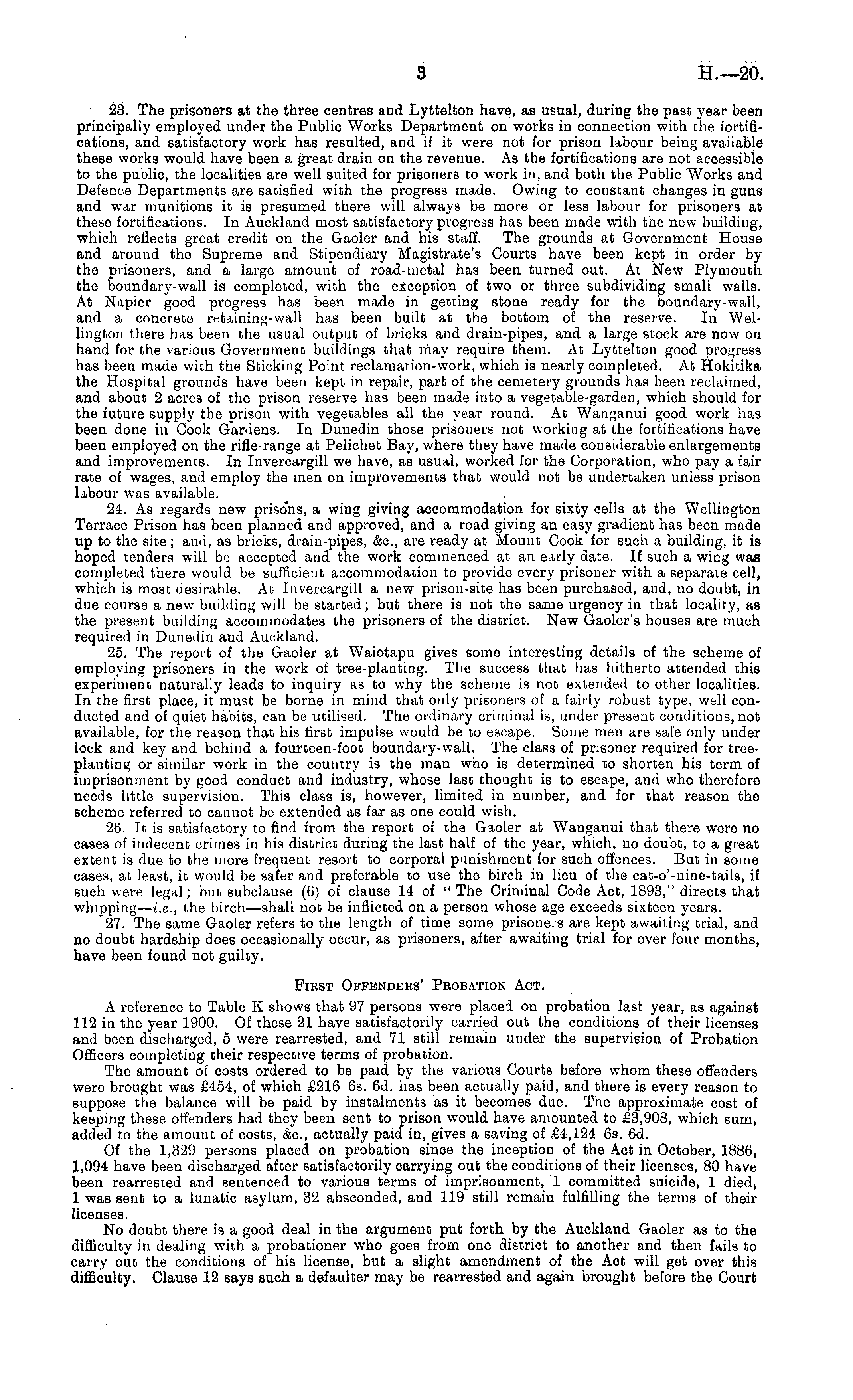 23. The prisoners at the three centres and Lyttelton have, as usual, during the past year been principally employed under the Public Works Department on works in connection with the fortifications, and satisfactory work has resulted, and if it were not for prison labour being available these works would have been a great drain on the revenue. As the fortifications are not accessible to the public, the localities are well suited for prisoners to work in, and both the Public Works and Defence Departments are satisfied with the progress made. Owing to constant changes in guns and war munitions it is presumed there will always be more or less labour for prisoners at these fortifications. In Auckland most satisfactory progress has been made with the new building, which reflects great credit on the Gaoler and his staff. The grounds at Government House and around the Supreme and Stipendiary Magistrate's Courts have been kept in order by the prisoners, and a large amount of road-metal has been turned out. At New Plymouth the boundary-wall is completed, with the exception of two or three subdividing small walls. At Napier good progress has been made in getting stone ready for the boundary-wall, and a concrete has been built at the bottom of the reserve. In Wellington there has been the usual output of bricks and drain-pipes, and a large stock are now on hand for the various Government buildings that may require them. At Lyttelton good progress has been made with the Sticking Point reclamation-work, which is nearly completed. At Hokitika the Hospital grounds have been kept in repair, part of the cemetery grounds has been reclaimed, and about 2 acres of the prison reserve has been made into a vegetable-garden, which should for the future supply the prison with vegetables all the year round. At Wanganui good work has been done in Cook Gardens. In Dunedin those prisoners not working at the fortifications have been employed on the rifle-range at Pelichet Bay, where they have made considerable enlargements and improvements. In Invercargill we have, as usual, worked for the Corporation, who pay a fair rate of wages, and employ the men on improvements that would not be undertaken unless prison labour was available. 24. As regards new prisons, a wing giving accommodation for sixty cells at the Wellington Terrace Prison has been planned and approved, and a road giving an easy gradient has been made up to the site; and, as bricks, drain-pipes, &c, are ready at Mount Cook for such a building, it is hoped tenders will be accepted and the work commenced at an early date. If such a wing was completed there would be sufficient accommodation to provide every prisoner with a separate cell, which is most desirable. At Invercargill a new prison-site has been purchased, and, no doubt, in due course a new building will be started; but there is not the same urgency in that locality, as the present building accommodates the prisoners of the district. New Gaoler's houses are much required in Dunedin and Auckland. 25. The report of the Gaoler at Waiotapu gives some interesting details of the scheme of employing prisoners in the work of tree-planting. The success that has hitherto attended this experiment naturally leads to inquiry as to why the scheme is not extended to other localities. In the first place, it must be borne in mind that only prisoners of a fairly robust type, well conducted and of quiet habits, can be utilised. The ordinary criminal is, under present conditions, not available, for the reason that his first impulse would be to escape. Some men are safe only under lock and key and behind a fourteen-foot boundary-wall. The class of prisoner required for treeplanting or similar work in the country is the man who is determined to shorten his term of imprisonment by good conduct and industry, whose last thought is to escape, and who therefore needs little supervision. This class is, however, limited in number, and for ihat reason the scheme referred to cannot be extended as far as one could wish. 26. It is satisfactory to find from the report of the Gaoler at Wanganui that there were no cases of indecent crimes in his district during the last half of the year, which, no doubt, to a great extent is due to the more frequent resort to corporal punishment for such offences. But in some cases, at least, it would be safer and preferable to use the birch in lieu of the cat-o'-nine-tails, if such were legal; but subclause (6) of clause 14 of "The Criminal Code Act, 1893," directs that whipping— i.e., the birch —shall not be inflicted on a person whose age exceeds sixteen years. 27. The same Gaoler refers to the length of time some prisoners are kept awaiting trial, and no doubt hardship does occasionally occur, as prisoners, after awaiting trial for over four months, have been found not guilty. First Offenders' Probation Act. A reference to Table X shows that 97 persons were placed on probation last year, as against 112 in the year 1900. Of these 21 have satisfactorily carried out the conditions of their licenses and been discharged, 5 were rearrested, and 71 still remain under the supervision of Probation Officers completing their respective terms of probation. The amount of costs ordered to be paid by the various Courts before whom these offenders were brought was £454, of which £216 6s. 6d. has been actually paid, and there is every reason to suppose the balance will be paid by instalments as it becomes due. The approximate cost of keeping these offenders had they been sent to prison would have amounted to £3,908, which sum, added to the amount of costs, &c, actually paid in, gives a saving of £4,124 6s. 6d. Of the 1,329 persons placed on probation since the inception of the Act in October, 1886, 1,094 have been discharged after satisfactorily carrying out the conditions of their licenses, 80 have been rearrested and sentenced to various terms of imprisonment, 1 committed suicide, 1 died, 1 was sent to a lun