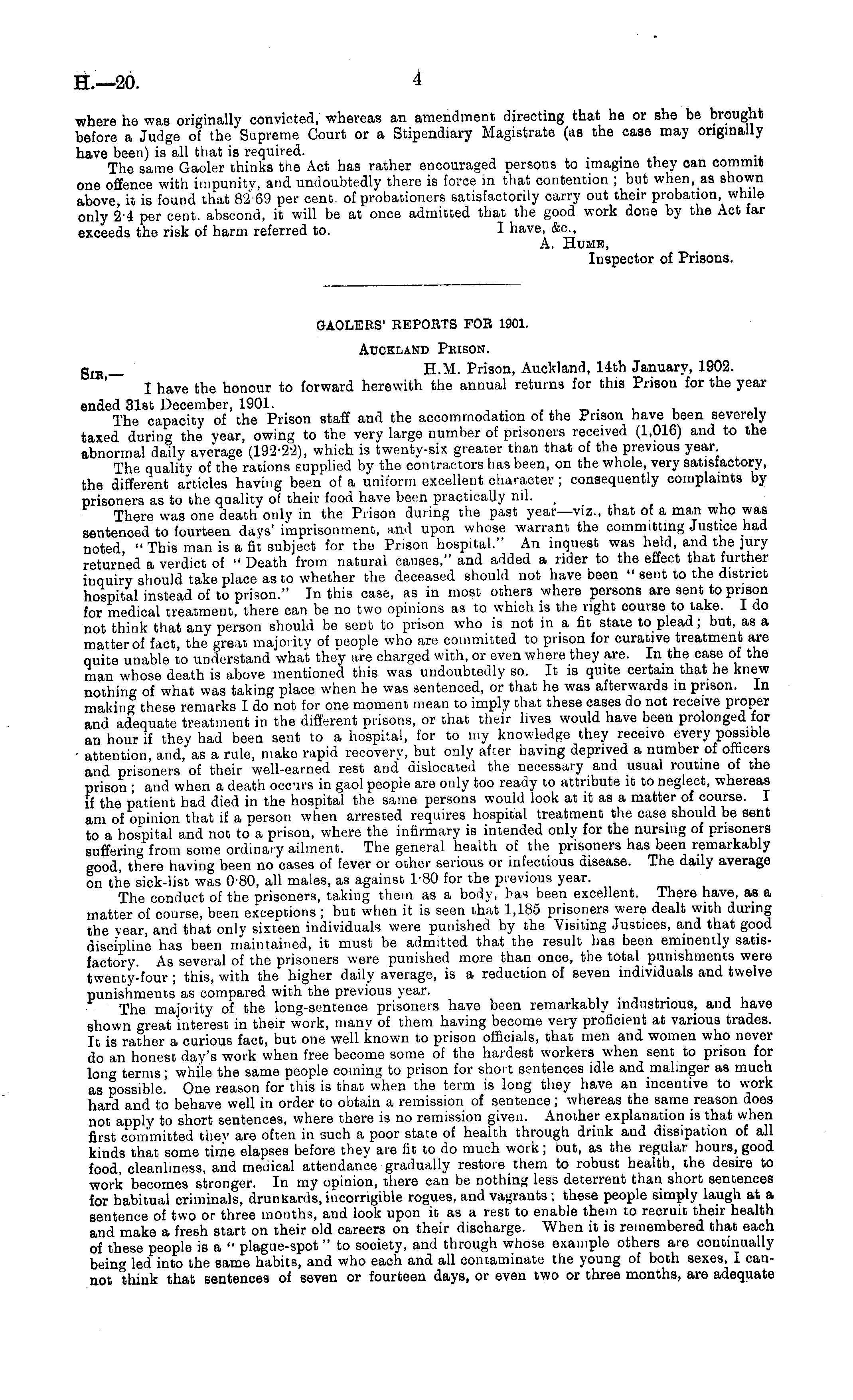 GAOLERS' REPORTS FOR 1901. Auckland Prison. g IE _ H.M. Prison, Auckland, 14th January, 1902. I have the honour to forward herewith the annual returns for this Prison for the year ended 31st December, 1901. _. , , , The capacity of the Prison staff and the accommodation of the Prison have been severely taxed during the year, owing to the very large number of prisoners received (1,016) and to the abnormal daily average (192-22), which is twenty-six greater than that of the previous year The quali'tv of the rations supplied by the contractors has been, on the whole, very satisfactory, the different articles having been of a uniform excellent character ; consequently complaints by prisoners as to the quality of their food have been practically nil. . There was one death only in the Prison during the past year—viz., that of a man who was sentenced to fourteen days' imprisonment, and upon whose warrant the committing Justice had noted " This man is a fit subject for the Prison hospital." An inquest was held, and the ]ury returned a verdict of " Death from natural causes," and added a rider to the effect that further inquiry should take place as to whether the deceased should not have been " sent to the district hospital instead of to prison." In this case, as in most others where persons are sent to prison for medical treatment, there can be no two opinions as to which is the right course to take. Ido not think that any person should be sent to prison who is not in a fit state to plead; but, as a matter of fact, the great majority of people who are committed to prison for curative treatment are quite unable to understand what they are charged with, or even where they are. In the case of the man whose death is above mentioned this was undoubtedly so. It is quite certain that he knew nothing of what was taking place when he was sentenced, or that he was afterwards m prison. In making these remarks I do not for one moment mean to imply that these cases do not receive proper and adequate treatment in the different prisons, or that their lives would have been prolonged for an hour if they had been sent to a hospital, for to my knowledge they receive every possible ■ attention, and, as a rule, make rapid recovery, but only after having deprived a number of officers and prisoners of their well-earned rest and dislocated the necessary and usual routine of the prison ; and when a death occurs in gaol people are only too ready to attribute it to neglect, whereas if the patient had died in the hospital the same persons would look at it as a matter of course. I am of opinion that if a person when arrested requires hospital treatment the case should be sent to a hospital and not to a prison, where the infirmary is intended only for the nursing of prisoners suffering from some ordinary ailment. The general health of the prisoners has been remarkably good, there having been no cases of fever or other serious or infectious disease. The daily average on the sick-list was 0-80, all males, as against 1-80 for the previous year. The conduct of the prisoners, taking them as a body, has been excellent. There have, as a matter of course, been exceptions ; but when it is seen that 1,185 prisoners were dealt with during the year, and that only sixteen individuals were punished by the Visiting Justices, and that good discipline has been maintained, it must be admitted that the result has been eminently satisfactory. As several of the prisoners were punished more than once, the total punishments were twenty-four; this, with the higher daily average, is a reduction of seven individuals and twelve punishments as compared with the previous year. The majority of the long-sentence prisoners have been remarkably industrious, and have shown great interest in their work, many of them having become very proficient at various trades. It is rather a curious fact, but one well known to prison officials, that men and women who never do an honest day's work when free become some of the hardest workers when sent to prison for long terms; while the same people coming to prison for short sentences idle and malinger as much as possible.' One reason for "this is that when the term is long they have an incentive to work hard and to behave well in order to obtain a remission of sentence; whereas the same reason does not apply to short sentences, where there is no remission given. Another explanation is that when first committed they are often in such a poor state of health through drink and dissipation of all kinds that some time elapses before they are fit to do much work; but, as the regular hours, good food, cleanliness, and medical attendance gradually restore them to robust health, the desire to work becomes stronger. In my opinion, there can be nothing less deterrent than short sentences for habitual criminals, drunkards, incorrigible rogues, and vagrants ; these people simply laugh at a sentence of two or three months, and look upon it as a rest to enable them to recruit their health and make a fresh start on their old careers on their discharge. When it is remembered that each of these people is a " plague-spot " to society, and through whose example others are continually bein<* led into the same habits, and who each and all contaminate the young of both sexes, I cannot "think that sentences of seven or fourteen days, or even two or three months, are adequate