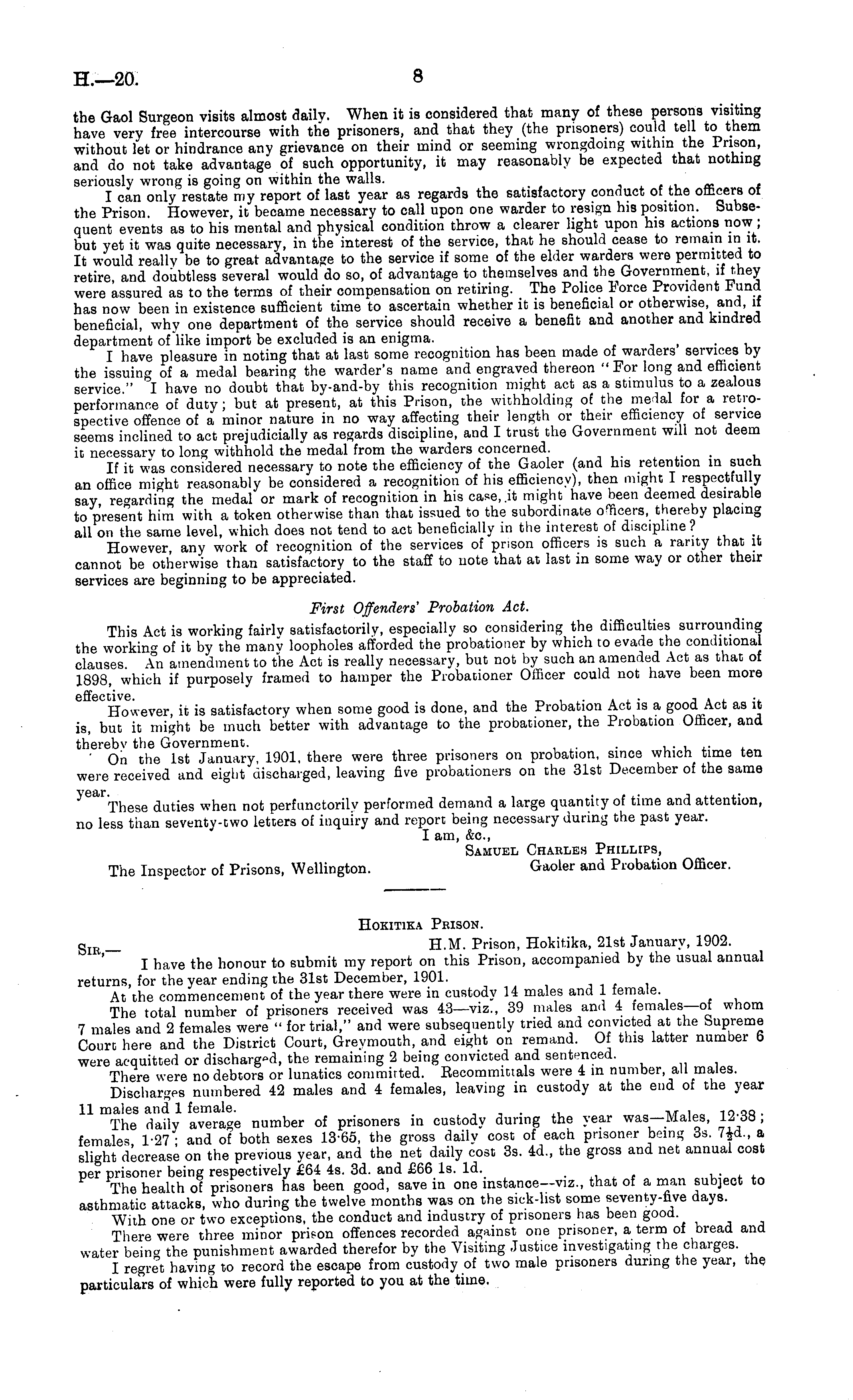 the Gaol Surgeon visits almost daily. When it is considered that many of these persons visiting have very free intercourse with the prisoners, and that they (the prisoners) could tell to them without let or hindrance any grievance on their mind or seeming wrongdoing within the Prison, and do not take advantage of such opportunity, it may reasonably be expected that nothing seriously wrong is going on within the walls. ~v ffi t I can only restate my report of last year as regards the satisfactory conduct of the officers of the Prison. However, it became necessary to call upon one warder to resign his position. Subsequent events as to his mental and physical condition throw a clearer light upon his actions now ; but yet it was quite necessary, in the"interest of the service, that he should cease to remain in it. It would really be to great advantage to the service if some of the elder warders were permitted to retire and doubtless several would do so, of advantage to themselves and the Government, "they were assured as to the terms of their compensation on retiring. The Police Force Provident Fund has now been in existence sufficient time to ascertain whether it is beneficial or otherwise and, if beneficial, why one department of the service should receive a benefit and another and kindred department of "like import be excluded is an enigma. . . I have pleasure in noting that at last some recognition has been made of warders services by the issuing of a medal bearing the warder's name and engraved thereon " For long and efficient service " I have no doubt that by-and-by this recognition might act as a stimulus to a zealous performance of duty ; but at present, at this Prison, the withholding of the medal for a retrospective offence of a minor nature in no way affecting their length or their efficiency of service seems inclined to act prejudicially as regards discipline, and I trust the Government will not deem it necessary to long withhold the medal from the warders concerned. If it was considered necessary to note the efficiency of the Gaoler (and his retention in such an office might reasonably be considered a recognition of his efficiency), then might I respectful y say regarding the medal or mark of recognition in his case, .it might have been deemed desirable to present him with a token otherwise than that issued to the subordinate o fleers, thereby placing all on the same level, which does not tend to act beneficially in the interest of discipline ? However any work of recognition of the services of prison officers is such a rarity that it cannot be otherwise than satisfactory to the staff to note that at last in some way or other their services are beginning to be appreciated. First Offenders' Probation Act. This Act is working fairly satisfactorily, especially so considering the difficulties surrounding the working of it by the many loopholes afforded the probationer by which to evade the conditional clauses An amendment to the Act is really necessary, but not by such an amended Act as that of 1898, which if purposely framed to hamper the Probationer Officer could not have been more pfiPCtIVG However, it is satisfactory when some good is done, and the Probation Act is a good Act as it is, but it might be much better with advantage to the probationer, the Probation Officer, and thereby the Government. . . ' On the Ist January, 1901, there were three prisoners on probation, since which time ten were received and eight discharged, leaving five probationers on the 31st December of the same J6dr These duties when not perfunctorily performed demand a large quantity of time and attention, no less than seventy-two letters of inquiry and report being necessary during the past year. I am, &c, Samuel Charles Phillips, The Inspector of Prisons, Wellington. Gaoler and Probation Officer.