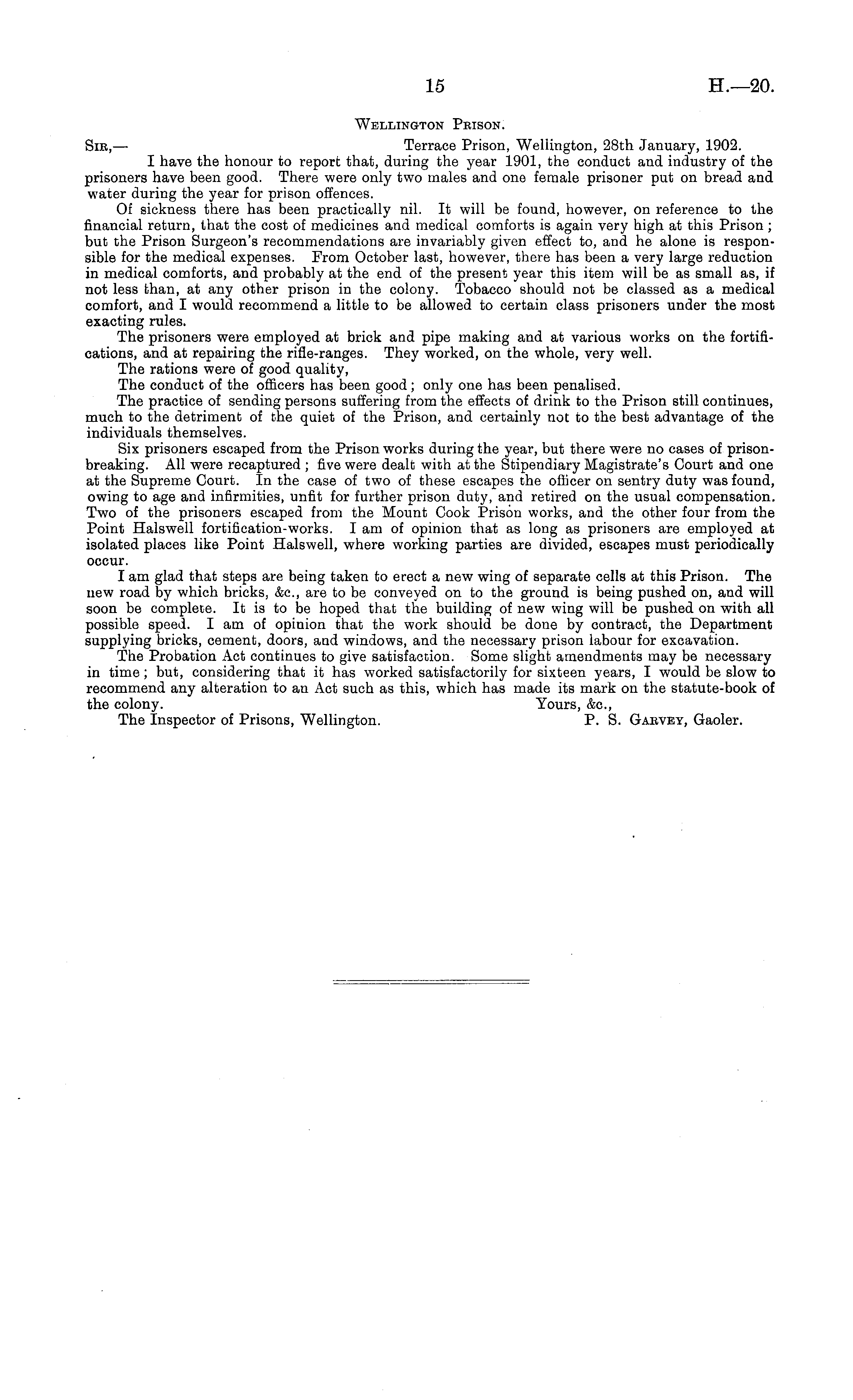 Wellington Prison. Sir, — Terrace Prison, Wellington, 28th January, 1902. I have the honour to report that, during the year 1901, the conduct and industry of the prisoners have been good. There were only two males and one female prisoner put on bread and water during the year for prison offences. Of sickness there has been practically nil. It will be found, however, on reference to the financial return, that the cost of medicines and medical comforts is again very high at this Prison ; but the Prison Surgeon's recommendations are invariably given effect to, and he alone is responsible for the medical expenses. From October last, however, there has been a very large reduction in medical comforts, and probably at the end of the present year this item will be as small as, if not less than, at any other prison in the colony. Tobacco should not be classed as a medical comfort, and I would recommend a little to be allowed to certain class prisoners under the most exacting rules. The prisoners were employed at brick and pipe making and at various works on the fortifications, and at repairing the rifle-ranges. They worked, on the whole, very well. The rations were of good quality, The conduct of the officers has been good; only one has been penalised. The practice of sending persons suffering from the effects of drink to the Prison still continues, much to the detriment of the quiet of the Prison, and certainly not to the best advantage of the individuals themselves. Six prisoners escaped from the Prison works during the year, but there were no cases of prisonbreaking. All were recaptured ; five were dealt with at the Stipendiary Magistrate's Court and one at the Supreme Court. In the case of two of these escapes the officer on sentry duty was found, owing to age and infirmities, unfit for further prison duty, and retired on the usual compensation. Two of the prisoners escaped from the Mount Cook Prison works, and the other four from the Point Halswell fortification-works. lam of opinion that as long as prisoners are employed at isolated places like Point Halswell, where working parties are divided, escapes must periodically occur. lam glad that steps are being taken to erect a new wing of separate cells at this Prison. The new road by which bricks, &c, are to be conveyed on to the ground is being pushed on, and will soon be complete. It is to be hoped that the building of new wing will be pushed on with all possible speed. I am of opinion that the work should be done by contract, the Department supplying bricks, cement, doors, and windows, and the necessary prison labour for excavation. The Probation Act continues to give satisfaction. Some slight amendments may be necessary in time ; but, considering that it has worked satisfactorily for sixteen years, I would be slow to recommend any alteration to an Act such as this, which has made its mark on the statute-book of the colony. Yours, &c, The Inspector of Prisons, Wellington. P. S. Garvey, Gaoler.