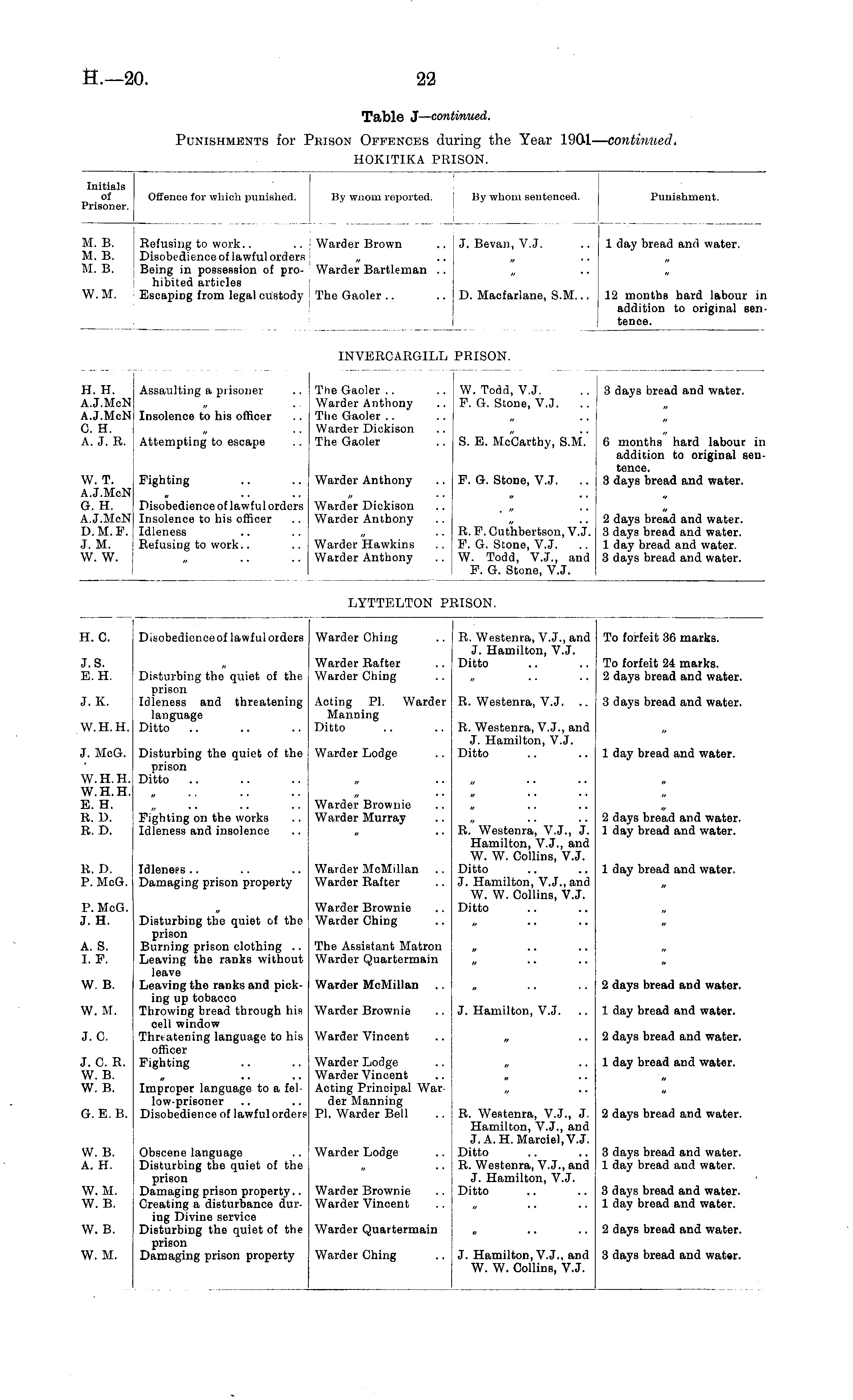 Table J— continued. Punishments for Prison Offences during the Year 1901— continued. HOKITIKA PRISON.