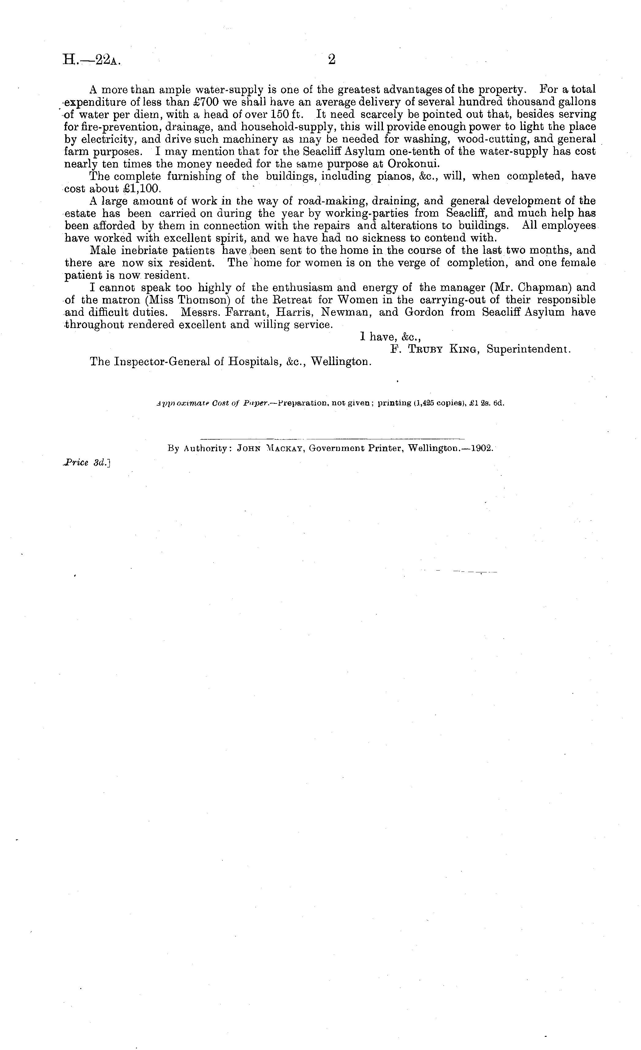 A more than ample water-supply is one of the greatest advantages of the property. For a total expenditure of less than £700 we shall have an average delivery of several hundred thousand gallons of water per diem, with a head of over 150 ft. It need scarcely be pointed out that, besides serving for fire-prevention, drainage, and household-supply, this will provide enough power to light the place by electricity, and drive such machinery as may be needed for washing, wood-cutting, and general farm purposes. I may mention that for the Seacliff Asylum one-tenth of the water-supply has cost nearly ten times the money needed for the same purpose at Orokonui. The complete furnishing of the buildings, including pianos, &c, will, when completed, have cost about £1,100. A large amount of work in the way of road-making, draining, and general development of the estate has been carried on during the year by working-parties from Seacliff, and much help has been afforded by them in connection with the repairs and alterations to buildings. All employees have worked with excellent spirit, and we have had no sickness to contend with. Male inebriate patients have been sent to the home in the course of the last two months, and there are now six resident. The home for women is on the verge of completion, and one female patient is now resident. I cannot speak too highly of the enthusiasm and energy of the manager (Mr. Chapman) and of the matron (Miss Thomson) of the Eetreat for Women in the carrying-out of their responsible and difficult duties. Messrs. Farrant, Harris, Newman, and Gordon from Seacliff Asylum have throughout rendered excellent and willing service. 1 have, &c, F. Teubt King, Superintendent. The Inspector-General of Hospitals, &c, Wellington. jpin oximatr Gout of Piper.— Preparation, not given ; printing (1,425 copies), £1 2s. 6d.