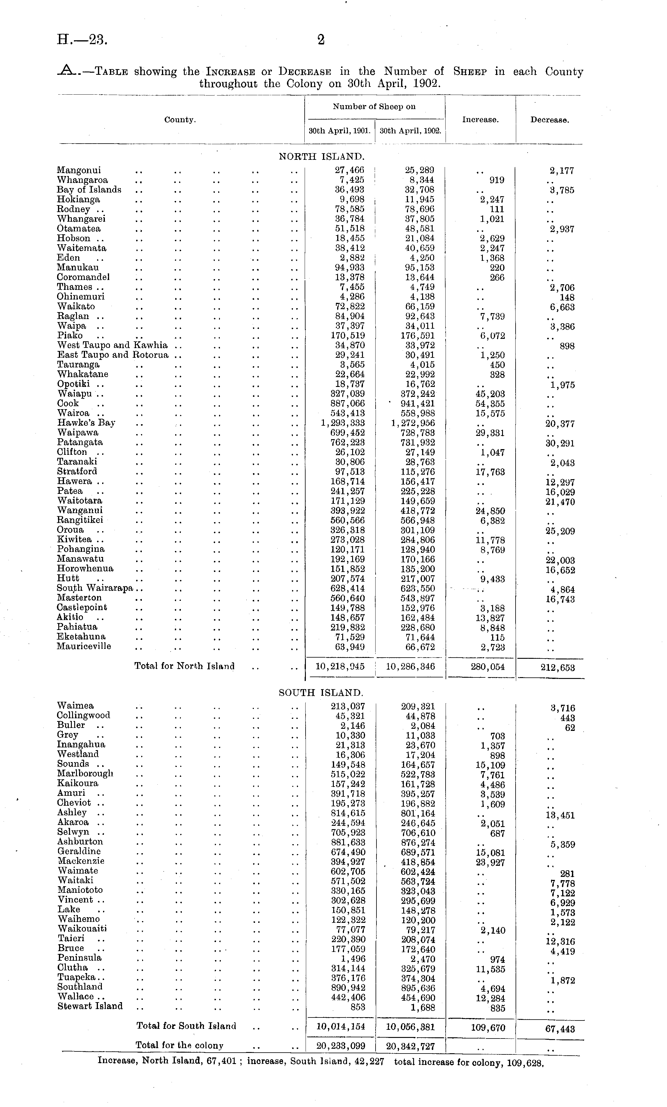 County. Number of Sheep on 30th April, 1901. 30th April, 1902. Number of Sheep on Increase. Decrease, TT TGI IXTH NOR' PH ISLAND. H ISLAND. 27,466 25,289 I 7,425 8,344 36,493 32,708 9,698 | 11,945 78,585 j 78,696 36,784 | 37,805 51,518 i 48,581 18,455 21,084 38,412 40,659 2,882 4,250 94,933 95,153 13,378 I 13,644 7,455 4,749 4,286 4,138 72,822 66,159 84,904 92,643 37,397 34,011 170,519 176,591 34,870 33,972 29,241 | 30,491 3,565 4,015 22,664 22,992 18,737 16,762 327,039 372,242 887,066 ' 941,421 543.413 ' 558,988 1,293,333 1,272,956 699,452 728,783 762,223 731,932 26,102 27,149 30,806 I 28,763 97,513 I 115,276 168,714 j 156,417 241,257 i 225,228 171,129 149,659 393,922 418,772 560,566 566,948 326,318 301,109 273,028 284,806 120,171 128,940 192,169 170,166 151,852 135,200 207,574 217,007 628.414 623,550 560,640 543,897 149,788 152,976 148,657 162,484 219,832 228,680 71,529 71,644 63,949 66,672 919 2,247 111 1,021 2,629 2,247 1,368 220 266 7,739 6,072 1,250 450 328 45,203 54,355 15,575 29,331 1,047 17,763 24,850 6,382 11,778 8,769 9,433 3,188 13,827 8,848 115 2,723 2,17' 3,78, 2,93 2,70 14 6,66 3,38 89 1,97 20,37 30,29 2,04 12,29 16,02 21,47 25,20 22,00 16,65 4,86 16,74 Mangonui Whangaroa Bay of Islands Hokianga Rodney Whangarei Otamatea Hobson Waitemata Eden Manukau Coromandel Thames Ohinemuri Waikato Raglan Waipa Piako West Taupo and Kawhia East Taupo and Rotorua Tauranga Whakatane Opotiki Waiapu Cook Wairoa Hawke's Bay Waipawa Patangata Clifton Taranaki Stratford Hawera Patea Waitotara Wanganui Rangitikei Oroua Kiwitea Pohangina Manawatu Horowhenua Hutt South Wairarapa Masterton Castlepoint Akitio Pahiatua Eketahuna Mauriceville 27,466 7,425 36,493 9,698 78,585 I 36,784 51,518 18,455 38,412 2,882 94,933 13,378 7,455 4,286 72,822 84,904 37,397 170,519 34,870 29,241 3,565 22,664 18,737 327,039 887,066 543,413 1,293,333 699,452 762,223 26,102 30,806 97,513 168,714 241,257 171,129 393,922 560,566 326,318 273,028 120,171 192,169 151,852 207,574 628,414 560,640 149,788 148,657 219,832 71,529 63,949 10,218,945 919 2,247 111 1,021 2,629 2,247 1,368 220 266 7,739 6,072 1,250 450 328 45,203 54,355 15,575 2,177 3,785 2,987 2,706 148 6,663 3,386 898 1,975 20,377 29,331 1,047 30,291 17,763 2,043 12,297 16,029 21,470 24,850 6,382 25,209 11,778 8,769 22,003 16,652 9,433 4,864 16,743 3,188 13,827 8,848 115 2,723 Total for North Island 10,218,945 10,286,346 280,054 212,65 280,054 212,653 sou r 'H ISLAND. Waimea Collingwood Buller 213,037 45,321 2,146 10,330 21,313 16,306 149,548 515,022 157,242 391,718 195,273 814,615 244,594 705,923 881,633 674,490 394,927 602,705 571,502 330,165 302,628 150,851 122,322 77,077 220,390 177,059 1,496 314,144 376,176 890,942 442,406 853 209,321 44,878 2,084 11,033 23,670 17,204 164,657 522,783 161,728 395,257 196,882 801,164 246,645 706,610 876,274 689,571 418,854 602,424 563,724 323,043 295,699 148,278 120,200 79,217 208,074 172,640 2,470 325,679 374,304 895,636 454,690 1,688 3,716 443 62 Grey Inangahua Westland Sounds Marlborough Kaikoura Amuri Cheviot Ashley Akaroa Selwyn Ashburton Geraldine Mackenzie Waimate .. Waitaki .. Maniototo Vincent Lake Waihemo Waikouaiti Taieri .. .. Bruce Peninsula Clutha .. Tuapeka Southland Wallace Stewart Island 703 1,357 898 15,109 7,761 4,486 3,539 1,609 2,051 687 13,451 15,081 23,927 5,359 281 7,778 7,122 6,929 1,573 2,122 2,140 12,316 4,419 974 11,535 4,694 12,284 835 1,872 Total for South Island 10,014,154 10,056,381 109,670 67,443 Total for the colony 20,233,099 20,342,727