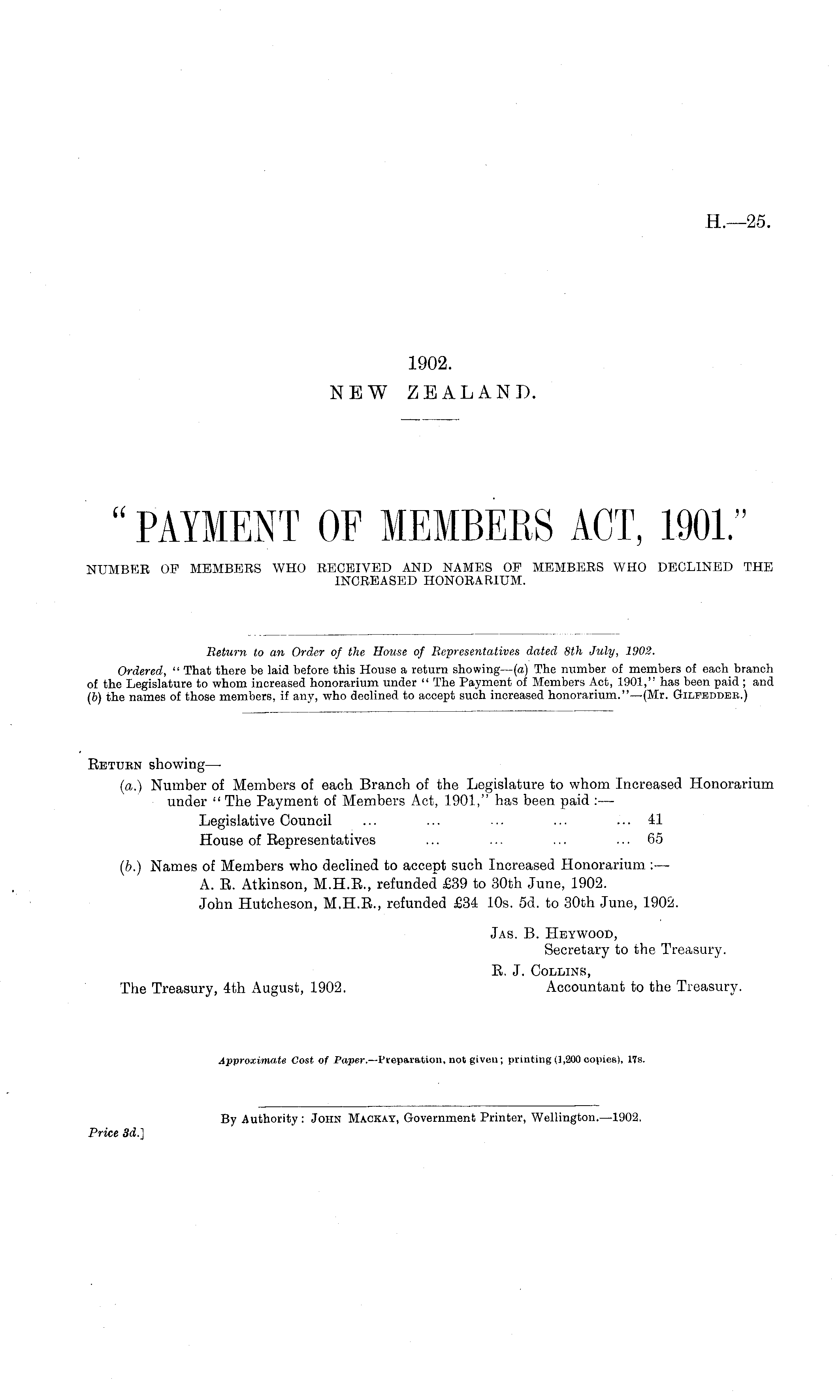 Eeturn showing—■ (a.) Number of Members of each Branch of the Legislature to whom Increased Honorarium under " The Payment of Members Act, 1901," has been paid : — Legislative Council ... ... ••■ ... ... 41 House of Eepresentatives ... ... ... ... 65 (b.) Names of Members who declined to accept such Increased Honorarium : — A. E. Atkinson, M.H.E., refunded £39 to 30th June, 1902. John Hutcheson, M.H.E., refunded £34 10s. sd. to 30th June, 1902. Jas. B. Heywood, Secretary to the Treasury. E. J. Collins, The Treasury, 4th August, 1902. Accountant to the Treasury. Approximate Cost of Paper.— Preparation, not given; printing (1,200 copies), 17s.