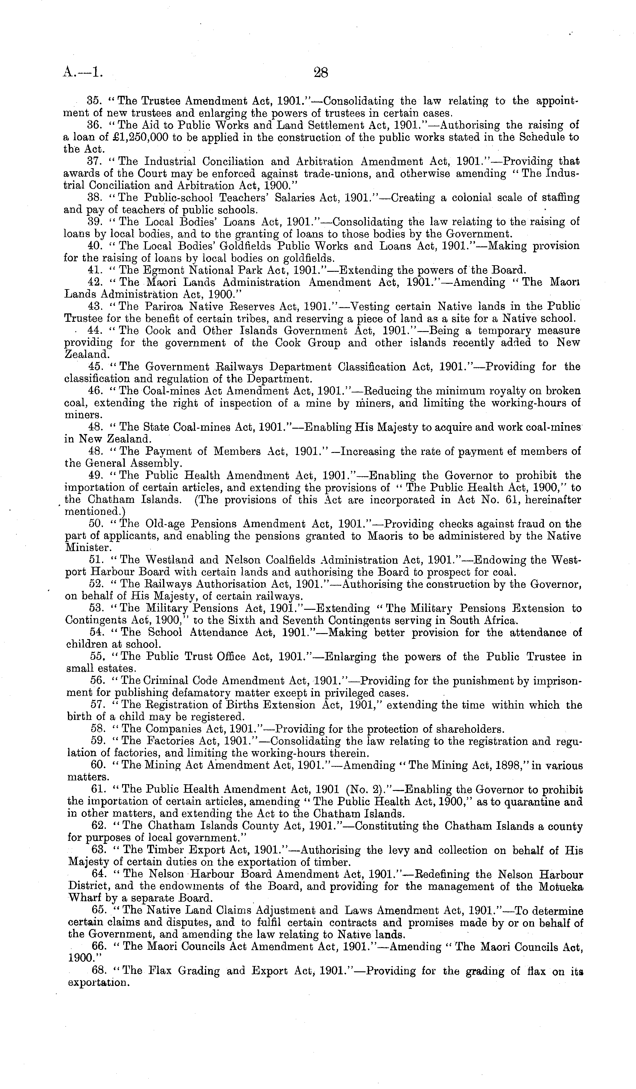 35. " The Trustee Amendment Act, 1901."—Consolidating the law relating to the appointment of new trustees and enlarging the powers of trustees in certain cases. 36. "The Aid to Public Works and Land Settlement Act, 1901." —Authorising the raising of a loan of £1,250,000 to be applied in the construction of the public works stated in the Schedule to the Act. 37. " The Industrial Conciliation and Arbitration Amendment Act, 1901."—Providing that awards of the Court may be enforced against trade-unions, and otherwise amending " The Industrial Conciliation and Arbitration Act, 1900." 38. "The Public-school Teachers' Salaries Act, 1901." —Creating a colonial scale of staffing and pay of teachers of public schools. 39. "The Local Bodies' Loans Act, 1901."—Consolidating the law relating to the raising of loans by local bodies, and to the granting of loans to those bodies by the Government. 40. " The Local Bodies' Goldfields Public Works and Loans Act, 1901."—Making provision for the raising of loans by local bodies on goldfields. 41. " The Egmont National Park Act, 1901."—Extending the powers of the Board. 42. " The Maori Lands Administration Amendment Act, 1901."—Amending " The Maori Lands Administration Act, 1900." 43. "The Pariroa Native Reserves Act, 1901."—Vesting certain Native lands in the Public Trustee for the benefit of certain tribes, and reserving a piece of land as a site for a Native school. • 44. " The Cook and Other Islands Government Act, 1901."—Being a temporary measure providing for the government of the Cook Group and other islands recently added to New Zealand. 45. "The Government Railways Department Classification Act, 1901."—Providing for the classification and regulation of the Department. 46. " The Coal-mines Act Amendment Act, 1901."—Reducing the minimum royalty on broken coal, extending the right of inspection of a mine by miners, and limiting the working-hours of miners. 48. " The State Coal-mines Act, 1901."—Enabling His Majesty to acquire and work coal-mines in New Zealand. 48. " The Payment of Members Act, 1901." —Increasing the rate of payment ef members of the General Assembly. 49. "The Public Health Amendment Act, 1901."—Enabling the Governor to prohibit the importation of certain articles, and extending the provisions of " The Public Health Act, 1900," to the Chatham Islands. (The provisions of this Act are incorporated in Act No. 61, hereinafter mentioned.) 50. " The Old-age Pensions Amendment Act, 1901."—Providing cheeks against fraud on the part of applicants, and enabling the pensions granted to Maoris to be administered by the Native Minister. 51. "The Westland and Nelson Coalfields Administration Act, 1901."—Endowing the Westport Harbour Board with certain lands and authorising the Board to prospect for coal. 52. " The Railways Authorisation Act, 1901." —Authorising the construction by the Governor, on behalf of His Majesty, of certain railways. 53. " The Military Pensions Act, 1901."—Extending " The Military Pensions Extension to Contingents Act, 1900," to the Sixth and Seventh Contingents serving in South Africa. 54. " The School Attendance Act, 1901."—Making better provision for the attendance of children at school. 55. "The Public Trust Office Act, 1901."—Enlarging the powers of the Public Trustee in small estates. 56. " The Criminal Code Amendment Act, 1901."—Providing for the punishment by imprisonment for publishing defamatory matter except in privileged cases. 57. "The Registration of Births Extension Act, 1901," extending the time within which the birth of a child may be registered. 58. " The Companies Act, 1901."—Providing for the protection of shareholders. 59. " The Factories Act, 1901."—Consolidating the law relating to the registration and regulation of factories, and limiting the working-hours therein. 60. " The Mining Act Amendment Act, 1901."—Amending " The Mining Act, 1898," in various matters. 61. " The Public Health Amendment Act, 1901 (No. 2)." —Enabling the Governor to prohibit the importation of certain articles, amending " The Public Health Act, 1900," as to quarantine and in other matters, and extending the Act to the Chatham Islands. 62. " The Chatham Islands County Act, 1901."—Constituting the Chatham Islands a county for purposes of local government." 63. " The Timber Export Act, 1901."—Authorising the levy and collection on behalf of His Majesty of certain duties on the exportation of timber. 64. " The Nelson Harbour Board Amendment Act, 1901."—Redefining the Nelson Harbour District, and the endowments of the Board, and providing for the management of the Motueka Wharf by a separate Board. 65. " The Native Land Claims Adjustment and Laws Amendment Act, 1901."—To determine certain claims and disputes, and to fulfil certain contracts and promises made by or on behalf of the Government, and amending the law relating to Native lands. 66. " The Maori Councils Act Amendment Act, 1901."—Amending " The Maori Councils Act, 1900." 68. "The Flax Grading and Export Act, 1901."—Providing for the grading of flax on its exportation.
