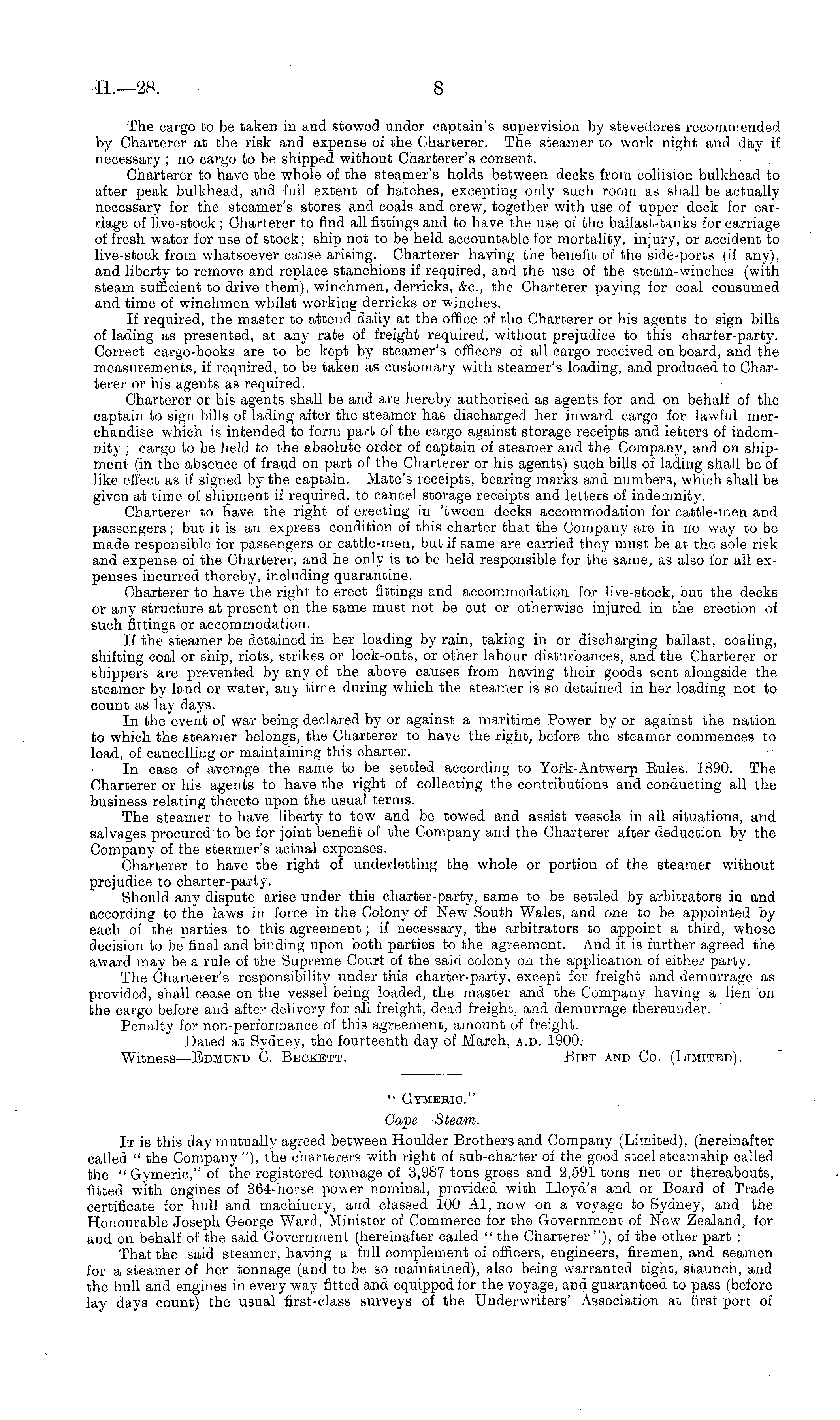 The cargo to be taken in and stowed under captain's supervision by stevedores recommended by Charterer at the risk and expense of the Charterer. The steamer to work night and day if necessary ; no cargo to be shipped without Charterer's consent. Charterer to have the whole of the steamer's holds between decks from collision bulkhead to after peak bulkhead, and full extent of hatches, excepting only such room as shall be actually necessary for the steamer's stores and coals and crew, together with use of upper deck for carriage of live-stock ; Charterer to find all fittings and to have the use of the ballast-tanks for carriage of fresh water for use of stock; ship not to be held accountable for mortality, injury, or accident to live-stock from whatsoever cause arising. Charterer having the benefit of the side-ports (if any), and liberty to remove and replace stanchions if required, and the use of the steam-winches (with steam sufficient to drive them), winchmen, derricks, &c, the Charterer paying for coal consumed and time of winchmen whilst working derricks or winches. If required, the master to attend daily at the office of the Charterer or his agents to sign bills of lading as presented, at any rate of freight required, without prejudice to this charter-party. Correct cargo-books are to be kept by steamer's officers of all cargo received on board, and the measurements, if required, to be taken as customary with steamer's loading, and produced to Charterer or his agents as required. Charterer or his agents shall be and are hereby authorised as agents for and on behalf of the captain to sign bills of lading after the steamer has discharged her inward cargo for lawful merchandise which is intended to form part of the cargo against storage receipts and letters of indemnity ; cargo to be held to the absolute order of captain of steamer and the Company, and on shipment (in the absence of fraud on part of the Charterer or his agents) such bills of lading shall be of like effect as if signed by the captain. Mate's receipts, bearing marks and numbers, which shall be given at time of shipment if required, to cancel storage receipts and letters of indemnity. Charterer to have the right of erecting in 'tween decks accommodation for cattle-men and passengers; but it is an express condition of this charter that the Company are in no way to be made responsible for passengers or cattle-men, but if same are carried they must be at the sole risk and expense of the Charterer, and he only is to be held responsible for the same, as also for all expenses incurred thereby, including quarantine. Charterer to have the right to erect fittings and accommodation for live-stock, but the decks or any structure at present on the same must not be cut or otherwise injured in the erection of such fittings or accommodation. If the steamer be detained in her loading by rain, taking in or discharging ballast, coaling, shifting coal or ship, riots, strikes or lock-outs, or other labour disturbances, and the Charterer or shippers are prevented by any of the above causes from having their goods sent alongside the steamer by land or water, any time during which the steamer is so detained in her loading not to count as lay days. In the event of war being declared by or against a maritime Power by or against the nation to which the steamer belongs, the Charterer to have the right, before the steamer commences to load, of cancelling or maintaining this charter. In case of average the same to be settled according to York-Antwerp Rules, 1890. The Charterer or his agents to have the right of collecting the contributions and conducting all the business relating thereto upon the usual terms. The steamer to have liberty to tow and be towed and assist vessels in all situations, and salvages procured to be for joint benefit of the Company and the Charterer after deduction by the Company of the steamer's actual expenses. Charterer to have the right of underletting the whole or portion of the steamer without prejudice to charter-party. Should any dispute arise under this charter-party, same to be settled by arbitrators in and according to the laws in force in the Colony of New South Wales, and one to be appointed by each of the parties to this agreement; if necessary, the arbitrators to appoint a third, whose decision to be final and binding upon both parties to the agreement. And it is further agreed the award may be a rule of the Supreme Court of the said colony on the application of either party. The Charterer's responsibility under this charter-party, except for freight and demurrage as provided, shall cease on the vessel being loaded, the master and the Company having a lien on the cargo before and after delivery for all freight, dead freight, and demurrage thereunder. Penalty for non-performance of this agreement, amount of freight. Dated at Sydney, the fourteenth day of March, a.d. 1900. Witness—Edmund C. Beckett. Bibt and Co. (Limited).
