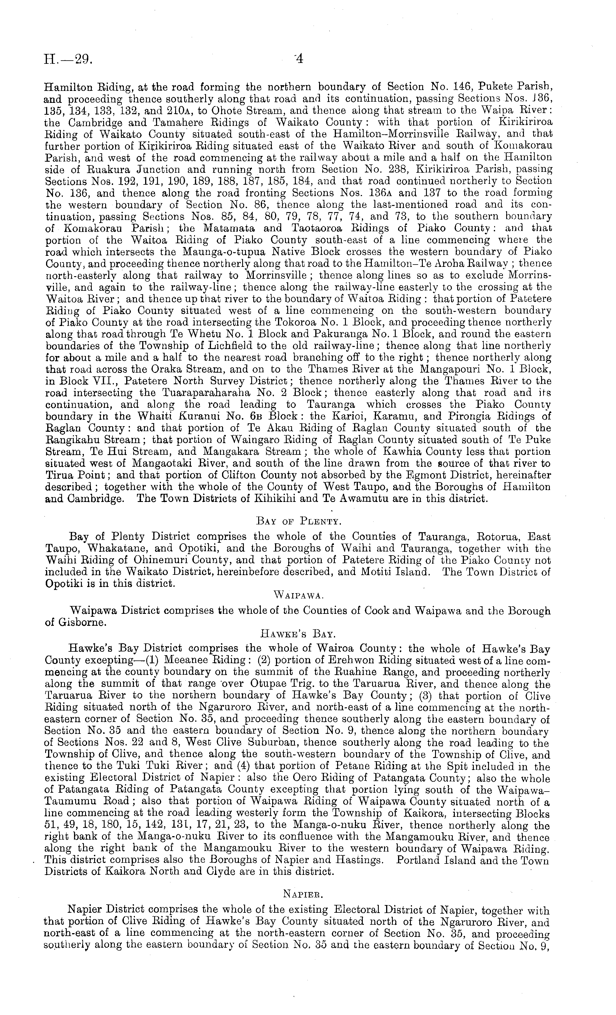 Hamilton Riding, at the road forming the northern boundary of Section No. 146, Pukete Parish, and proceeding thence southerly along that road and its continuation, passing Sections Nos. 136, 135, 134, 133, 132, and 210 a, to Ohote Stream, and thence along that stream to the Waipa River: the Cambridge and Tamahere Ridings of Waikato County : with that portion of Kirikiriroa Riding of Waikato County situated south-east of the Hamilton-Morrinsville Railway, and that further portion of Kirikiriroa Riding situated east of the Waikato River and south of Komakorau Parish, and west of the road commencing at the railway about a mile and a half on the Hamilton side of Ruakura Junction and running north from Section No. 238, Kirikiriroa Parish, passing Sections Nos. 192, 191, 190, 189, 188, 187, 185, 184, and that road continued northerly to Section No. 136, and thence along the road fronting Sections Nos. 136 a and 137 to the road forming the western boundary of Section No. 86, thence along the last-mentioned road and its continuation, passing Sections Nos. 85, 84, 80, 79, 78, 77, 74, and 73, to the southern boundary of Komakorau Parish; the Matamata and Taotaoroa Ridings of Piako County : and that portion of the Waitoa Riding of Piako County south-east of a line commencing where the road which intersects the Maunga-o-tupua Native Block crosses the western boundary of Piako County, and proceeding thence northerly along that road to the Hamilton-Te Aroha Railway ; thence north-easterly along that railway to Morrinsville ; thence along lines so as to exclude Morrinsville, and again to the railway-line; thence along the railway-line easterly to the crossing at the Waitoa River ; and thence up that river to the boundary of Waitoa Riding : that portion of Patetere Riding of Piako County situated west of a line commencing on the south-western boundary of Piako County at the road intersecting the Tokoroa No. 1 Block, and proceeding thence northerly along that road through Te Whetu No. 1 Block and Pakuranga No. 1 Block, and round the eastern boundaries of the Township of Lichfield to the old railway-line; thence along that line northerly for about a mile and a half to the nearest road branching off to the right; thence northerly along that road across the Oraka Stream, and on to the Thames River at the Mangapouri No. 1 Block, in Block VII., Patetere North Survey District; thence northerly along the Thames River to the road intersecting the Tuaraparaharaha No. 2 Block; thence easterly along that road and its continuation, and along the road leading to Tauranga which crosses the Piako County boundary in the Whaiti Kuranui No. 6b Block : the Karioi, Karamu, and Pirongia Ridings of Raglan County : and that portion of Te Akau Riding of Raglan County situated south of the Rangikahu Stream; that portion of Waingaro Riding of Raglan County situated south of Te Puke Stream, Te Hui Stream, and Mangakara Stream ; the whole of Kawhia County less that portion situated west of Mangaotaki River, and south of the line drawn from the source of that river to Tirua Point; and that portion of Clifton County not absorbed by the Egmont District, hereinafter described ; together with the whole of the County of West Taupo, and the Boroughs of Hamilton and Cambridge. The Town Districts of Kihikihi and Te Awamutu are in this district. Bay op Plenty. Bay of Plenty District comprises the whole of the Counties of Tauranga, Rotorua, East Taupo, Whakatane, and Opotiki, and the Boroughs of Waihi and Tauranga, together with the Waihi Riding of Ohinemuri County, and that portion of Patetere Riding of the Piako County not included in the Waikato District, hereinbefore described, and Motiti Island. The Town District of Opotiki is in this district. Waipawa. Waipawa District comprises the whole of the Counties of Cook and Waipawa and the Borough of Gisborne. Hawke's Bay. Hawke's Bay District comprises the whole of Wairoa County : the whole of Hawke's Bay County excepting—(l) Meeanee Riding : (2) portion of Erehwon Riding situated west of a line commencing at the county boundary on the summit of the Ruahine Range, and proceeding northerly along the summit of that range over Otupae Trig, to the Taruarua River, and thence along the Taruarua River to the northern boundary of Hawke's Bay County; (3) that portion of Clive Riding situated north of the Ngaruroro River, and north-east of a line commencing at the northeastern corner of Section No. 35, and proceeding thence southerly along the eastern boundary of Section No. 35 and the eastern bouudary of Section No. 9, thence along the northern boundary of Sections Nos. 22 and 8, West Clive Suburban, thence southerly along the road leading to the Township of Clive, and thence along the south-western boundary of the Township of Clive, and thence to the Tuki Tuki River; and (4) that portion of Petane Riding at the Spit included in the existing Electoral District of Napier : also the Oero Riding of Patangata County; also the whole of Patangata Riding of Patangata County excepting that portion lying south of the WaipawaTaumumu Road; also that portion of Waipawa Riding of Waipawa County situated north of a line commencing at the road leading westerly form the Township of Kaikora, intersecting Blocks 51, 49, 18, 180, 15, 142, 131, 17, 21, 23, to the Manga-o-nuku River, thence northerly along the right bank of the Manga-o-nuku River to its confluence with the Mangamouku River, and thence along the right bank of the Mangamouku River to the western boundary of Waipawa Riding. This district comprises also the Boroughs of Napier and Hastings. Portland Island and the Town Districts of Kaikora North and Clyde are in this district. Napier. Napier District comprises the whole of the existing Electoral District of Napier, together with that portion of Clive Riding of Hawke's Bay County situated north of the Ngaruroro River, and north-east of a line commencing at the north-eastern corner of Section No. 35, and procee