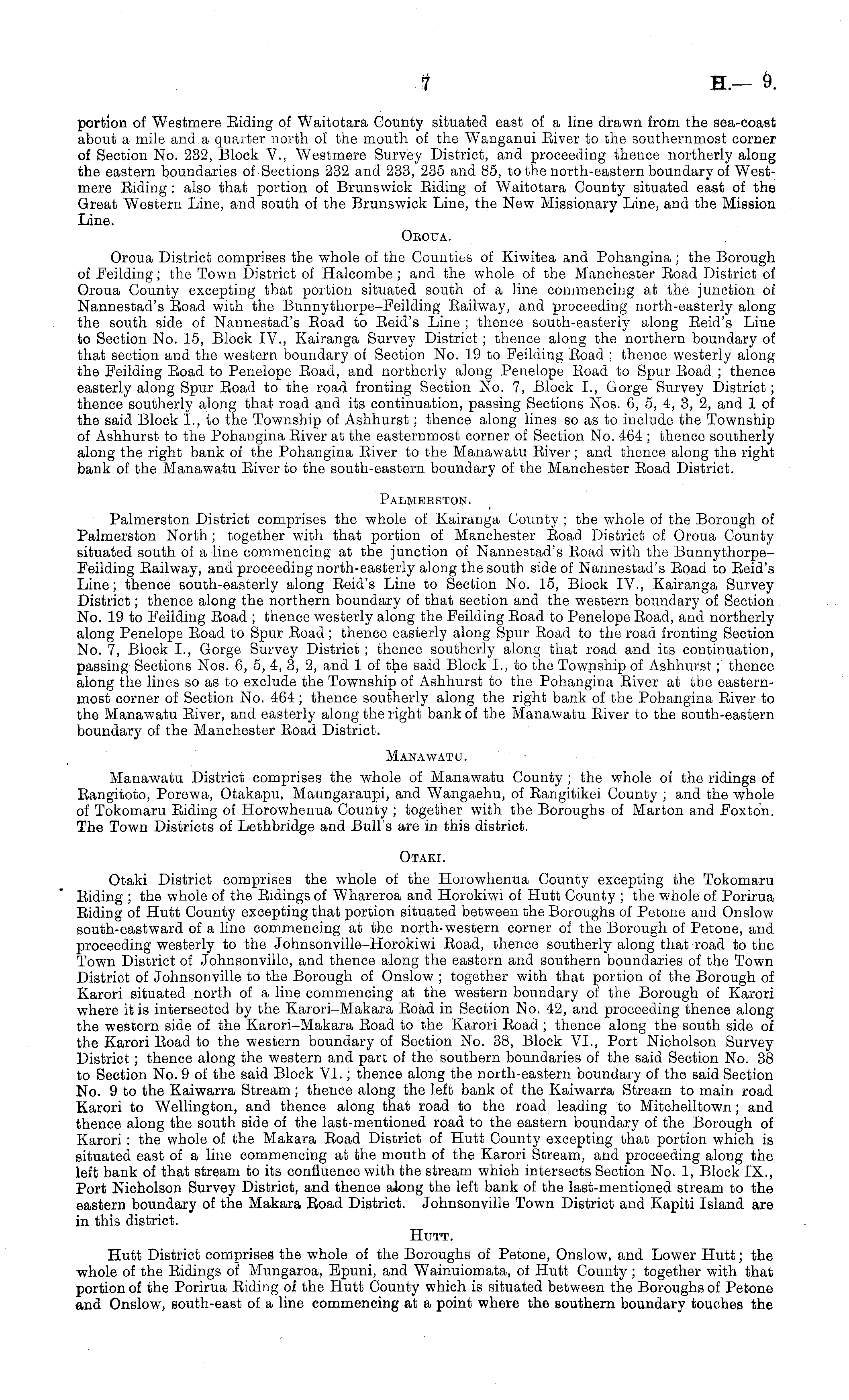 portion of Westmere Riding of Waitotara County situated east of a line drawn from the sea-coast about a mile and a quarter north of the mouth of the Wanganui River to the southernmost corner of Section No. 232, Block V., Westmere Survey District, and proceeding thence northerly along the eastern boundaries of Sections 232 and 233, 235 and 85, to the north-eastern boundary of Westmere Riding : also that portion of Brunswick Riding of Waitotara County situated east of the Great Western Line, and south of the Brunswick Line, the New Missionary Line, and the Mission Line. Oroua. Oroua District comprises the whole of the Counties of Kiwitea and Pohangina ; the Borough of Feilding; the Town District of Halcombe ; and the whole of the Manchester Road District of Oroua County excepting that portion situated south of a line commencing at the junction of Nannestad's Road with the Bunnythorpe-Feilding Railway, and proceeding north-easterly along the south side of Nannestad's Road to Reid's Line ; thence south-easterly along Reid's Line to Section No. 15, Block IV., Kairanga Survey District; thence along the northern boundary of that section and the western boundary of Section No. 19 to Feilding Road ; thence westerly along the Feilding Road to Penelope Road, and northerly along Penelope Road to Spur Road ; thence easterly along Spur Road to the road fronting Section No. 7, Block 1., Gorge Survey District; thence southerly along that road and its continuation, passing Sections Nos. 6, 5, 4, 3, 2, and 1 of the said Block 1., to the Township of Ashhurst; thence along lines so as to include the Township of Ashhurst to the Pohangina River at the easternmost corner of Section No. 464 ; thence southerly along the right bank of the Pohangina River to the Manawatu River; and thence along the right bank of the Manawatu River to the south-eastern boundary of the Manchester Road District. Palmerston. Palmerston District comprises the whole of Kairanga County ; the whole of the Borough of Palmerston North ; together with that portion of Manchester Road District of Oroua County situated south of a line commencing at the junction of Nannestad's Road with the BunnythorpeFeilding Railway, and proceeding north-easterly along the south side of Nannestad's Road to Reid's Line; thence south-easterly along Reid's Line to Section No. 15, Block IV., Kairanga Survey District; thence along the northern boundary of that section and the western boundary of Section No. 19 to Feilding Road ; thence westerly along the Feilding Road to Penelope Road, and northerly along Penelope Road to Spur Road; thence easterly along Spur Road to the road fronting Section No. 7, Block 1., Gorge Survey District ; thence southerly along that road and its continuation, passing Sections Nos. 6, 5, 4, 3, 2, and lof the said Block 1., to the Township of Ashhurst; thence along the lines so as to exclude the Township of Ashhurst to the Pohangina River at the easternmost corner of Section No. 464; thence southerly along the right bank of the Pohangina River to the Manawatu River, and easterly along the right bank of the Manawatu River to the south-eastern boundary of the Manchester Road District. Manawatu. Manawatu District comprises the whole of Manawatu County ; the whole of the ridings of Rangitoto, Porewa, Otakapu, Maungaraupi, and Wangaehu, of Rangitikei County ; and the whole of Tokomaru Riding of Horowhenua County ; together with the Boroughs of Marton and Foxton. The Town Districts of Lethbridge and Bull's are in this district. Otaki. Otaki District comprises the whole of the Horowhenua County excepting the Tokomaru Riding ; the whole of the Ridings of Whareroa and Horokiwi of Hutt County ; the whole of Porirua Riding of Hutt County excepting that portion situated between the Boroughs of Petone and Onslow south-eastward of a line commencing at the north-western corner of the Borough of Petone, and proceeding westerly to the Johnsonville-Horokiwi Road, thence southerly along that road to the Town District of Johnsonville, and thence along the eastern and southern boundaries of the Town District of Johnsonville to the Borough of Onslow ; together with that portion of the Borough of Karori situated north of a line commencing at the western boundary of the Borough of Karori where it is intersected by the Karori-Makara Road in Section No. 42, and proceeding thence along the western side of the Karori-Makara Road to the Karori Road ; thence along the south side of the Karori Road to the western boundary of Section No. 38, Block VI., Port Nicholson Survey District; thence along the western and part of the southern boundaries of the said Section No. 38 to Section No. 9of the said Block VI.; thence along the north-eastern boundary of the said Section No. 9to the Kaiwarra Stream; thence along the left bank of the Kaiwarra Stream to main road Karori to Wellington, and thence along that road to the road leading to Mitchelltown; and thence along the south side of the last-mentioned road to the eastern boundary of the Borough of Karori : the whole of the Makara Road District of Hutt County excepting that portion which is situated east of a line commencing at the mouth of the Karori Stream, and proceeding along the left bank of that stream to its confluence with the stream which intersects Section No. 1, Block IX., Port Nicholson Survey District, and thence along the left bank of the last-mentioned stream to the eastern boundary of the Makara Road District. Johnsonville Town District and Kapiti Island are in this district. Hutt. Hutt District comprises the whole of the Boroughs of Petone, Onslow, and Lower Hutt; the whole of the Ridings of Mungaroa, Epuni, and Wainuiomata, of Hutt County ; together with that portion of the Porirua Riding of the Hutt County which is situated between the Boroughs of Petone and Onslow, south-east of a line commencing at a point where the southern boundary touches the