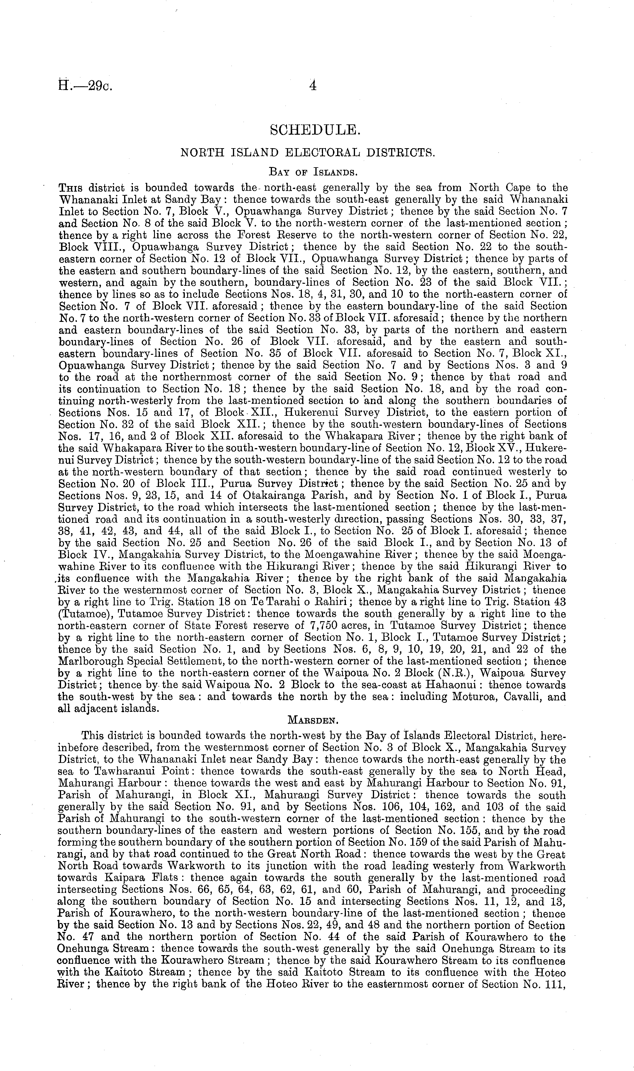 SCHEDULE. NORTH ISLAND ELECTORAL DISTRICTS. Bay of Islands. This district is bounded towards the north-east generally by the sea from North Cape to the Whananaki Inlet at Sandy Bay : thence towards the south-east generally by the said Whananaki Inlet to Section No. 7, Block V., Opuawhanga Survey District; thence by the said Section No. 7 and Section No. 8 of the said Block V. to the north-western corner of the last-mentioned section ; thence by a right line across the Forest Reserve to the north-western corner of Section No. 22, Block VIII., Opuawhanga Survey District; thence by the said Section No. 22 to the southeastern corner of Section No. 12 of Block VII., Opuawhanga Survey District; thence by parts of the eastern and southern boundary-lines of the said Section No. 12, by the eastern, southern, and western, and again by the southern, boundary-lines of Section No. 23 of the said Block VII.; thence by lines so as to include Sections Nos. 18, 4, 31, 30, and 10 to the north-eastern corner of Section No. 7 of Block VII. aforesaid; thence by the eastern boundary-line of the said Section No. 7to the north-western corner of Section No. 33 of Block VII. aforesaid; thence by the northern and eastern boundary-lines of the said Section No. 33, by parts of the northern and eastern boundary-lines of Section No. 26 of Block VII. aforesaid, and by the eastern and southeastern boundary-lines of Section No. 35 of Block VII. aforesaid to Section No. 7, Block XL, Opuawhanga Survey District; thence by the said Section No. 7 and by Sections Nos. 3 and 9 to the road at the northernmost corner of the said Section No. 9; thence by that road and its continuation to Section No. 18 ; thence by the said Section No. 18, and by the road continuing north-westerly from the last-mentioned section to and along the southern boundaries of Sections Nos. 15 and 17, of Block XII., Hukerenui Survey District, to the eastern portion of Section No. 32 of the said Block XII.; thence by the south-western boundary-lines of Sections Nos. 17, 16, and 2of Block XII. aforesaid to the Whakapara River; thence by the right bank of the said Whakapara River to the south-western boundary-line of Section No. 12, Block XV., Hukerenui Survey District; thence by the south-western boundary-line of the said Section No. 12 to the road at the north-western boundary of that section; thence by the said road continued westerly to Section No. 20 of Block 111., Purua Survey District; thence by the said Section No. 25 and by Sections Nos. 9, 23, 15, and 14 of Otakairanga Parish, and by Section No. 1 of Block 1., Purua Survey District, to the road which intersects the last-mentioned section ; thence by the last-men-tioned road and its continuation in a south-westerly direction, passing Sections Nos. 30, 33, 37, 38, 41, 42, 43, and 44, all of the said Block 1., to Section No. 25 of Block I. aforesaid; thence by the said Section No. 25 and Section No. 26 of the said Block 1., and by Section No. 13 of Block IV., Mangakahia Survey District, to the Moengawahine River ; thence by the said Moengawahine River to its confluence with the Hikurangi River; thence by the said Hikurangi River to .its confluence with the Mangakahia River ; thence by the right bank of the said Mangakahia River to the westernmost corner of Section No. 3, Block X., Mangakahia Survey District; thence by a right line to Trig. Station 18 on Te Tarahi o Rahiri; thence by a right line to Trig. Station 43 (Tutamoe), Tutamoe Survey District: thence towards the south generally by a right line to the north-eastern corner of State Forest reserve of 7,750 acres, in Tutamoe Survey District; thence by a right line to the north-eastern corner of Section No. 1, Block 1., Tutamoe Survey District; thence by the said Section No. 1, and by Sections Nos. 6, 8, 9, 10, 19, 20, 21, and 22 of the Marlborough Special Settlement, to the north-western corner of the last-mentioned section; thence by a right line to the north-eastern corner of the Waipoua No. 2 Block (N.R.), Waipoua Survey District; thence by the said Waipoua No. 2 Block to the sea-coast at Hahaonui: thence towards the south-west by the sea : and towards the north by the sea: including Moturoa, Cavalli, and all adjacent islands. Marsden. This district is bounded towards the north-west by the Bay of Islands Electoral District, hereinbefore described, from the westernmost corner of Section No. 3 of Block X., Mangakahia Survey District, to the Whananaki Inlet near Sandy Bay: thence towards the north-east generally by the sea to Tawharanui Point: thence towards the south-east generally by the sea to North Head, Mahurangi Harbour : thence towards the west and east by Mahurangi Harbour to Section No. 91, Parish of Mahurangi, in Block XL, Mahurangi Survey District : thence towards the south generally by the said Section No. 91, and by Sections Nos. 106, 104, 162, and 103 of the said Parish of Mahurangi to the south-western corner of the last-mentioned section : thence by the southern boundary-lines of the eastern and western portions of Section No. 155, and by the road forming the southern boundary of the southern portion of Section No. 159 of the said Parish of Mahurangi, and by that road continued to the Great North Road: thence towards the west by the Great North Road towards Warkworth to its junction with the road leading westerly from Warkworth towards Kaipara Flats : thence again towards the south generally by the last-mentioned road intersecting Sections Nos. 66, 65, 64, 63, 62, 61, and 60, Parish of Mahurangi, and proceeding along the southern boundary of Section No. 15 and intersecting Sections Nos. 11, 12, and 13, Parish of Kourawhero, to the north-western boundary-line of the last-mentioned section ; thence by the said Section No. 13 and by Sections Nos. 22, 49, and 48 and the northern portion of Section No. 47 and the northern portion of Section No. 44 of the said Parish of Kourawhero to the Onehunga Stream: thence towards the south-west genera