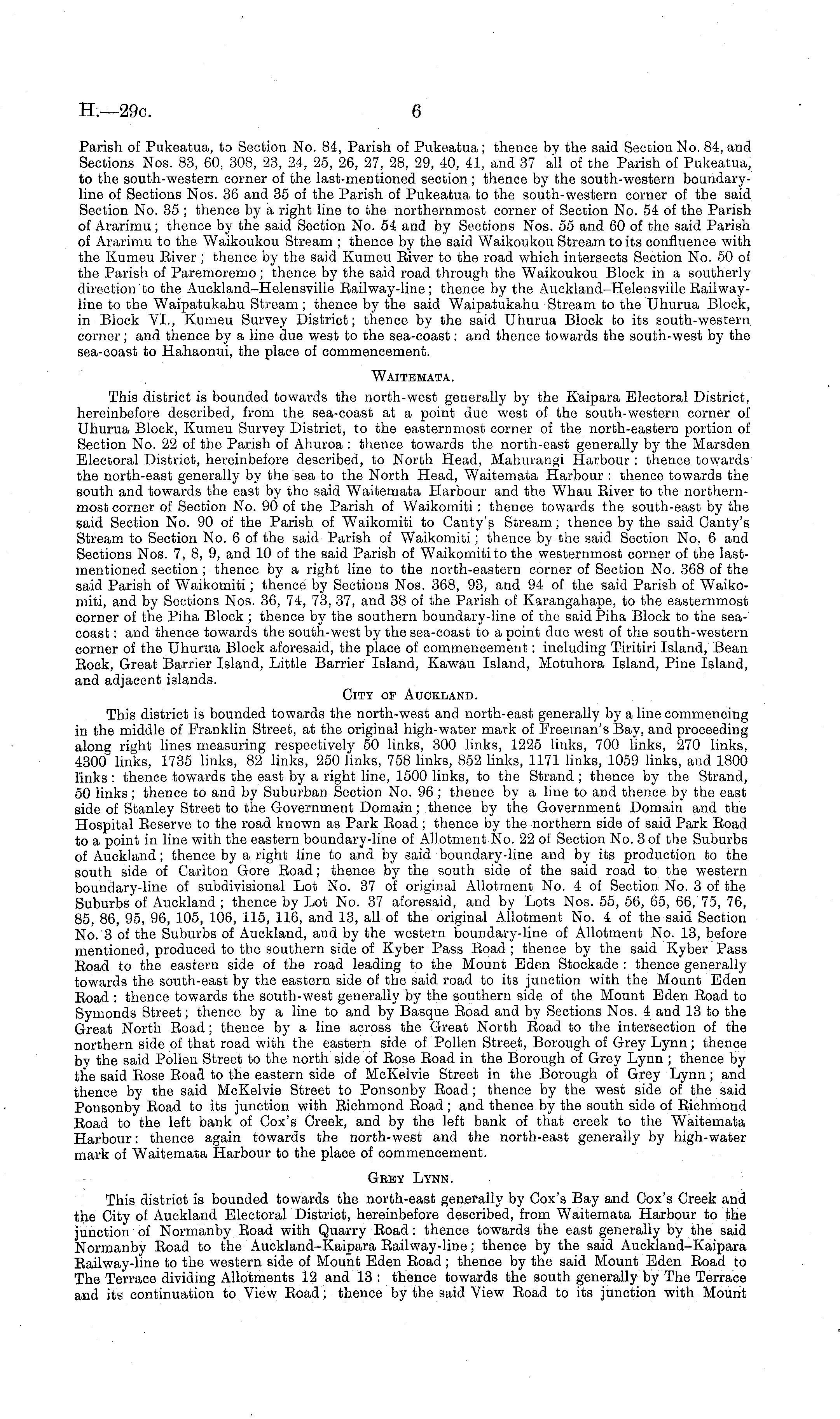 Parish of Pukeatua, to Section No. 84, Parish of Pukeatua; thence by the said Section No. 84, and Sections Nos. 83, 60, 308, 23, 24, 25, 26, 27, 28, 29, 40, 41, and 37 all of the Parish of Pukeatua, to the south-western corner of the last-mentioned section; thence by the south-western boundaryline of Sections Nos. 36 and 35 of the Parish of Pukeatua to the south-western corner of the said Section No. 35 ; thence by a right line to the northernmost corner of Section No. 54 of the Parish of Ararimu; thence by the said Section No. 54 and by Sections Nos. 55 and 60 of the said Parish of Ararimu to the Waikoukou Stream ; thence by the said Waikoukou Stream to its confluence with the Kumeu River ; thence by the said Kumeu River to the road which intersects Section No. 50 of the Parish of Paremoremo; thence by the said road through the Waikoukou Block in a southerly direction to the Auekland-Helensville Railway-line; thence by the Auckland-Helensville Railwayline to the Waipatukahu Stream; thence by the said Waipatukahu Stream to the Uhurua Block, in Block VI., Kumeu Survey District; thence by the said Uhurua Block to its south-western corner; and thence by a line due west to the sea-coast: and thence towards the south-west by the sea-coast to Hahaonui, the place of commencement. Waitemata. This district is bounded towards the north-west generally by the K'aipara Electoral District, hereinbefore described, from the sea-coast at a point due west of the south-western corner of Uhurua Block, Kumeu Survey District, to the easternmost corner of the north-eastern portion of Section No. 22 of the Parish of Ahuroa : thence towards the north-east generally by the Marsden Electoral District, hereinbefore described, to North Head, Mahurangi Harbour : thence towards the north-east generally by the sea to the North Head, Waitemata Harbour : thence towards the south and towards the east by the said Waitemata Harbour and the Whau River to the northernmost corner of Section No. 90 of the Parish of Waikomiti: thence towards the south-east by the said Section No. 90 of the Parish of Waikomiti to Canty's Stream; thence by the said Canty's Stream to Section No. 6of the said Parish of Waikomiti; thence by the said Section No. 6 and Sections Nos. 7, 8, 9, and 10 of the said Parish of Waikomiti to the westernmost corner of the lastmentioned section ; thence by a right line to the north-eastern corner of Section No. 368 of the said Parish of Waikomiti; thence by Sections Nos. 368, 93, and 94 of the said Parish of Waikomiti, and by Sections Nos. 36, 74, 73, 37, and 38 of the Parish of Karangahape, to the easternmost corner of the Piha Block ; thence by the southern boundary-line of the saidPiha Block to the seacoast : and thence towards the south-west by the sea-coast to a point due west of the south-western corner of the Uhurua Block aforesaid, the place of commencement: including Tiritiri Island, Bean Rock, Great Barrier Island, Little Barrier Island, Kawau Island, Motuhora Island, Pine Island, and adjacent islands. City op Auckland. This district is bounded towards the north-west and north-east generally by a line commencing in the middle of Franklin Street, at the original high-water mark of Freeman's Bay, and proceeding along right lines measuring respectively 50 links, 300 links, 1225 links, 700 links, 270 links, 4300 links, 1735 links, 82 links, 250 links, 758 links, 852 links, 1171 links, 1059 links, and 1800 links : thence towards the east by a right line, 1500 links, to the Strand ; thence by the Strand, 50 links; thence to and by Suburban Section No. 96 ; thence by a line to and thence by the east side of Stanley Street to the Government Domain; thence by the Government Domain and the Hospital Reserve to the road known as Park Road; thence by the northern side of said Park Road to a point in line with the eastern boundary-line of Allotment No. 22 of Section No. 3 of the Suburbs of Auckland; thence by a right line to and by said boundary-line and by its production to the south side of Carlton Gore Road; thence by the south side of the said road to the western boundary-line of subdivisional Lot No. 37 of original Allotment No. 4 of Section No. 3 of the Suburbs of Auckland ; thence by Lot No. 37 aforesaid, and by Lots Nos. 55, 56, 65, 66, 75, 76, 85, 86, 95, 96, 105, 106, 115, 116, and 13, all of the original Allotment No. 4 of the said Section No. 3 of the Suburbs of Auckland, and by the western boundary-line of Allotment No. 13, before mentioned, produced to the southern side of Kyber Pass Road ; thence by the said Kyber Pass Road to the eastern side of the road leading to the Mount Eden Stockade : thence generally towards the south-east by the eastern side of the said road to its junction with the Mount Eden Road : thence towards the south-west generally by the southern side of the Mount Eden Road to Symonds Street; thence by a line to and by Basque Road and by Sections Nos. 4 and 13 to the Great North Road; thence by a line across the Great North Road to the intersection of the northern side of that road with the eastern side of Pollen Street, Borough of Grey Lynn ; thence bv the said Pollen Street to the north side of Rose Road in the Borough of Grey Lynn ; thence by the said Rose Road to the eastern side of McKelvie Street in the Borough of Grey Lynn; and thence by the said McKelvie Street to Ponsonby Road; thence by the west side of the said Ponsonby Road to its junction with Richmond Road ; and thence by the south side of Richmond Road to the left bank of Cox's Creek, and by the left bank of that creek to the Waitemata Harbour: thence again towards the north-west and the north-east generally by high-water mark of Waitemata Harbour to the place of commencement. Grey Lynn. This district is bounded towards the north-east generally by Cox's Bay and Cox's Creek and the City of Auckland Electoral District, hereinbefore described, from Waitemata Harbour to the junction of Normanby Road with Quarry Road : thenc