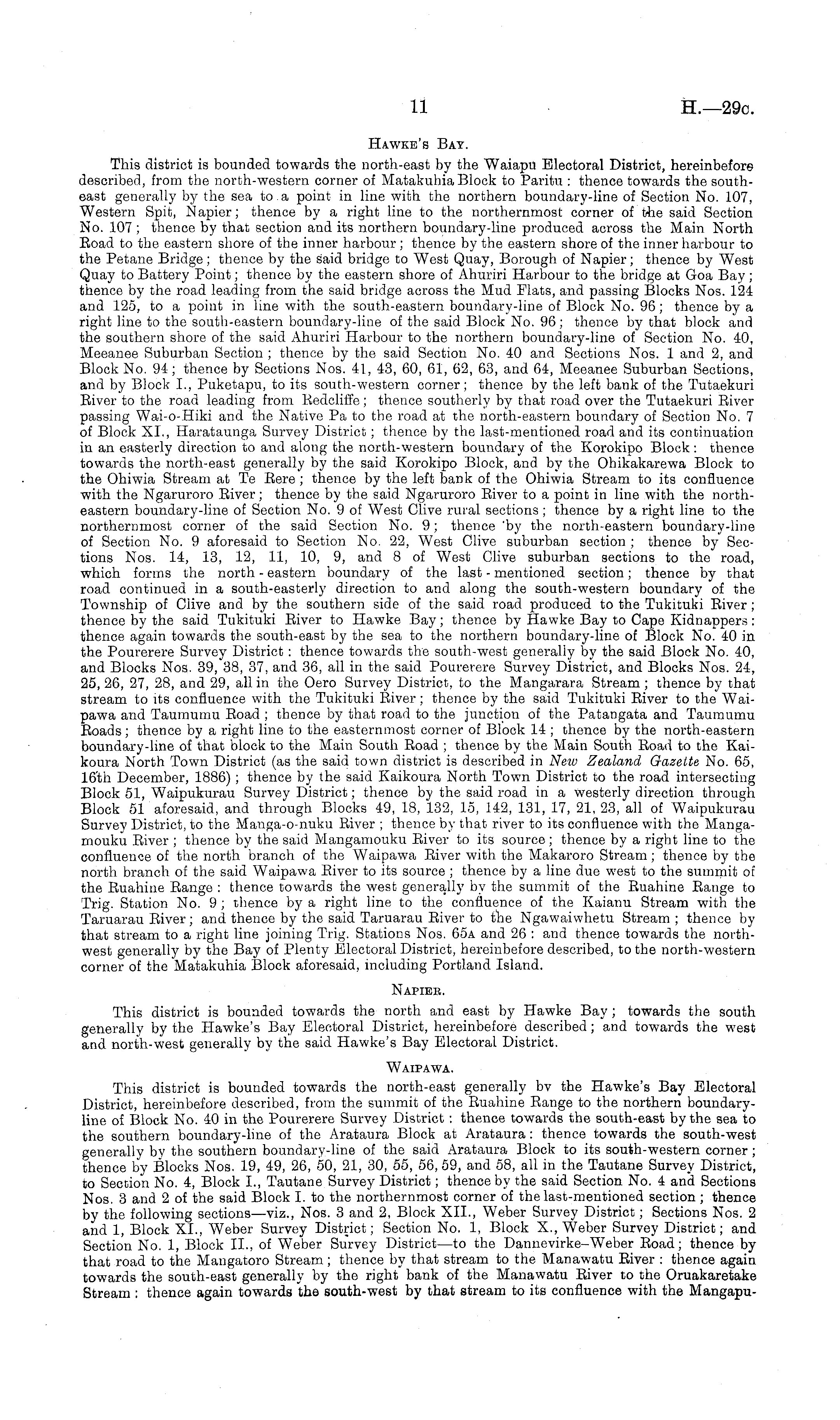 Hawke's Bay. This district is bounded towards the north-east by the Waiapu Electoral District, hereinbefore described, from the north-western corner of Matakuhia Block to Paritu : thence towards the southeast generally by the sea to.a point in line with the northern boundary-line of Section No. 107, Western Spit, Napier; thence by a right line to the northernmost corner of the said Section No. 107 ; thence by that section and its northern boundary-line produced across the Main North Road to the eastern shore of the inner harbour; thence by the eastern shore of the inner harbour to the Petane Bridge; thence by the said bridge to West Quay, Borough of Napier; thence by West Quay to Battery Point; thence by the eastern shore of Ahuriri Harbour to the bridge at Goa Bay; thence by the road leading from the said bridge across the Mud Flats, and passing Blocks Nos. 124 and 125, to a point in line with the south-eastern boundary-line of Block No. 96; thence by a right line to the south-eastern boundary-line of the said Block No. 96 ; thence by that block and the southern shore of the said Ahuriri Harbour to the northern boundary-line of Section No. 40, Meeanee Suburban Section ; thence by the said Section No. 40 and Sections Nos. 1 and 2, and Block No. 94; thence by Sections Nos. 41, 43, 60, 61, 62, 63, and 64, Meeanee Suburban Sections, and by Block 1., Puketapu, to its south-western corner; thence by the left bank of the Tutaekuri River to the road leading from Redcliffe; thence southerly by that road over the Tutaekuri River passing Wai-o-Hiki and the Native Pa to the road at the north-eastern boundary of Section No. 7 of Block XL, Harataunga Survey District; thence by the last-mentioned road and its continuation in an easterly direction to and along the north-western boundary of the Korokipo Block: thence towards the north-east generally by the said Korokipo Block, and by the Ohikakarewa Block to the Ohiwia Stream at Te Rere ; thence by the left bank of the Ohiwia Stream to its confluence with the Ngaruroro River; thence by the said Ngaruroro River to a point in line with the northeastern boundary-line of Section No. 9 of West Clive rural sections ; thence by a right line to the northernmost corner of the said Section No. 9; thence 'by the north-eastern boundary-line of Section No. 9 aforesaid to Section No. 22, West Clive suburban section ; thence by Sections Nos. 14, 13, 12, 11, 10, 9, and 8 of West Clive suburban sections to the road, which forms the north - eastern boundary of the last - mentioned section; thence by that road continued in a south-easterly direction to and along the south-western boundary of the Township of Clive and by the southern side of the said road produced to the Tukituki River ; thence by the said Tukituki River to Hawke Bay; thence by Hawke Bay to Cape Kidnappers : thence again towards the south-east by the sea to the northern boundary-line of Block No. 40 in the Pourerere Survey District : thence towards the south-west generally by the said Block No. 40, and Blocks Nos. 39, 38, 37, and 36, all in the said Pourerere Survey District, and Blocks Nos. 24, 25, 26, 27, 28, and 29, all in the Oero Survey District, to the Mangarara Stream ; thence by that stream to its confluence with the Tukituki River; thence by the said Tukituki River to the Waipawa and Taumumu Road ; thence by that road to the junction of the Patangata and Taumumu Roads; thence by a right line to the easternmost corner of Block 14 ; thence by the north-eastern boundary-line of that block to the Main South Road ; thence by the Main South Road to the Kaikoura North Town District (as the said town district is described in New Zealand Gazette No. 65, 16'th December, 1886) ; thence by the said Kaikoura North Town District to the road intersecting Block 51, Waipukurau Survey District; thence by the said road in a westerly direction through Block 51 aforesaid, and through Blocks 49, 18, 132, 15, 142, 131, 17, 21, 23, all of Waipukurau Survey District, to the Manga-o-nuku River ; thence by that river to its confluence with the Mangamouku River ; thence by the said Mangamouku River to its source; thence by a right line to the confluence of the north branch of the Waipawa River with the Makaroro Stream; thence by the north branch of the said Waipawa River to its source ; thence by a line due west to the summit of the Ruahine Range : thence towards the west generally by the summit of the Ruahine Range to Trig. Station No. 9 ; thence by a right line to the confluence of the Kaianu Stream with the Taruarau River; and thence by the said Taruarau River to the Ngawaiwhetu Stream ; thence by that stream to a right line joining Trig. Stations Nos. 65a and 26 : and thence towards the northwest generally by the Bay of Plenty Electoral District, hereinbefore described, to the north-western corner of the Matakuhia Block aforesaid, including Portland Island. Napier. This district is bounded towards the north and east by Hawke Bay ; towards the south generally by the Hawke's Bay Electoral District, hereinbefore described; and towards the west and north-west generally by trie said Hawke's Bay Electoral District. Waipawa. This district is bounded towards the north-east generally bv the Hawke's Bay Electoral District, hereinbefore described, from the summit of the Ruahine Range to the northern boundaryline of Block No. 40 in the Pourerere Survey District : thence towards the south-east by the sea to the southern boundary-line of the Arataura Block at Arataura : thence towards the south-west generally by the southern boundary-line of the said Arataura Block to its south-western corner ; thence by Blocks Nos. 19, 49, 26, 50, 21, 30, 55, 56, 59, and 58, all in the Tautane Survey District, to Section No. 4, Block 1., Tautane Survey District; thence by the said Section No. 4 and Sections Nos. 3 and 2 of the said Block I. to the northernmost corner of the last-mentioned section ; thence by the following sections —viz., Nos. 3 and