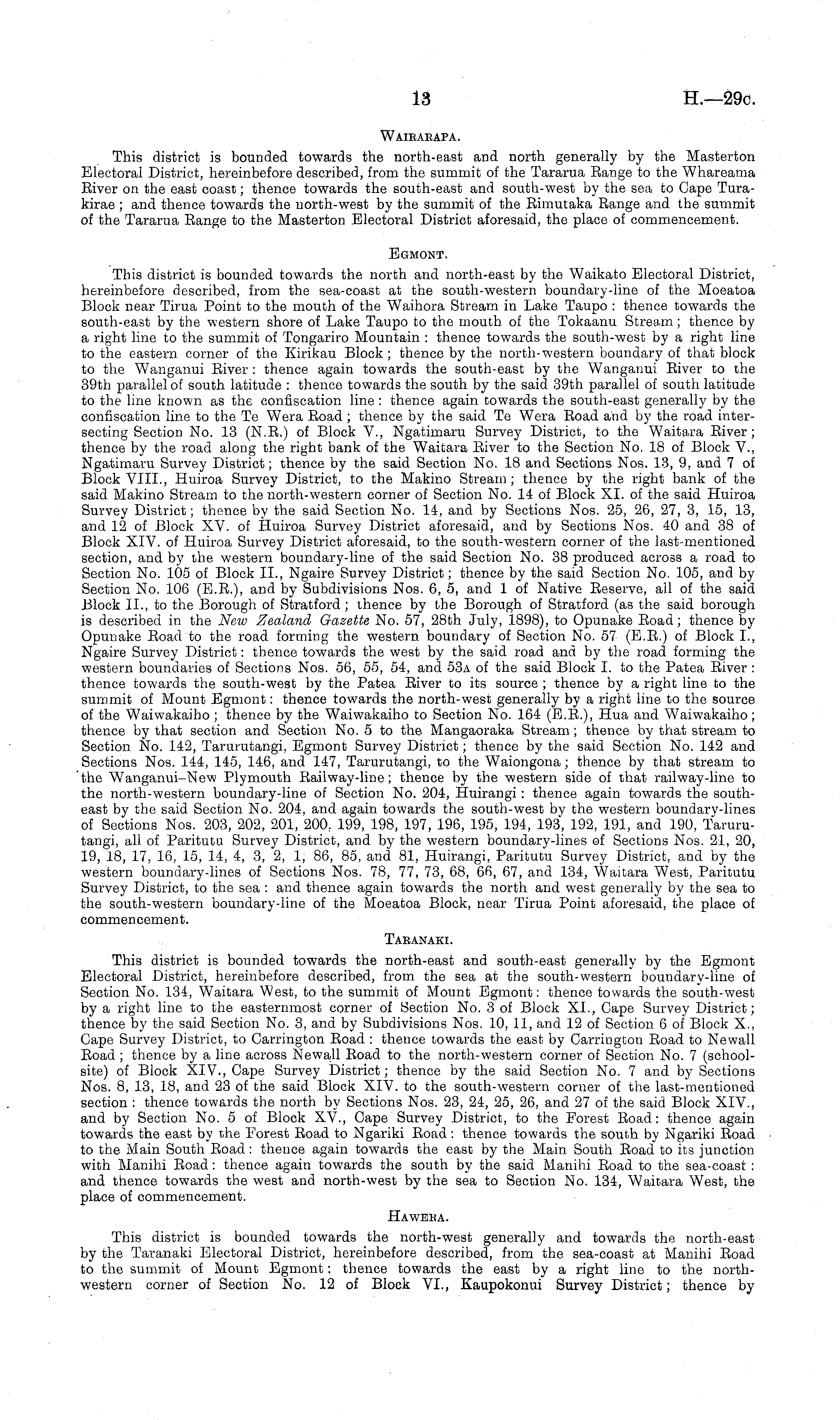 Wairarapa. This district is bounded towards the north-east and north generally by the Masterton Electoral District, hereinbefore described, from the summit of the Tararua Range to the Whareama River on the east coast; thence towards the south-east and south-west by the sea to Cape Turakirae ; and thence towards the north-west by the summit of the Rimutaka Range and the summit of the Tararua Range to the Masterton Electoral District aforesaid, the place of commencement. Egmont. This district is bounded towards the north and north-east by the Waikato Electoral District, hereinbefore described, from the sea-coast at the south-western boundary-line of the Moeatoa Block near Tirua Point to the mouth of the Waihora Stream in Lake Taupo : thence towards the south-east by the western shore of Lake Taupo to the mouth of the Tokaanu Stream; thence by a right line to the summit of Tongariro Mountain : thence towards the south-west by a right line to the eastern corner of the Kirikau Block ; thence by the north-western boundary of that block to the Wanganui River : thence again towards the south-east by the Wanganui River to the 39th parallel of south latitude : thence towards the south by the said 39th parallel of south latitude to the line known as the confiscation line : thence again towards the south-east generally by the confiscation line to the Te Wera Road ; thence by the said Te Wera Road and by the road intersecting Section No. 13 (N.R.) of Block V., Ngatimaru Survey District, to the Waitara River; thence by the road along the right bank of the Waitara River to the Section No. 18 of Block V., Ngatimaru Survey District; thence by the said Section No. 18 and Sections Nos. 13, 9, and 7 of Block VIII., Huiroa Survey District, to the Makino Stream; thence by the right bank of the said Makino Stream to the north-western corner of Section No. 14 of Block XI. of the said Huiroa Survey District; thence by the said Section No. 14, and by Sections Nos. 25, 26, 27, 3, 15, 13, and 12 of Block XV. of Huiroa Survey District aforesaid, and by Sections Nos. 40 and 38 of Block XIV. of Huiroa Survey District aforesaid, to the south-western corner of the last-mentioned section, and by the western boundary-line of the said Section No. 38 produced across a road to Section No. 105 of Block 11., Ngaire Survey District; thence by the said Section No. 105, and by Section No. 106 (E.R.), and by Subdivisions Nos. 6, 5, and 1 of Native Reserve, all of the said Block 11., to the Borough of Stratford ; thence by the Borough of Stratford (as the said borough is described in the New Zealand Gazette No. 57, 28th July, 1898), to Opunake Road; thence by Opunake Road to the road forming the western boundary of Section No. 57 (E.R.) of Block L, Ngaire Survey District: thence towards the west by the said road and by the road forming the western boundaries of Sections Nos. 56, 55, 54, and 53a of the said Block I. to the Patea River : thence towards the south-west by the Patea River to its source ; thence by a right line to the summit of Mount Egmont: thence towards the north-west generally by a right line to the source of the Waiwakaiho ; thence by the Waiwakaiho to Section No. 164 (E.R.), Hua and Waiwakaiho; thence by that section and Section No. 5 to the Mangaoraka Stream; thence by that stream to Section No. 142, Tarurutangi, Egmont Survey District; thence by the said Section No. 142 and Sections Nos. 144, 145, 146, and 147, Tarurutangi, to the Waiongona ; thence by that stream to the Wanganui-New Plymouth Railway-line; thence by the western side of that railway-line to the north-western boundary-line of Section No. 204, fluirangi: thence again towards the southeast by the said Section No. 204, and again towards the south-west by the western boundary-lines of Sections Nos. 203, 202, 201, 200, 199, 198, 197, 196, 195, 194, 193, 192, 191, and 190, Tarurutangi, all of Paritutu Survey District, and by the western boundary-lines of Sections Nos. 21, 20, 19, 18, 17, 16, 15, 14, 4, 3, 2, 1, 86, 85, and 81, Huirangi, Paritutu Survey District, and by the western boundary-lines of Sections Nos. 78, 77, 73, 68, 66, 67, and 134, Waitara West, Paritutu Survey District, to the sea : and thence again towards the north and west generally by the sea to the south-western boundary-line of the Moeatoa Block, near Tirua Point aforesaid, the place of commencement. Taranaki. This district is bounded towards the north-east and south-east generally by the Egmont Electoral District, hereinbefore described, from the sea at the south-western boundary-line of Section No. 134, Waitara West, to the summit of Mount Egmont: thenee towards the south-west by a right line to the easternmost corner of Section No. 3 of Block XL, Cape Survey District; thence by the said Section No. 3, and by Subdivisions Nos. 10, 11, and 12 of Section 6 of Block X., Cape Survey District, to Carrington Road : thence towards the east by Carrington Road to Newall Road ; thence by a line across Newall Road to the north-western corner of Section No. 7 (schoolsite) of Block XIV., Cape Survey District; thence by the said Section No. 7 and by Sections Nos. 8, 13, 18, and 23 of the said Block XIV. to the south-western corner of the last-mentioned section : thence towards the north by Sections Nos. 23, 24, 25, 26, and 27 of the said Block XIV., and by Section No. 5 of Block XV, Cape Survey District, to the Forest Road: thence again towards the east by the Forest Road to Ngariki Road: thence towards the south by Ngariki Road to the Main South Road: thence again towards the east by the Main South Road to its junction with Manihi Road : thence again towards the south by the said Manihi Road to the sea-coast : and thence towards the west and north-west by the sea to Section No. 134, Waitara West, the place of commencement. Hawera. This district is bounded towards the north-west generally and towards the north-east by the Taranaki Electoral District, hereinbefore described, from the sea-coast at 