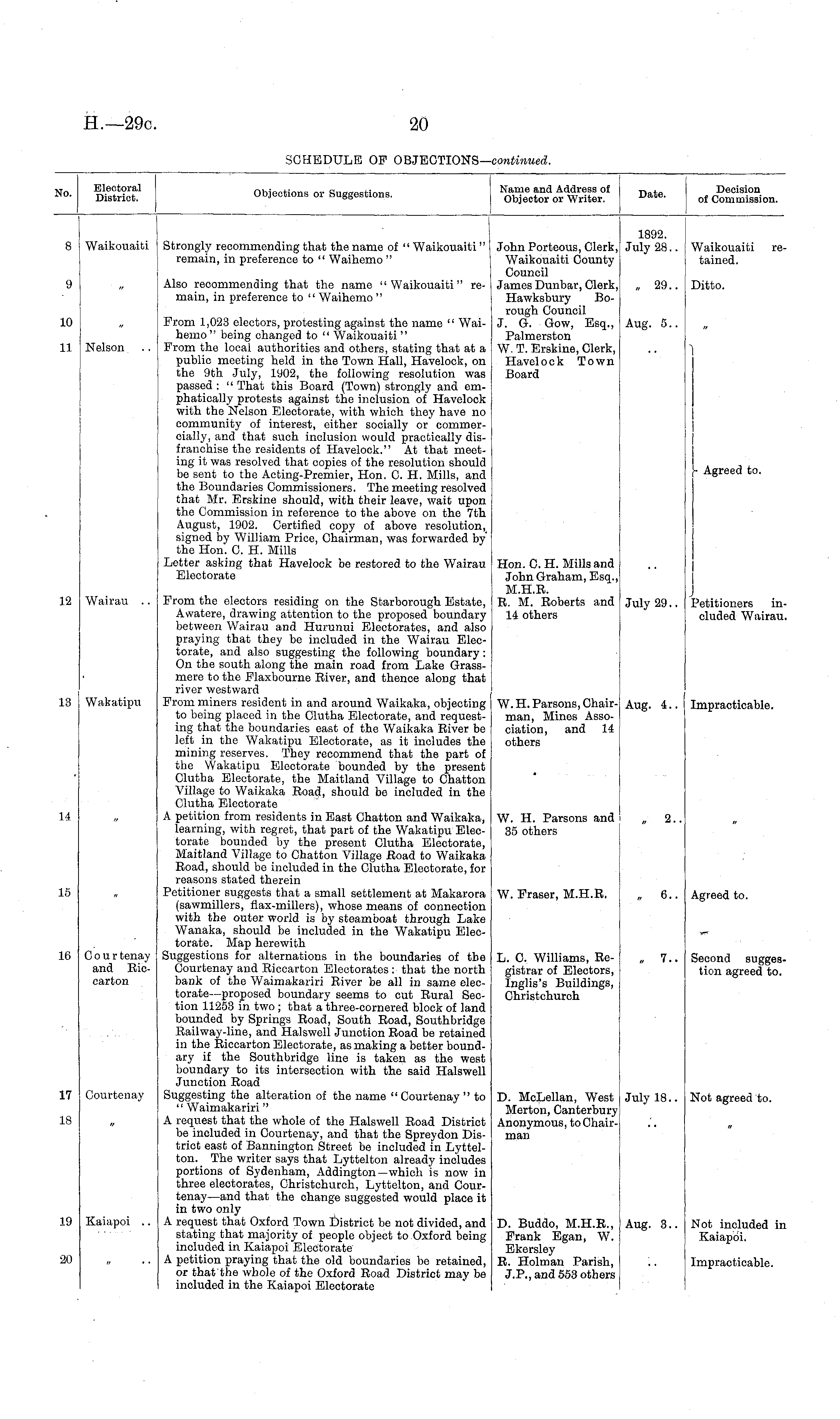 [o. Electoral District. Objections or Suggestions. Name and Address of Objector or Writer. Date. Decision of Commission. Waikouaiti Strongly recommending that the name of "Waikouaiti" remain, in preference to " Waihemo " John Porteous, Clerk, Waikouaiti County Council James Dunbar, Clerk, Hawksbury Borough Council J. G. Gow, Esq., Palmerston W. T. Erskine, Clerk, Havelock Town Board 1892. July 28.. Waikouaiti tained. re9 Also recommending that the name "Waikouaiti" remain, in preference to " Waihemo " „ 29.. Ditto. 10 Prom 1,023 electors, protesting against the name " Waihemo " being changed to " Waikouaiti " Prom the local authorities and others, stating that at a public meeting held in the Town Hall, Havelock, on the 9th July, 1902, the following resolution was passed : " That this Board (Town) strongly and emphatically protests against the inclusion of Havelock with the Nelson Electorate, with which tliey have no community of interest, either socially or commercially, and that such inclusion would practically disfranchise the residents of Havelock." At that meeting it was resolved that copies of the resolution should be sent to the Acting-Premier, Hon. C. H. Mills, and the Boundaries Commissioners. The meeting resolved that Mr. Erskine should, with their leave, wait upon the Commission in reference to the above on the 7th August, 1902. Certified copy of above resolution, signed by William Price, Chairman, was forwarded by' the Hon. C. H. Mills Letter asking that Havelock be restored to the Wairau Electorate Aug. 5.. 11 Nelson - Agreed to. 12 Wairau .. From the electors residing on the Starborough Estate, Awatere, drawing attention to the proposed boundary between Wairau and Hurunui Electorates, and also praying that they be included in the Wairau Electorate, and also suggesting the following boundary: On the south along the main road from Lake Grassmere to the Flaxbourne River, and thence along that river westward From miners resident in and around Waikaka, objecting to being placed in the Clutha Electorate, and requesting that the boundaries east of the Waikaka River be left in the Wakatipu Electorate, as it includes the mining reserves. They recommend that the part of the Wakatipu Electorate bounded by the present Clutha Electorate, the Maitland Village to Chatton Village to Waikaka Road, should be included in the Clutha Electorate A petition from residents in East Chatton and Waikaka, learning, with regret, that part of the Wakatipu Electorate bounded by the present Clutha Electorate, Maitland Village to Chatton Village Road to Waikaka Road, should be included in the Clutha Electorate, for reasons stated therein Petitioner suggests that a small settlement at Makarora (sawmillers, flax-millers), whose means of connection with the outer world is by steamboat through Lake Wanaka, should be included in the Wakatipu Electorate. Map herewith Suggestions for alternations in the boundaries of the Courtenay and Riccarton Electorates : that the north bank of the Waimakariri River be all in same electorate —proposed boundary seems to cut Rural Section 11253 in two ; that a three-cornered block of land bounded by Springs Road, South Road, Southbridge Railway-line, and Halswell Junction Road be retained in the Riccarton Electorate, as making a better boundary if the Southbridge line is taken as the west boundary to its intersection with the said Halswell Junction Road Suggesting the alteration of the name " Courtenay " to " Waimakariri" A request that the whole of the Halswell Road District be included in Courtenay, and that the Spreydon District east of Bannington Street be included in Lyttelton. The writer says that Lyttelton already includes portions of Sydenham, Addington—which is now in three electorates, Christchurch, Lyttelton, and Courtenay—and that the change suggested would place it in two only A request that Oxford Town District be not divided, and stating that majority of people object to Oxford being included in Kaiapoi Electorate A petition praying that the old boundaries be retained, or that the whole of the Oxford Road District may be included in the Kaiapoi Electorate Hon. C.H.Mills and John Graham, Esq., M.H.R. R. M. Roberts and 14 others July 29.. Petitioners included Wairau. 13 Wakatipu W. H. Parsons, Chairman, Mines Association, and 14 others Aug. 4.. Impracticable. 14 W. H. Parsons and 35 others 2.. 15 W. Fraser, M.H.R. 6.. Agreed to. 10 C o u r tenay and Riccarton L. C. Williams, Registrar of Electors, Inglis's Buildings, Christchurch 7.. Second suggestion agreed to. 17 IH Courtenay D. McLellan, West Merton, Canterbury Anonymous, to Chairman July 18.. Not agreed to. D. Buddo, M.H.R., Frank Egan, W. Ekersley R. Holman Parish, J.P., and 553 others Not included in Kaiapoi. 19 Kaiapoi .. Aug. 3.. 20 Impracticable.