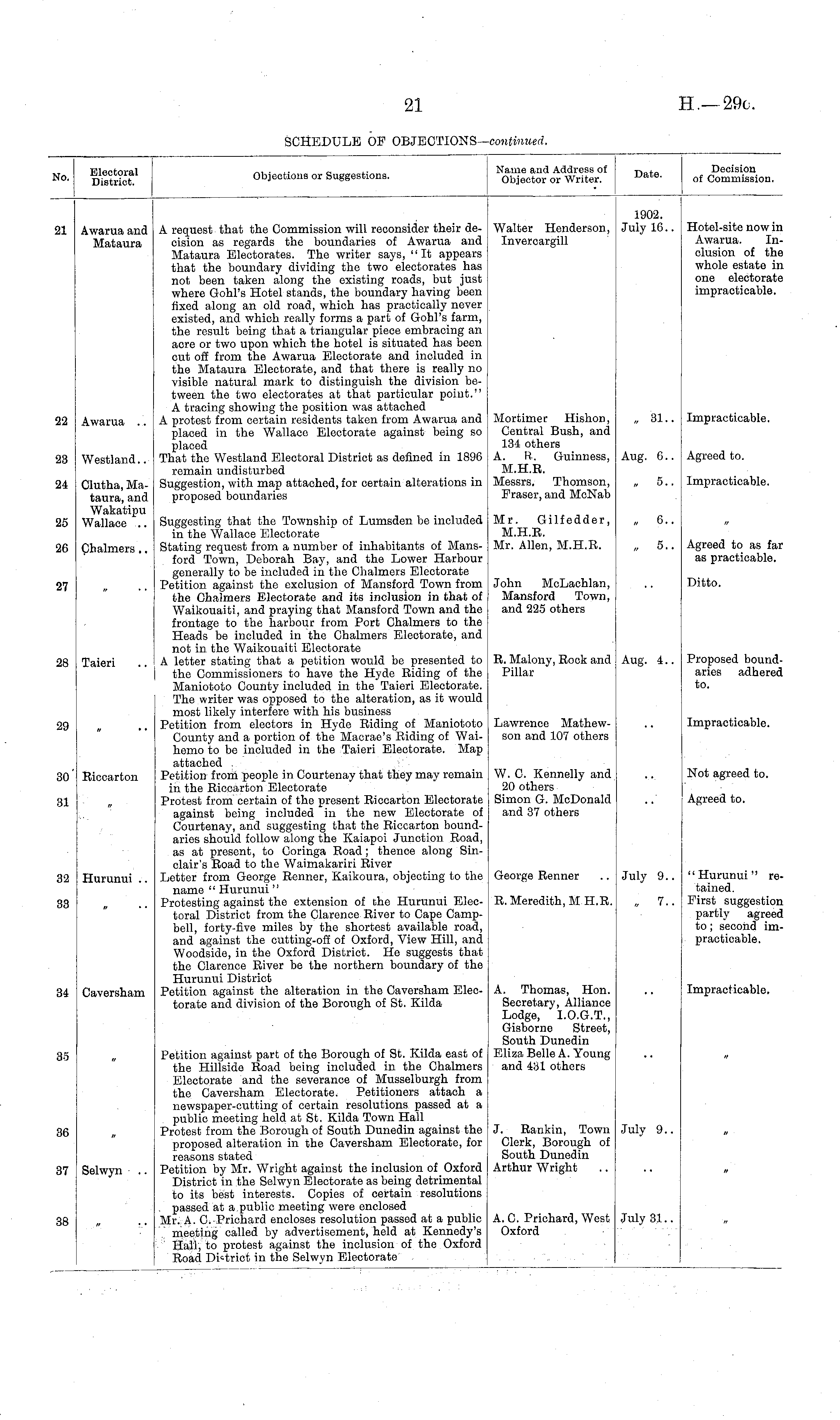 Electoral District. Objections or Suggestions. Name and Address of Objector or Writer. Date. Decision of Commission. to. A request that the Commission will reconsider their decision as regards the boundaries of Awarua and Mataura Electorates. The writer says, "It appears that the boundary dividing the two electorates has not been taken along the existing roads, but just where Gohl's Hotel stands, the boundary having been fixed along an old road, which has practically never existed, and which really forms a part of Gohl's farm, the result being that a triangular piece embracing an acre or two upon which the hotel is situated has been cut off from the Awarua Electorate and included in the Mataura Electorate, and that there is really no visible natural mark to distinguish the division between the two electorates at that particular point." A tracing showing the position was attached A protest from certain residents taken from Awarua and placed in the Wallace Electorate against being so placed That the Westland Electoral District as defined in 1896 remain undisturbed Suggestion, with map attached, for certain alterations in proposed boundaries 1902. July 16.. Hotel-site now in Awarua. Inclusion of the whole estate in one electorate impracticable. 21 Awarua and Mataura Walter Henderson, Invercargill Mortimer Hishon, Central Bush, and 134 others A. R. Guinness, M.H.R. Messrs. Thomson, Fraser, and McNab Impracticable. 22 Awarua .. . 31.. Westland.. Aug. 6.. Agreed to. 23 24 Clutha, Mataura, and Wakatipu Wallace .. , 5.Impracticable. Suggesting that the Township of Lumsden be included in the Wallace Electorate Stating request from a number of inhabitants of Mansford Town, Deborah Bay, and the Lower Harbour generally to be included in the Chalmers Electorate Petition against the exclusion of Mansford Town from the Chalmers Electorate and its inclusion in that of Waikouaiti, and praying that Mansford Town and the frontage to the harbour from Port Chalmers to the Heads be included in the Chalmers Electorate, and not in the Waikouaiti Electorate A letter stating that a petition would be presented to the Commissioners to have the Hyde Riding of the Maniototo County included in the Taieri Electorate. The writer was opposed to the alteration, as it would most likely interfere with his business Petition from electors in Hyde Riding of Maniototo County and a portion of the Macrae's Riding of Waihemo to be included in the Taieri Electorate. Map attached Petition from people in Courtenay that they may remain in the Riccarton Electorate Protest from certain of the present Riccarton Electorate against being included in the new Electorate of Courtenay, and suggesting that the Riccarton boundaries should follow along the Kaiapoi Junction Road, as at present, to Coringa Road; thence along Sinclair's Road to the Waimakariri River Letter from George Renner, Kaikoura, objecting to the name " Hurunui" Protesting against the extension of the Hurunui Electoral District from the Clarence River to Cape Campbell, forty-five miles by the shortest available road, and against the cutting-off of Oxford, View Hill, and Woodside, in the Oxford District. He suggests that the Clarence River be the northern boundary of the Hurunui District Petition against the alteration in the Caversham Electorate and division of the Borough of St. Kilda Mr. Gilfedder, M.H.R. Mr. Allen, M.H.R. „ 6.. 25 26 Chalmers.. „ 5.. Agreed to as far as practicable. 27 John McLachlan, Mansford Town, and 225 others Ditto. 28 Taieri R. Malony, Rock and Pillar Aug. 4.. Proposed boundaries adhered to. 29 Lawrence Mathewson and 107 others Impracticable. Riccarton W. C. Kennelly and 20 others Simon G. McDonald and 37 others Not agreed to. 30' 31 Agreed to. 32 33 Hurunui .. George Renner R. Meredith, M.H.R. July 9.. „ 7.. "Hurunui" retained. First suggestion partly agreed to; second impracticable. 34 Caversham A. Thomas, Hon. Secretary, Alliance Lodge, I.O.G.T., Gisborne Street, South Dunedin Eliza Belle A. Young and 431 others Impracticable. 35 Petition against part of the Borough of St. Kilda east of the Hillside Road being included in the Chalmers Electorate and the severance of Musselburgh from the Caversham Electorate. Petitioners attach a newspaper-cutting of certain resolutions passed at a public meeting held at St. Kilda Town Hall Protest from the Borough of South Dunedin against the proposed alteration in the Caversham Electorate, for reasons stated Petition by Mr. Wright against the inclusion of Oxford District in the Selwyn Electorate as being detrimental to its best interests. Copies of certain resolutions passed at a public meeting were enclosed Mr. A. C. Prichard encloses resolution passed at a public meeting called by advertisement, held at Kennedy's Hall, to protest against the inclusion of the Oxford Road District in the Selwyn Electorate a 36 J. Rankin, Town Clerk, Borough of South Dunedin Arthur Wright July 9.. 37 Selwyn 38 A. 0. Prichard, West Oxford July 31..