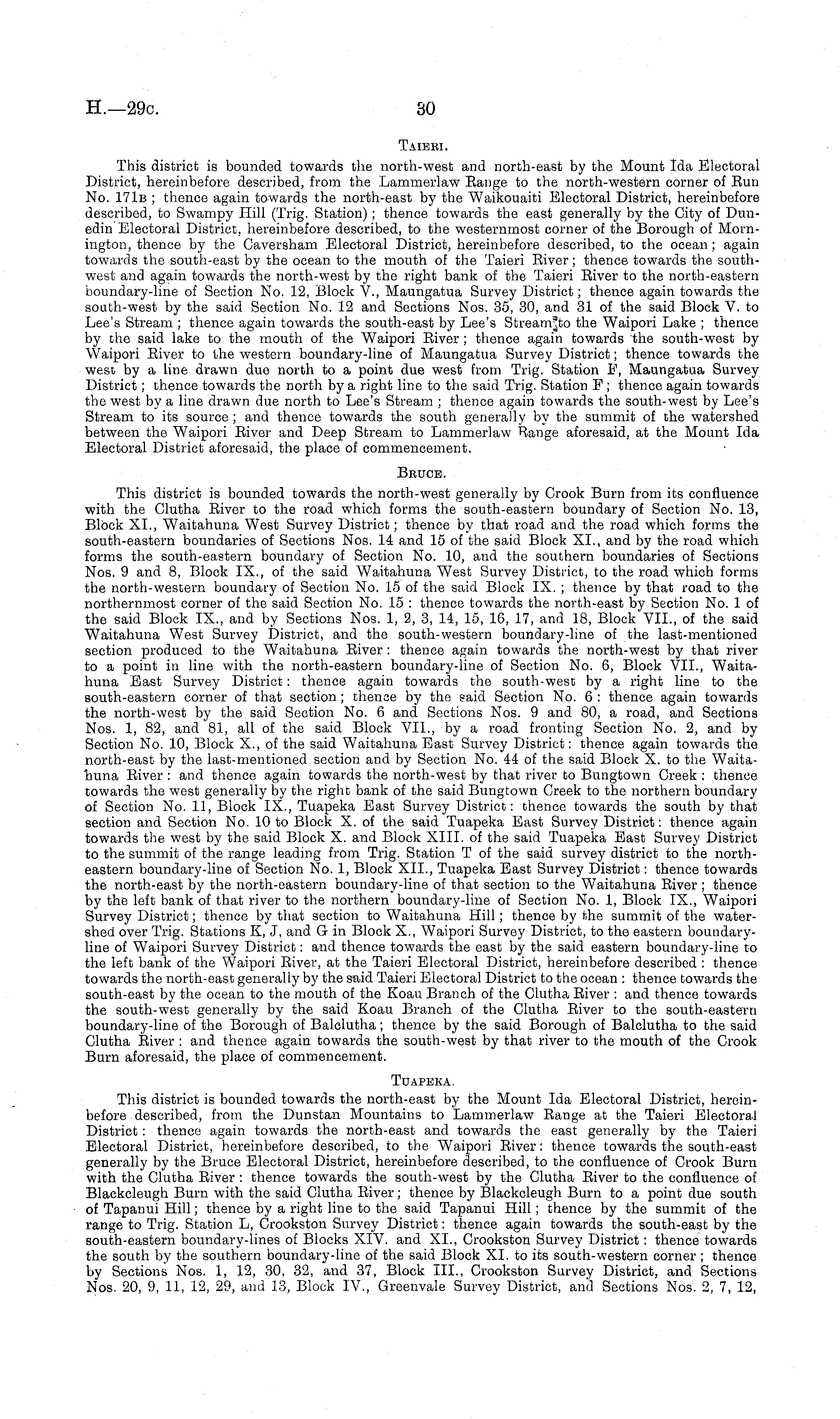 This district is bounded towards the north-west and north-east by the Mount Ida Electoral District, hereinbefore described, from the Lammerlaw Range to the north-western corner of Run No. 171b ; thence again towards the north-east by the Waikouaiti Electoral District, hereinbefore described, to Swampy Hill (Trig. Station) ; thence towards the east generally by the City of Dunedin Electoral District, hereinbefore described, to the westernmost corner of the Borough of Mornington, thence by the Caversham Electoral District, hereinbefore described, to the ocean; again towards the south-east by the ocean to the mouth of the Taieri River; thence towards the southwest and again towards the north-west by the right bank of the Taieri River to the north-eastern boundary-line of Section No. 12, Block V., Maungatua Survey District; thence again towards the south-west by the said Section No. 12 and Sections Nos. 35, 30, and 31 of the said Block V. to Lee's Stream ; thence again towards the south-east by Lee's the Waipori Lake ; thence by the said lake to the mouth of the Waipori River ; thence again towards the south-west by Waipori River to the western boundary-line of Maungatua Survey District; thence towards the west by a line drawn due north to a point due west from Trig. Station F, Maungatua Survey District; thence towards the north by a right line to the said Trig. Station F ; thence again towards the west by a line drawn due north to Lee's Stream ; thence again towards the south-west by Lee's Stream to its source ; and thence towards the south generally by the summit of the watershed between the Waipori River and Deep Stream to Lammerlaw Range aforesaid, at the Mount Ida Electoral District aforesaid, the place of commencement. Bruce. This district is bounded towards the north-west generally by Crook Burn from its confluence with the Clutha River to the road which forms the south-eastern boundary of Section No. 13, BlOck XL, Waitahuna West Survey District; thence by that road and the road which forms the south-eastern boundaries of Sections Nos. 14 and 15 of the said Block XL, and by the road which forms the south-eastern boundary of Section No. 10, and the southern boundaries of Sections Nos. 9 and 8, Block IX., of the said Waitahuna West Survey District, to the road which forms the north-western boundary of Section No. 15 of the said Block IX. ; thence by that road to the northernmost corner of the said Section No. 15 : thence towards the north-east by Section No. 1 of the said Block IX., and by Sections Nos. 1, 2, 3, 14, 15, 16, 17, and 18, Block VII., of the said Waitahuna West Survey District, and the south-western boundary-line of the last-mentioned section produced to the Waitahuna River : thence again towards the north-west by that river to a point in line with the north-eastern boundary-line of Section No. 6, Block VII., Waitahuna East Survey District: thence again towards the south-west by a right line to the south-eastern corner of that section; thence by the said Section No. 6 : thence again towards the north-west by the said Section No. 6 and Sections Nos. 9 and 80, a road, and Sections Nos. 1, 82, and 81, all of the said Block VII., by a road fronting Section No. 2, and by Section No. 10, Block X., of the said Waitahuna East Survey District: thence again towards the north-east by the last-mentioned section and by Section No. 44 of the said Block X. to the Waitahuna River : and thence again towards the north-west by that river to Bungtown Creek : thence towards the west generally by the right bank of the said Bungtown Creek to the northern boundary of Section No. 11, Block IX., Tuapeka East Survey District: thence towards the south by that section and Section No. 10 to Block X. of the said Tuapeka East Survey District: thence again towards the west by the said Block X. and Block XIII. of the said Tuapeka East Survey District to the summit of the range leading from Trig. Station T of the said survey district to the northeastern boundary-line of Section No. 1, Block XII., Tuapeka East Survey District: thence towards the north-east by the north-eastern boundary-line of that section to the Waitahuna River ; thence by the left bank of that river to the northern boundary-line of Section No. 1, Block IX., Waipori Survey District; thence by that section to Waitahuna Hill; thence by the summit of the watershed over Trig. Stations K, J, and G in Block X., Waipori Survey District, to the eastern boundaryline of Waipori Survey District: and thence towards the east by the said eastern boundary-line to the left bank of the Waipori River, at the Taieri Electoral District, hereinbefore described : thence towards the north-east generally by the said Taieri Electoral District to the ocean : thence towards the south-east by the ocean to the mouth of the Koau Branch of the Clutha River : and thence towards the south-west generally by the said Koau Branch of the Clutha River to the south-eastern boundary-line of the Borough of Balelutha; thence by the said Borough of Balclutha to the said Clutha River : and thence again towards the south-west by that river to the mouth of the Crook Burn aforesaid, the place of commencement. Tuapeka. This district is bounded towards the north-east by the Mount Ida Electoral District, hereinbefore described, from the Dunstan Mountains to Lammerlaw Range at the Taieri Electoral District : thence again towards the north-east and towards the east generally by the Taieri Electoral District, hereinbefore described, to the Waipori River: thence towards the south-east generally by the Bruce Electoral District, hereinbefore described, to the confluence of Crook Burn with the Clutha River : thence towards the south-west by the Clutha River to the confluence of Blackcleugh Burn with the said Clutha River; thence by Blackcleugh Burn to a point due south of Tapanui Hill; thence by a right line to the said Tapanui Hill; thence by the summit of the range to Trig. Station L, Crookston 