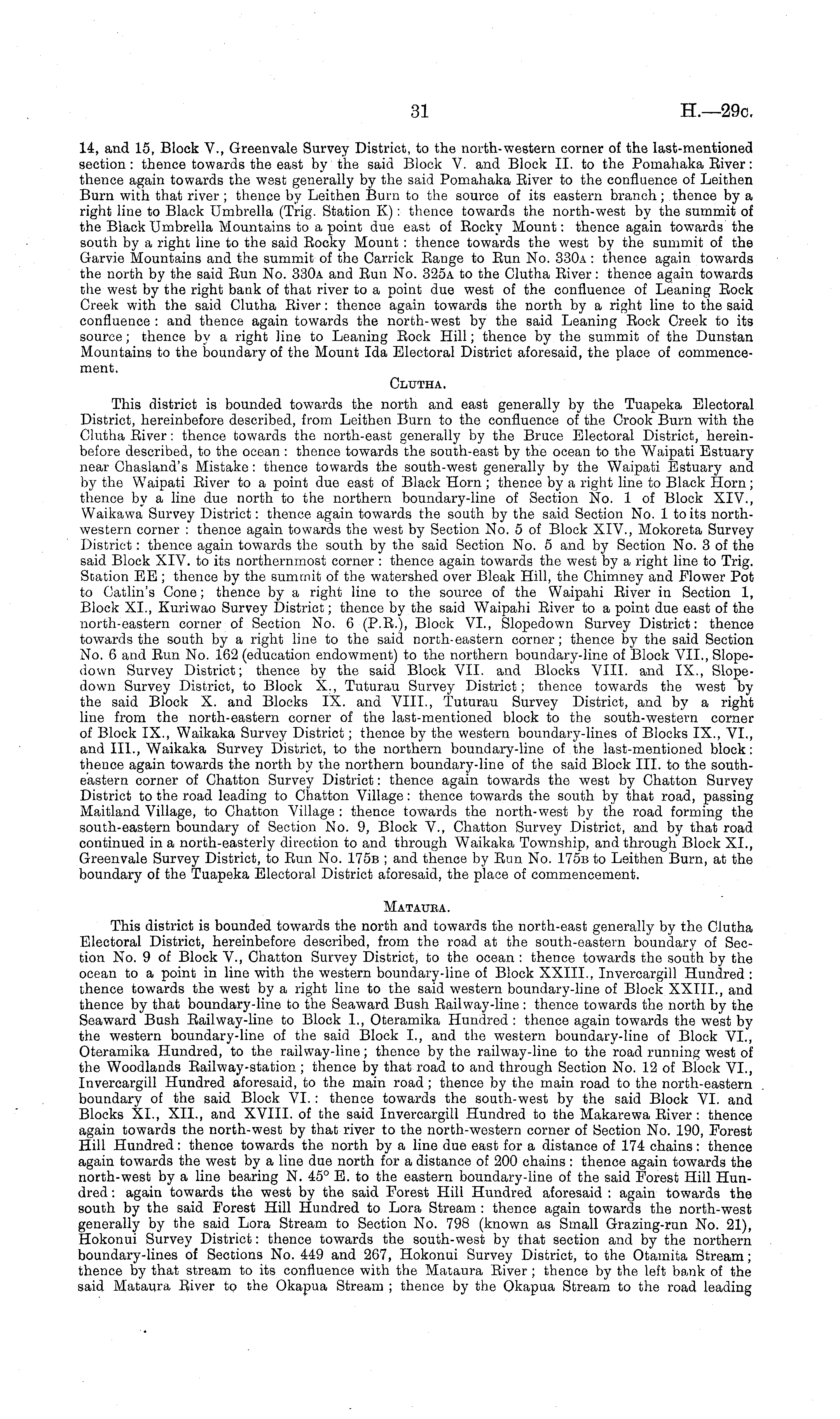 14, and 15, Block V., Greenvale Survey District, to the north-western corner of the last-mentioned section: thence towards the east by the said Block V. and Block 11. to the Pomahaka River: thence again towards the west generally by the said Pomahaka River to the confluence of Leithen Burn with that river ; thence by Leithen Burn to the source of its eastern branch; thence by a right line to Black Umbrella (Trig. Station K) : thence towards the north-west by the summit of the Black Umbrella Mountains to a point due east of Rocky Mount: thence again towards the south by a right line to the said Rocky Mount : thence towards the west by the summit of the Garvie Mountains and the summit of the Carrick Range to Run No. 330a : thence again towards the north by the said Run No. 330a and Run No. 325a to the Clutha River: thence again towards the west by the right bank of that river to a point due west of the confluence of Leaning Rock Creek with the said Clutha River: thence again towards the north by a right line to the said confluence : and thence again towards the north-west by the said Leaning Rock Creek to its source; thence by a right line to Leaning Rock Hill; thence by the summit of the Dunstan Mountains to the boundary of the Mount Ida Electoral District aforesaid, the place of commencement. Clutha. This district is bounded towards the north and east generally by the Tuapeka Electoral District, hereinbefore described, from Leithen Burn to the confluence of the Crook Burn with the Clutha River: thence towards the north-east generally by the Bruce Electoral District, hereinbefore described, to the ocean : thence towards the south-east by the ocean to the Waipati Estuary near Chasland's Mistake : thence towards the south-west generally by the Waipati Estuary and by the Waipati River to a point due east of Black Horn; thence by a right line to Black Horn; thence by a line due north to the northern boundary-line of Section No. 1 of Block XIV., Waikawa Survey District: thence again towards the south by the said Section No. Ito its northwestern corner : thence again towards the west by Section No. 5 of Block XIV., Mokoreta Survey District: thence again towards the south by the said Section No. 5 and by Section No. 3of the said Block XIV. to its northernmost corner : thence again towards the west by a right line to Trig. Station EE ; thence by the summit of the watershed over Bleak Hill, the Chimney and Flower Pot to Catlin's Cone; thence by a right line to the source of the Waipahi River in Section 1, Block XL, Kuriwao Survey District; thence by the said Waipahi River to a point due east of the north-eastern corner of Section No. 6 (P.R.), Block VI., Slopedown Survey District: thence towards the south by a right line to the said north-eastern corner; thence by the said Section No. 6 and Run No. 162 (education endowment) to the northern boundary-line of Block VII., Slopedown Survey District; thence by the said Block VII. and Blocks VIII. and IX., Slopedown Survey District, to Block X., Tuturau Survey District; thence towards the west by the said Block X. and Blocks IX. and VIII., Tuturau Survey District, and by a right line from the north-eastern corner of the last-mentioned block to the south-western corner of Block IX., Waikaka Survey District; thence by the western boundary-lines of Blocks IX., VI., and 111., Waikaka Survey District, to the northern boundary-line of the last-mentioned block: thence again towards the north by the northern boundary-line of the said Block 111. to the southeastern corner of Chatton Survey District: thence again towards the west by Chatton Survey District to the road leading to Chatton Village: thence towards the south by that road, passing Maitland Village, to Chatton Village : thence towards the north-west by the road forming the south-eastern boundary of Section No. 9, Block V., Chatton Survey District, and by that road continued in a north-easterly direction to and through Waikaka Township, and through Block XL, Greenvale Survey District, to Run No. 175b ; and thence by Run No. 175b to Leithen Burn, at the boundary of the Tuapeka Electoral District aforesaid, the place of commencement. Mataura. This district is bounded towards the north and towards the north-east generally by the Clutha Electoral District, hereinbefore described, from the road at the south-eastern boundary of Section No. 9 of Block V., Chatton Survey District, to the ocean : thence towards the south by the ocean to a point in line with the western boundary-line of Block XXIII., Invercargill Hundred : thence towards the west by a right line to the said western boundary-line of Block XXIII., and thence by that boundary-line to the Seaward Bush Railway-line : thence towards the north by the Seaward Bush Railway-line to Block L, Oteramika Hundred : thence again towards the west by the western boundary-line of the said Block 1., and the western boundary-line of Block VI., Oteramika Hundred, to the railway-line; thence by the railway-line to the road running west of the Woodlands Railway-station ; thence by that road to and through Section No. 12 of Block VI., Invercargill Hundred aforesaid, to the main road; thence by the main road to the north-eastern boundary of the said Block VI.: thence towards the south-west by the said Block VI. and Blocks XL, XII., and XVIII. of the said Invercargill Hundred to the Makarewa River : thence again towards the north-west by that river to the north-western corner of Section No. 190, Forest Hill Hundred: thence towards the north by a line due east for a distance of 174 chains: thence again towards the west by a line due north for a distance of 200 chains : thence again towards the north-west by a line bearing N. 45° E. to the eastern boundary-line of the said Forest Hill Hundred : again towards the west by the said Forest Hill Hundred aforesaid : again towards the south by the said Forest Hill Hundred to Lora Stream : thence again towards the north-west generall
