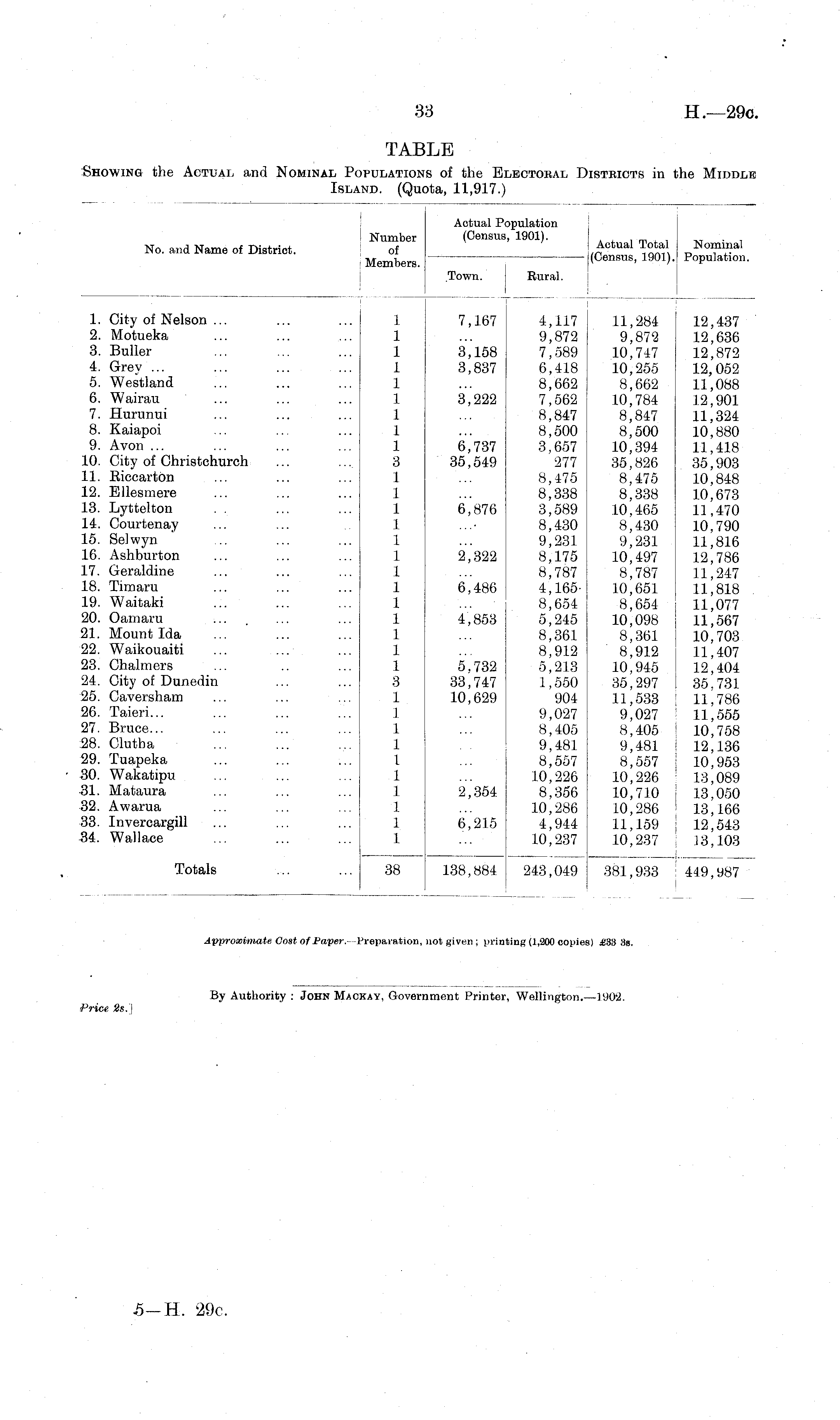 TABLE Showing the Actual and Nominal Populations of the Electoral Districts in the Middle Island. (Quota, 11,917.)