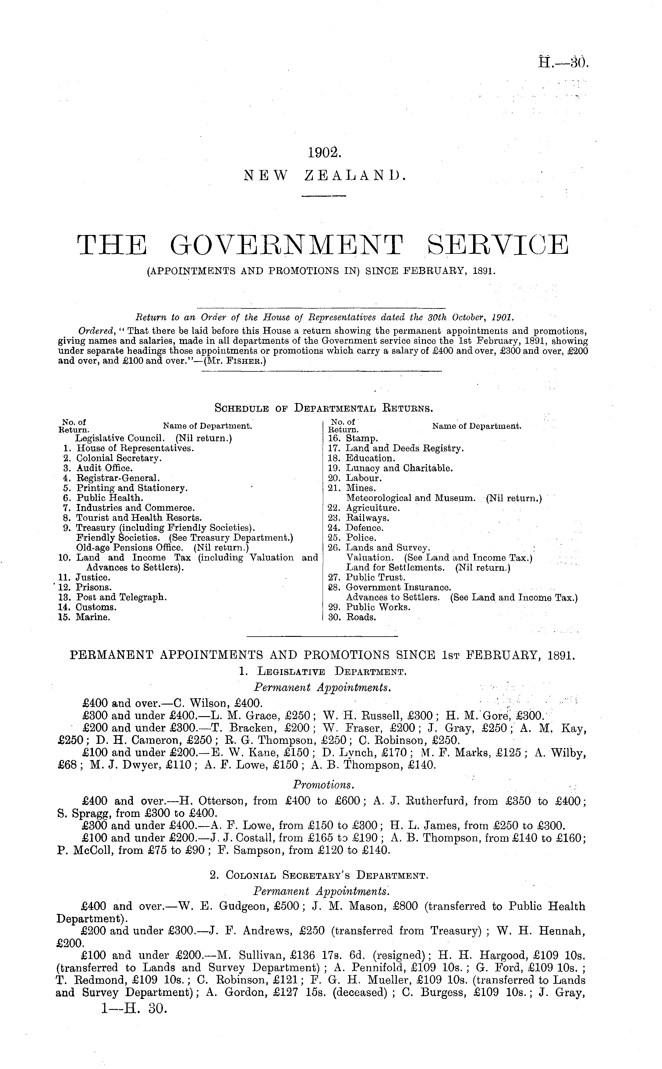 Return to an Order of the House of Representatives dated the 30th October, 1901. Ordered, " That there be laid before this House a return showing the permanent appointments and promotions, giving names and salaries, made in all departments of the Government service since the Ist February, 1891, showing under separate headings those appointments or promotions which carry a salary of £400 and over, £300 and over, £200 and over, and £100 and over."—(Mr. Fisheb.)