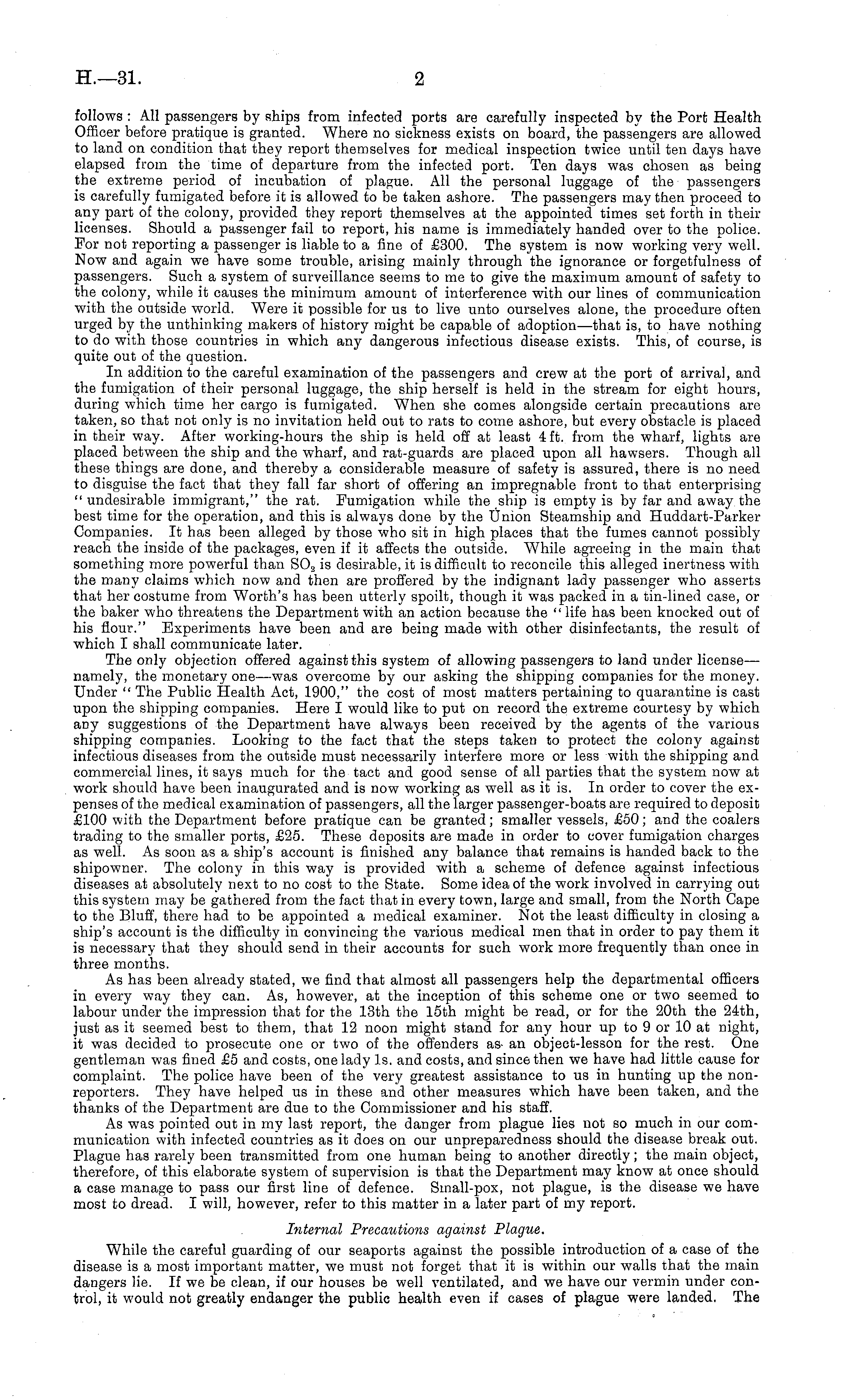 follows : All passengers by ships from infected ports are carefully inspected by the Port Health Officer before pratique is granted. Where no sickness exists on board, the passengers are allowed to land on condition that they report themselves for medical inspection twice until ten days have elapsed from the time of departure from the infected port. Ten days was chosen as being the extreme period of incubation of plague. All the personal luggage of the passengers is carefully fumigated before it is allowed to be taken ashore. The passengers may then proceed to any part of the colony, provided they report themselves at the appointed times set forth in their licenses. Should a passenger fail to report, his name is immediately handed over to the police. For not reporting a passenger is liable to a fine of £300. The system is now working very well. Now and again we have some trouble, arising mainly through the ignorance or forgetfulness of passengers. Such a system of surveillance seems to me to give the maximum amount of safety to the colony, while it causes the minimum amount of interference with our lines of communication with the outside world. Were it possible for us to live unto ourselves alone, the procedure often urged by the unthinking makers of history might be capable of adoption—that is, to have nothing to do with those countries in which any dangerous infectious disease exists. This, of course, is quite out of the question. In addition to the careful examination of the passengers and crew at the port of arrival, and the fumigation of their personal luggage, the ship herself is held in the stream for eight hours, during which time her cargo is fumigated. When she comes alongside certain precautions are taken, so that not only is no invitation held out to rats to come ashore, but every obstacle is placed in their way. After working-hours the ship is held off at least 4 ft. from the wharf, lights are placed between the ship and the wharf, and rat-guards are placed upon all hawsers. Though all these things are done, and thereby a considerable measure of safety is assured, there is no need to disguise the fact that they fall far short of offering an impregnable front to that enterprising " undesirable immigrant," the rat. Fumigation while the ship is empty is by far and away the best time for the operation, and this is always done by the Union Steamship and Huddart-Parker Companies. It has been alleged by those who sit in high places that the fumes cannot possibly reach the inside of the packages, even if it affects the outside. While agreeing in the main that something more powerful than SO 2 is desirable, it is difficult to reconcile this alleged inertness with the many claims which now and then are proffered by the indignant lady passenger who asserts that her costume from Worth's has been utterly spoilt, though it was packed in a tin-lined case, or the baker who threatens the Department with an action because the " life has been knocked out of his flour." Experiments have been and are being made with other disinfectants, the result of which I shall communicate later. The only objection offered against this system of allowing passengers to land under license— namely, the monetary one—was overcome by our asking the shipping companies for the money. Under " The Public Health Act, 1900," the cost of most matters pertaining to quarantine is cast upon the shipping companies. Here I would like to put on record the extreme courtesy by which any suggestions of the Department have always been received by the agents of the various shipping companies. Looking to the fact that the steps taken to protect the colony against infectious diseases from the outside must necessarily interfere more or less with the shipping and commercial lines, it says much for the tact and good sense of all parties that the system now at work should have been inaugurated and is now working as well as it is. In order to cover the expenses of the medical examination of passengers, all the larger passenger-boats are required to deposit £100 with the Department before pratique can be granted; smaller vessels, £50; and the coalers trading to the smaller ports, £25. These deposits are made in order to cover fumigation charges as well. As soon as a ship's account is finished any balance that remains is handed back to the shipowner. The colony in this way is provided with a scheme of defence against infectious diseases at absolutely next to no cost to the State. Some idea of the work involved in carrying out this system may be gathered from the fact that in every town, large and small, from the North Cape to the Bluff, there had to be appointed a medical examiner. Not the least difficulty in closing a ship's account is the difficulty in convincing the various medical men that in order to pay them it is necessary that they should send in their accounts for such work more frequently than once in three months. As has been already stated, we find that almost all passengers help the departmental officers in every way they can. As, however, at the inception of this scheme one or two seemed to labour under the impression that for the 13th the 15th might be read, or for the 20th the 24th, just as it seemed best to them, that 12 noon might stand for any hour up to 9 or 10 at night, it was decided to prosecute one or two of the offenders as an object-lesson for the rest. One gentleman was fined £5 and costs, one lady Is. and costs, and since then we have had little cause for complaint. The police have been of the very greatest assistance to us in hunting up the nonreporters. They have helped us in these and other measures which have been taken, and the thanks of the Department are due to the Commissioner and his staff. As was pointed out in my last report, the danger from plague lies not so much in our communication with infected countries as it does on our unpreparedness should the disease break out. Plague has rarely bee