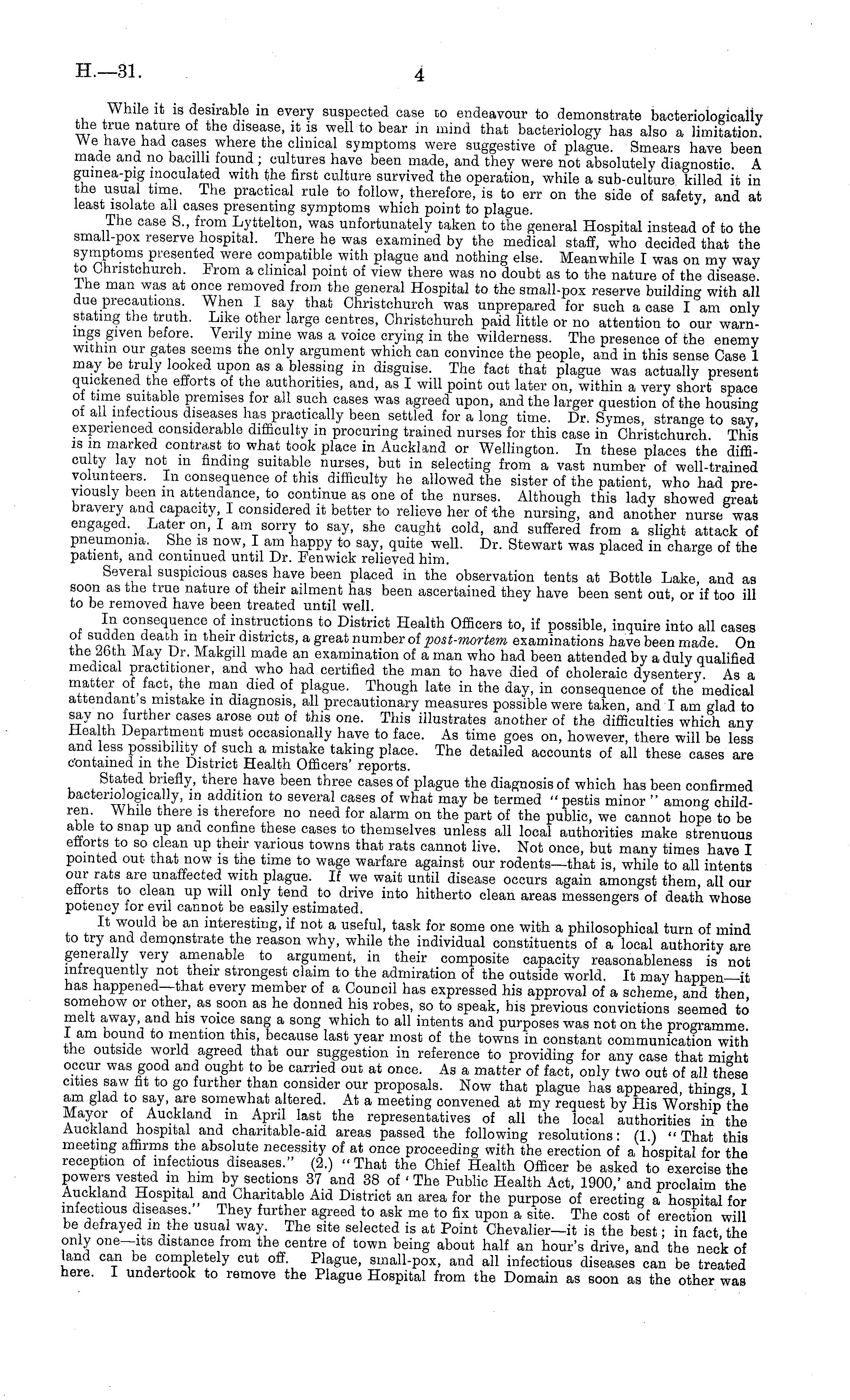 While it is desirable in every suspected case to endeavour to demonstrate the true nature of the disease, it is well to bear in mind that bacteriology has also a limitation We have had cases where the clinical symptoms were suggestive of plague. Smears have been made and no bacilli found; cultures have been made, and they were not absolutely diagnostic A gumea-pig inoculated with the first culture survived the operation, while a sub-culture killed it in the usual time. The practical rule to follow, therefore, is to err on the side of safety, and at least isolate all cases presenting symptoms which point to plague. The case S., from Lyttelton, was unfortunately taken to the general Hospital instead of to the small-pox reserve hospital. There he was examined by the medical staff, who decided that the symptoms presented were compatible with plague and nothing else. Meanwhile I was on my way to Ohnstchurch. From a clinical point of view there was no doubt as to the nature of the disease me man was at once removed from the general Hospital to the small-pox reserve building with all due precautions. When I say that Christohurch was unprepared for such a case I°am only stating the truth. Like other large centres, Christchurch paid little or no attention to our warnings given before. Verily mine was a voice crying in the wilderness. The presence of the enemy within our gates seems the only argument which can convince the people, and in this sense Case 1 may be truly looked upon as a blessing in disguise. The fact that plague was actually present quickened the efforts of the authorities, and, as I will point out later on, within a very short space of time suitable premises for all such cases was agreed upon, and the larger question of the housing of all infectious diseases has practically been settled for a long time. Dr. Symes, strange to say experienced considerable difficulty in procuring trained nurses for this case in Christchurch This is m marked contrast to what took place in Auckland or Wellington. In these places the difficulty lay not m finding suitable nurses, but in selecting from a vast number of well-trained volunteers. In consequence of this difficulty he allowed the sister of the patient, who had previously been in attendance, to continue as one of the nurses. Although this lady showed great bravery and capacity, I considered it better to relieve her of the nursing, and another nurse was engaged. _ Later on, I am sorry to say, she caught cold, and suffered from a slight attack of pneumonia. She is now, lam happy to say, quite well. Dr. Stewart was placed in charge of the patient, and continued until Dr. Fenwick relieved him. Several suspicious cases have been placed in the observation tents at Bottle Lake and as soon as the true nature of their ailment has been ascertained they have been sent out, or if too ill to be removed have been treated until well. t T h °°° se( l? ence of instructions to District Health Officers to, if possible, inquire into all cases °l oc- t\* m r dlstrlcts > a B reat number of post-mortem examinations have been made On the 26th May Dr. Makgill made an examination of a man who had been attended by a duly qualified medical practitioner, and who had certified the man to have died of choleraic dysentery As a matter of_ fact, the man died of plague. Though late in the day, in consequence of the' medical attendant s mistake m diagnosis, all precautionary measures possible were taken, and I am glad to say no further cases arose out of this one. This illustrates another of the difficulties which any Health Department must occasionally have to face. As time goes on, however, there will be less and less possibility of such a mistake taking place. The detailed accounts of all these cases are Contained in the District Health Officers' reports. Stated briefly, there have been three cases of plague the diagnosis of which has been confirmed bacteriologically, in addition to several cases of what may be termed " pestis minor " among children. While there is therefore no need for alarm on the part of the public, we cannot hope to be able to snap up and confine these cases to themselves unless all local authorities make strenuous efforts to so clean up their various towns that rats cannot live. Not once, but many times have I pointed out that now is the time to wage warfare against our rodents—that is, while to all intents our rats are unaffected with plague. If we wait until disease occurs again amongst them, all our efforts to clean up will only tend to drive into hitherto clean areas messengers of death whose potency tor evil cannot be easily estimated. It would be an interesting, if not a useful, task for some one with a philosophical turn of mind to try and demonstrate the reason why, while the individual constituents of a local authority are generally very amenable to argument, in their composite capacity reasonableness is not infrequently not their strongest claim to the admiration of the outside world. It may happen—it has happened—that every member of a Council has expressed his approval of a scheme and then somehow or other, as soon as he donned his robes, so to speak, his previous convictions seemed to melt away and his voice sang a song which to all intents and purposes was not on the programme J. am bound to mention this, because last year most of the towns in constant communication with the outside world agreed that our suggestion in reference to providing for any case that might occur was good and ought to be carried out at once. As a matter of fact, only two out of all these cities saw nt to go further than consider our proposals. Now that plague has appeared things 1 am glad to say, are somewhat altered. At a meeting convened at my request by His Worship the Mayor of Auckland in April last the representatives of all the local authorities in the Auckland hospital and charitable-aid areas passed the following resolutions- (1) "That this meeting a