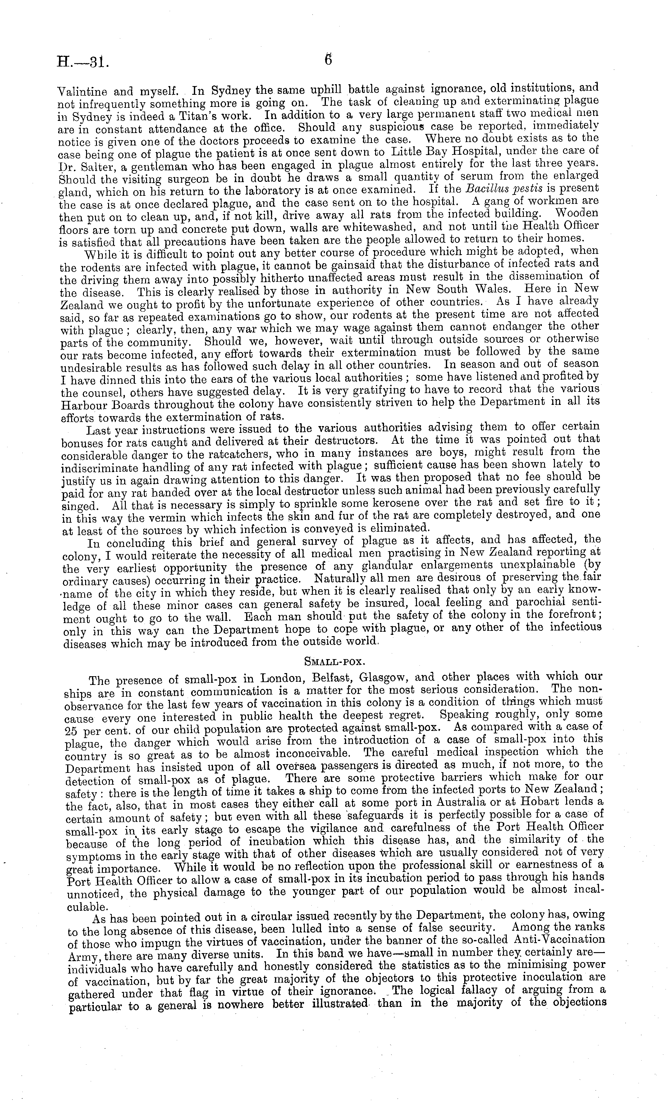 Valintine and myself. In Sydney the same uphill battle against ignorance, old institutions, and not infrequently something more is going on. The task of cleaning up and exterminating plague in Sydney is indeed a Titan's work. In addition to a very large permanent staff two medical men are in constant attendance at the office. Should any suspicious case be reported, immediately notice is given one of the doctors proceeds to examine the case. Where no doubt exists as to the case being one of plague the patient is at once sent down to Little Bay Hospital, under the care of Dr. Salter, a gentleman who has been engaged in plague almost entirely for the last three years. Should the visiting surgeon be in doubt he draws a small quantity of serum from the enlarged gland, which on his return to the laboratory is at once examined. If the Bacillus pestis is present the case is at once declared plague, and the case sent on to the hospital. A gang of workmen are then put on to clean up, and, if not kill, drive away all rats from the infected building. Wooden floors are torn up and concrete put down, walls are whitewashed, and not until tue Health Officer is satisfied that all precautions have been taken are the people allowed to return to their homes. While it is difficult to point out any better course of procedure which might be adopted, when the rodents are infected with plague, it cannot be gainsaid that the disturbance of infected rats and the drivin" them away into possibly hitherto unaffected areas must result in the dissemination of the disease. This is clearly realised by those in authority in New South Wales. Here in New Zealand we ought to profit by the unfortunate experience of other countries. As I have already said, so far as repeated examinations go to show, our rodents at the present time are not affected with plague ; clearly, then, any war which we. may wage against them cannot endanger the other parts of the community. Should we, however, wait until through outside sources or otherwise our rats become infected, any effort towards their extermination must be followed by the same undesirable results as has followed such delay in all other countries. In season and out of season I have dinned this into the ears of the various local authorities ; some have listened and profited by the counsel, others have suggested delay. It is very gratifying to have to record that the various Harbour Boards throughout the colony have consistently striven to help the Department in all its efforts towards the extermination of rats. Last year instructions were issued to the various authorities advising them to otter certain bonuses for rats caught and delivered at their destructors. At the time it was pointed out that considerable danger to the ratcatchers, who in many instances are boys, might result from the indiscriminate handling, of any rat infected with plague ; sufficient cause has been shown lately to justify us in again drawing attention to this danger. It was then proposed that no fee should be paid for any rat handed over at the local destructor unless such animal had been previously carefully singed. All that is necessary is simply to sprinkle some kerosene over the rat and set fire to it; in this way the vermin which infects the skin and fur of the rat are completely destroyed, and one at least of the sources by which infection is conveyed is eliminated. In concluding this brief and general survey of plague as it affects, and has affected, the colony I would reiterate the necessity of all medical men practising in New Zealand reporting at the very earliest opportunity the presence of any glandular enlargements unexplamable (by ordinary causes) occurring in their practice. Naturally all men are desirous of preserving the fair •name o"f the city in which they reside, but when it is clearly realised that only by an early knowledge of all these minor cases can general safety be insured, local feeling and parochial sentiment ought to go to the wall. Each man should put the safety of the colony in the forefront; only in this way can the Department hope to cope with plague, or any other of the infectious diseases which may be introduced from the outside world. Small-pox. The presence of small-pox in London, Belfast, Glasgow, and other places with which our ships are in constant communication is a matter for the most serious consideration. The nonobservance for the last few years of vaccination in this colony is a condition of things which must cause every one interested in public health the deepest regret. Speaking roughly, only some 25 per cent, of our child population are protected against small-pox. As compared with a case of plague the danger which would arise from the introduction of a case of small-pox into this countr'v is so great as to be almost inconceivable. The careful medical inspection which the Department has insisted upon of all oversea passengers is directed as much, if not more, to the detection of small-pox as of plague. There are some protective barriers which make for our safety : there is the length of time it takes a ship to come from the infected ports to New Zealand; the fact also, that in most case 3 they either call at some port in Australia or at Hobart lends a certain amount of safety; but even with all these safeguards it is perfectly possible for a case of small-pox in its early stage to escape the vigilance and carefulness of the Port Health Officer because of the long "period of incubation which this disease has, and the similarity of the symptoms in the early stage with that of other diseases which are usually considered not of very great importance. While it would be no reflection upon the professional skill or earnestness o! a Port Health Officer to allow a case of small-pox in its incubation period to pass through his hands unnoticed, the physical damage to the younger part of our population would be almost incalAs has been pointed out in a circular issued rec