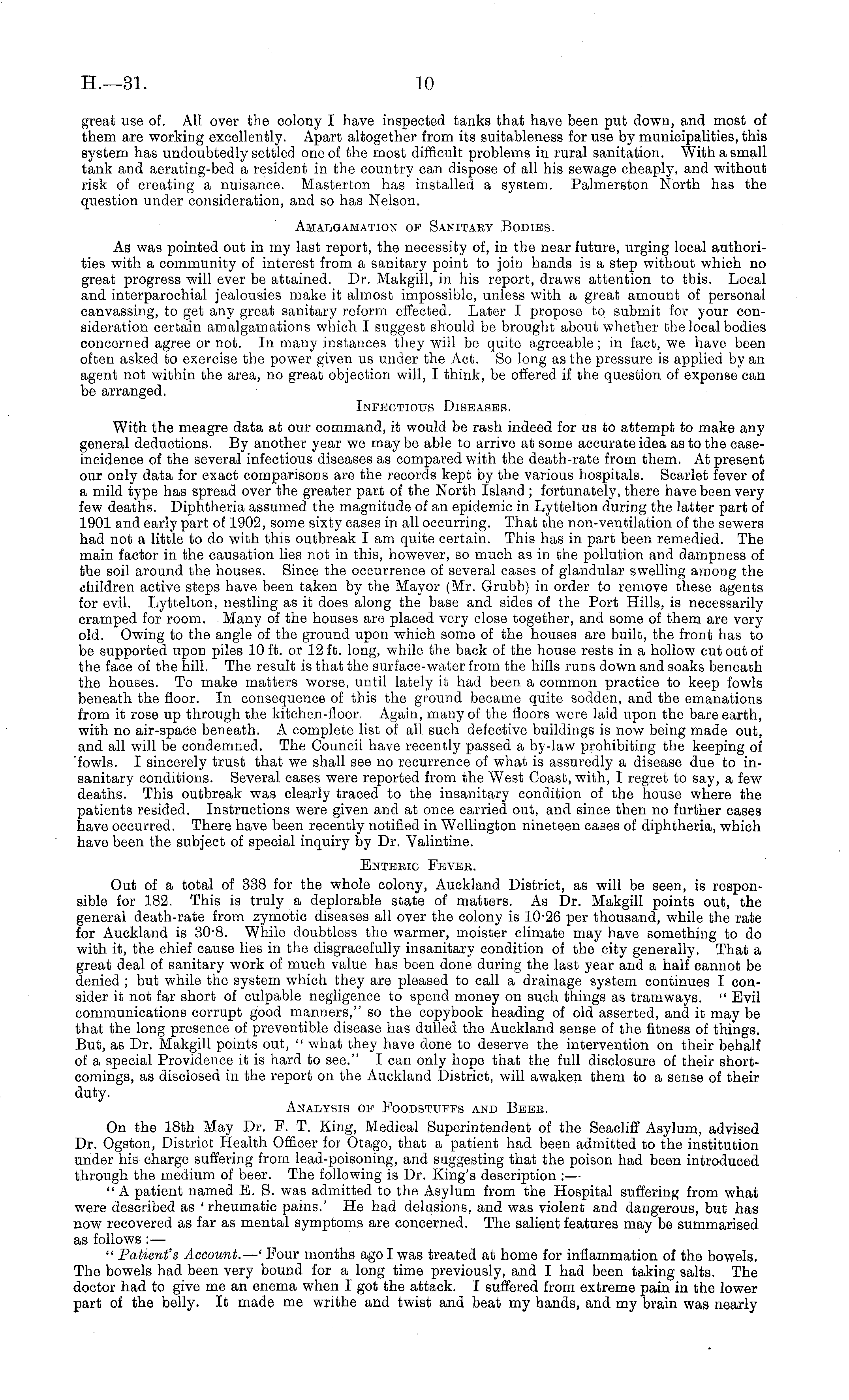 great use of. All over the colony I have inspected tanks that have been put down, and most of them are working excellently. Apart altogether from its suitableness for use by municipalities, this system has undoubtedly settled one of the most difficult problems in rural sanitation. With a small tank and aerating-bed a resident in the country can dispose of all his sewage cheaply, and without risk of creating a nuisance. Masterton has installed a system. Palmerston North has the question under consideration, and so has Nelson. Amalgamation of Sanitaey Bodies. As was pointed out in my last report, the necessity of, in the near future, urging local authorities with a community of interest from a sanitary point to join hands is a step without which no great progress will ever be attained. Dr. Makgill, in his report, draws attention to this. Local and interparochial jealousies make it almost impossible, unless with a great amount of personal canvassing, to get any great sanitary reform effected. Later I propose to submit for your consideration certain amalgamations which I suggest should be brought about whether the local bodies concerned agree or not. In many instances they will be quite agreeable; in fact, we have been often asked to exercise the power given us under the Act. So long as the pressure is applied by an agent not within the area, no great objection will, I think, be offered if the question of expense can be arranged. Infectious Diseases. With the meagre data at our command, it would be rash indeed for us to attempt to make any general deductions. By another year we may be able to arrive at some accurate idea as to the easeincidence of the several infectious diseases as compared with the death-rate from them. At present our only data for exact comparisons are the records kept by the various hospitals. Scarlet fever of a mild type has spread over the greater part of the North Island ; fortunately, there have been very few deaths. Diphtheria assumed the magnitude of an epidemic in Lyttelton during the latter part of 1901 and early part of 1902, some sixty cases in all occurring. That the non-ventilation of the sewers had not a little to do with this outbreak lam quite certain. This has in part been remedied. The main factor in the causation lies not in this, however, so much as in the pollution and dampness of the soil around the houses. Since the occurrence of several eases of glandular swelling among the children active steps have been taken by the Mayor (Mr. Grubb) in order to remove these agents for evil. Lyttelton, nestling as it does along the base and sides of the Port Hills, is necessarily cramped for room. Many of the houses are placed very close together, and some of them are very old. Owing to the angle of the ground upon which some of the houses are built, the front has to be supported upon piles 10 ft. or 12 ft. long, while the back of the house rests in a hollow cut out of the face of the hill. The result is that the surface-water from the hills runs down and soaks beneath the houses. To make matters worse, until lately it had been a common practice to keep fowls beneath the floor. In consequence of this the ground became quite sodden, and the emanations from it rose up through the kitchen-floor, Again, many of the floors were laid upon the bare earth, with no air-space beneath. A complete list of all such defective buildings is now being made out, and all will be condemned. The Council have recently passed a by-law prohibiting the keeping of fowls. I sincerely trust that we shall see no recurrence of what is assuredly a disease due to insanitary conditions. Several cases were reported from the West Coast, with, I regret to say, a few deaths. This outbreak was clearly traced to the insanitary condition of the house where the patients resided. Instructions were given and at once carried out, and since then no further cases have occurred. There have been recently notified in Wellington nineteen cases of diphtheria, which have been the subject of special inquiry by Dr. Valintine. Enteeic Feveb. Out of a total of 338 for the whole colony, Auckland District, as will be seen, is responsible for 182. This is truly a deplorable state of matters. As Dr. Makgill points out, the general death-rate from zymotic diseases all over the colony is 10-26 per thousand, while the rate for Auckland is 308. While doubtless the warmer, moister climate may have something to do with it, the chief cause lies in the disgracefully insanitary condition of the city generally. That a great deal of sanitary work of much value has been done during the last year and a half cannot be denied ; but while the system which they are pleased to call a drainage system continues I consider it not far short of culpable negligence to spend money on such things as tramways. " Evil communications corrupt good manners," so the copybook heading of old asserted, and it may be that the long presence of preventible disease has dulled the Auckland sense of the fitness of things. But, as Dr. Makgill points out, " what they have done to deserve the intervention on their behalf of a special Providence it is hard to see." I can only hope that the full disclosure of their shortcomings, as disclosed in the report on the Auckland District, will awaken them to a sense of their duty. Analysis op Foodstuffs and Beck. On the 18th May Dr. F. T. King, Medical Superintendent of the Seacliff Asylum, advised Dr. Ogston, District Health Officer foi Otago, that a patient had been admitted to the institution under his charge suffering from lead-poisoning, and suggesting that the poison had been introduced through the medium of beer. The following is Dr. King's description :— " A patient named E. S. was admitted to the Asylum from the Hospital suffering from what were described as 'rheumatic pains.' He had delusions, and was violent and dangerous, but has now recovered as far as mental symptoms are concerned. The salient features may be 