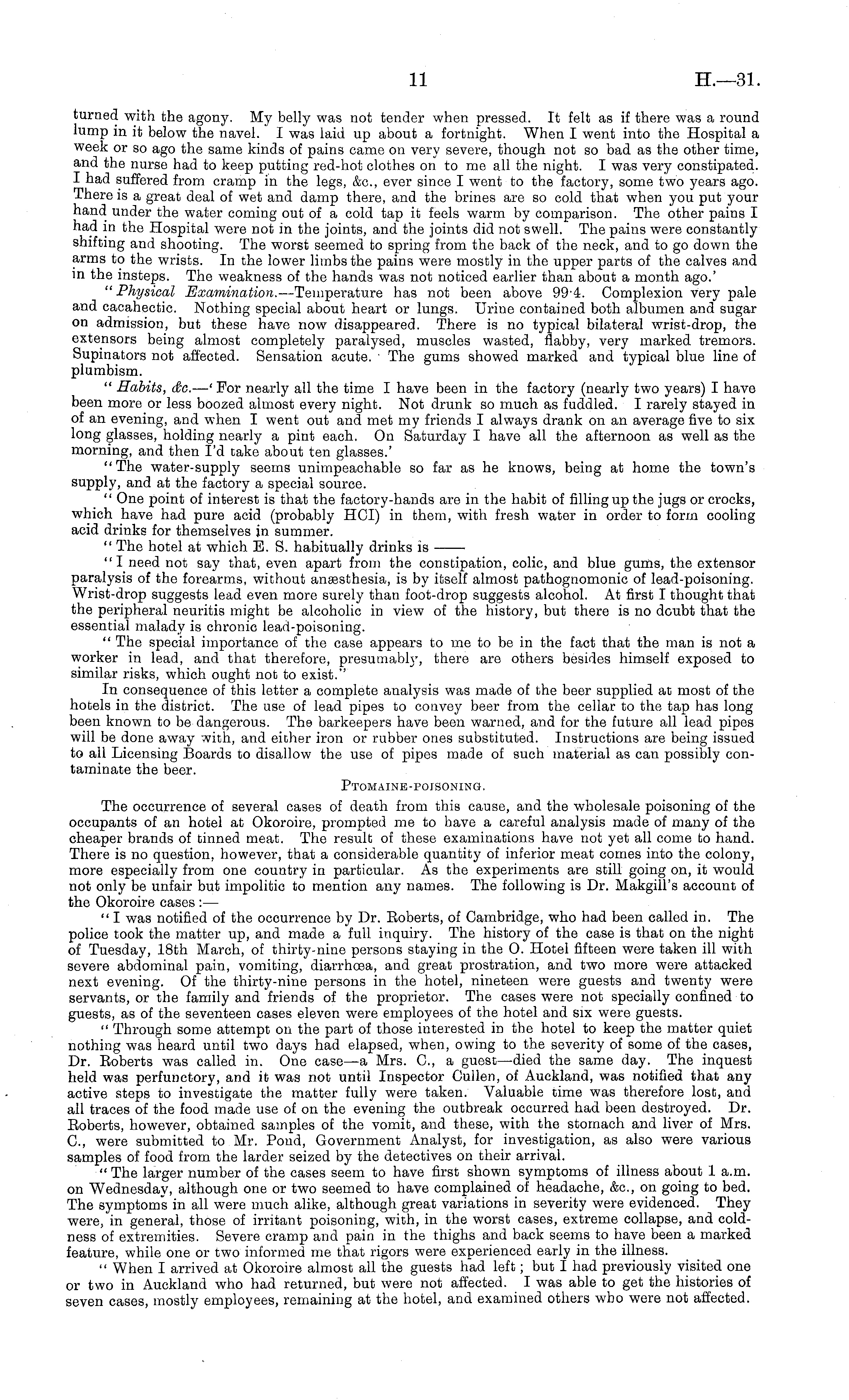turned with the agony. My belly was not tender when pressed. It felt as if there was a round lump in it below the navel. I was laid up about a fortnight. When I went into the Hospital a week or so ago the same kinds of pains came on very severe, though not so bad as the other time, and the nurse had to keep putting red-hot clothes on to me all the night. I was very constipated. I had suffered from cramp in the legs, &c, ever since I went to the factory, some two years ago. There is a great deal of wet and damp there, and the brines are so cold that when you put your hand under the water coming out of a cold tap it feels warm by comparison. The other pains I had in the Hospital were not in the joints, and the joints did not swell. The pains were constantly shifting and shooting. The worst seemed to spring from the back of the neck, and to go down the arms to the wrists. In the lower limbs the pains were mostly in the upper parts of the calves and in the insteps. The weakness of the hands was not noticed earlier than about a month ago.' " Physical Examination. —Temperature has not been above 994. Complexion very pale and cacahectic. Nothing special about heart or lungs. Urine contained both albumen and sugar on admission, but these have now disappeared. There is no typical bilateral wrist-drop, the extensors being almost completely paralysed, muscles wasted, flabby, very marked tremors. Supinators not affected. Sensation acute. The gums showed marked and typical blue line of plumbism. " Habits, dc. —' For nearly all the time I have been in the factory (nearly two years) I have been more or less boozed almost every night. Not drunk so much as fuddled. I rarely stayed in of an evening, and when I went out and met my friends I always drank on an average five to six long glasses, holding nearly a pint each. On Saturday I have all the afternoon as well as the morning, and then I'd take about ten glasses.' "The water-supply seems unimpeachable so far as he knows, being at home the town's supply, and at the factory a special source. " One point of interest is that the factory-hands are in the habit of filling up the jugs or crocks, which have had pure acid (probably HCI) in them, with fresh water in order to form cooling acid drinks for themselves in summer. " The hotel at which B. S. habitually drinks is ■ " I need not say that, even apart from the constipation, colic, and blue gums, the extensor paralysis of the forearms, without anesthesia, is by itself almost pathognomonic of lead-poisoning. Wrist-drop suggests lead even more surely than foot-drop suggests alcohol. At first I thought that the peripheral neuritis might be alcoholic in view of the history, but there is no doubt that the essential malady is chronic lead-poisoning. " The special importance of the case appears to me to be in the fact that the man is not a worker in lead, and that therefore, presumably, there are others besides himself exposed to similar risks, which ought not to exist." In consequence of this letter a complete analysis was made of the beer supplied at most of the hotels in the district. The use of lead pipes to convey beer from the cellar to the tap has long been known to be dangerous. The barkeepers have been warned, and for the future all lead pipes will be done away with, and either iron or rubber ones substituted. Instructions are being issued to all Licensing Boards to disallow the use of pipes made of such material as can possibly contaminate the beer. Ptomaine-pojsoning. The occurrence of several cases of death from this cause, and the wholesale poisoning of the occupants of an hotel at Okoroire, prompted me to have a careful analysis made of many of the cheaper brands of tinned meat. The result of these examinations have not yet all come to hand. There is no question, however, that a considerable quantity of inferior meat comes into the colony, more especially from one country in particular. As the experiments are still going on, it would not only be unfair but impolitic to mention any names. The following is Dr. Makgill's account of the Okoroire cases :— " I was notified of the occurrence by Dr. Eoberts, of Cambridge, who had been called in. The police took the matter up, and made a full inquiry. The history of the case is that on the night of Tuesday, 18th March, of thirty-nine persons staying in the 0. Hotel fifteen were taken ill with severe abdominal pain, vomiting, diarrhoea, and great prostration, and two more were attacked next evening. Of the thirty-nine persons in the hotel, nineteen were guests and twenty were servants, or the family and friends of the proprietor. The cases were not specially confined to guests, as of the seventeen cases eleven were employees of the hotel and six were guests. " Through some attempt on the part of those interested in the hotel to keep the matter quiet nothing was heard until two days had elapsed, when, owing to the severity of some of the cases, Dr. Eoberts was called in. One case —a Mrs. C, a guest —died the same day. The inquest held was perfunctory, and it was not until Inspector Cullen, of Auckland, was notified that any active steps to investigate the matter fully were taken. Valuable time was therefore lost, and all traces of the food made use of on the evening the outbreak occurred had been destroyed. Dr. Eoberts, however, obtained samples of the vomit, and these, with the stomach and liver of Mrs. C, were submitted to Mr. Pond, Government Analyst, for investigation, as also were various samples of food from the larder seized by the detectives on their arrival. " The larger number of the cases seem to have first shown symptoms of illness about 1 a.m. on Wednesday, although one or two seemed to have complained of headache, &c, on going to bed. The symptoms in all were much alike, although great variations in severity were evidenced. They were, in general, those of irritant poisoning, with, in the worst cases, extreme collapse, and coldness of ex