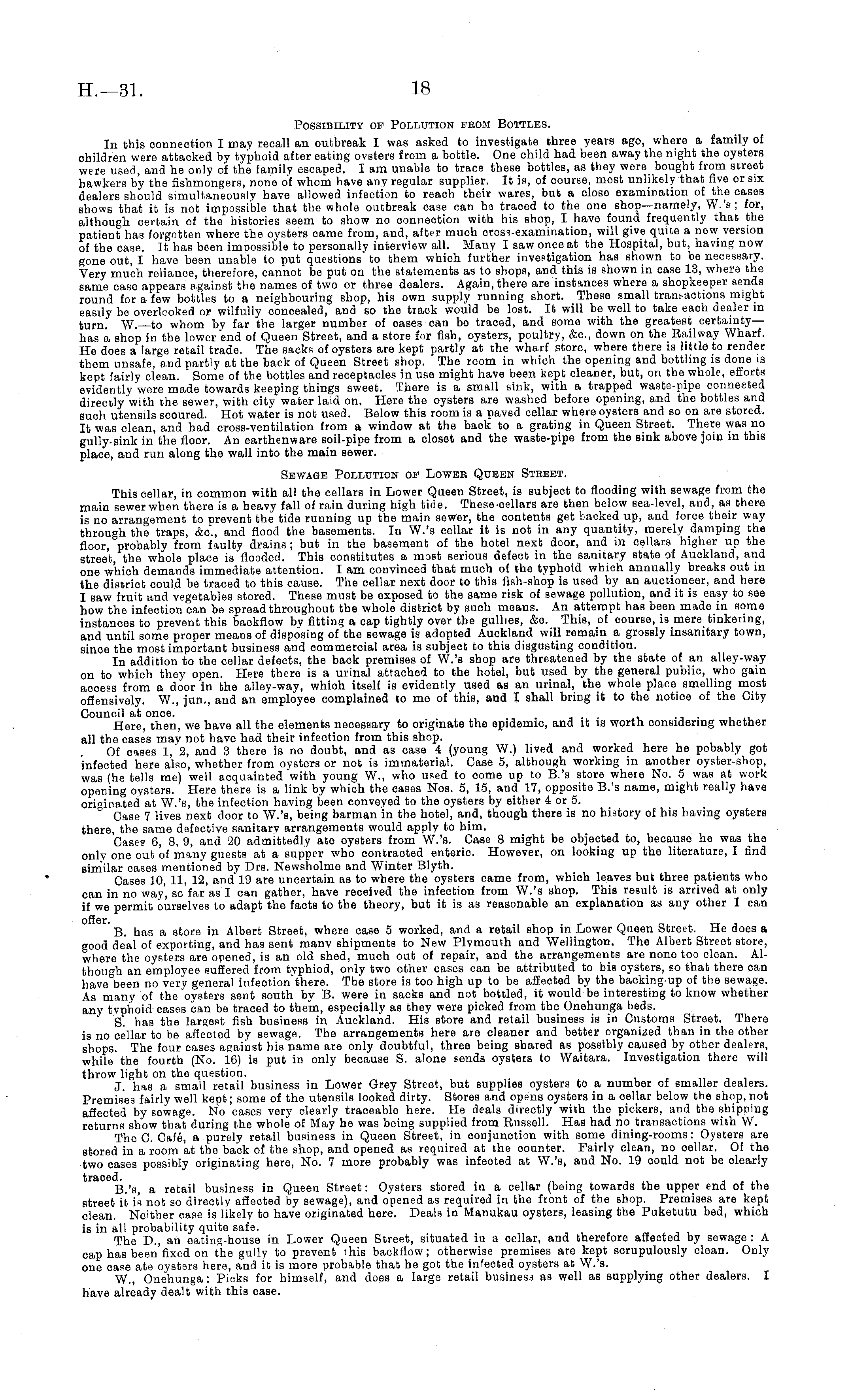 Possibility of Pollution from Bottles. In this connection I may recall an outbreak I was asked to investigate three years ago, where a family of children were attacked by typhoid after eating oysters from a bottle. One child had been away the night the oysters were used, and he only of the family escaped. lam unable to trace these bottles, as they were bought from street hawkers by the fishmongers, none of whom have any regular supplier. It is, of course, most unlikely that five or six dealers should simultaneously have allowed infection to reach their wares, but a close examination of the cases shows that it is not impossible that the whole outbreak case can bs traced to the one shop—namely, W.s; for, although certain of the histories seem to show no connection with his shop, I have found frequently that the patient has forgotten where the oysters came from, and, after much orosi-examination, will give quite a new version of the case. It has been impossible to personally interview all. Many I saw once at the Hospital, but, having now gone out, I have been unable to put questions to them which further investigation has shown to be necessary. Very much reliance, therefore, cannot be put on the statements as to shops, and this is shown in oase 13, where the same case appears against the names of two or three dealers. Again, there are instances where a shopkeeper sends round for a few bottles to a neighbouring shop, his own supply running short. These small trans-actions might easily be overlooked or wilfully concealed, and so the track would be lost. It will be well to take each dealer in turn. W. to whom by far the larger number of cases can be traced, and some with the greatest certainty— has a shop in the lower end of Queen Street, and a store for fish, oysters, poultry, &c, down on the Railway Wharf. He does a large retail trade. The sacks of oysters are kept partly at the wharf store, where there is little to render them unsafe, and partly at the back of Queen Street shop. The room in which the opening and bottling is done is kept fairly clean. Some of the bottles and receptacles in use might have been kept clearer, but, on the whole, efforts evidently were made towards keeping things sweet. There is a small sink, with a trapped waste-pipe connected directly with the sewer, with city water laid on. Here the oysters are washed before opening, and the bottles and such utensils scoured. Hot water is not used. Below this room is a paved cellar where oysters and so on are stored. It was clean, and had cross-ventilation from a window at the baok to a grating in Queen Street. There was no gully-sink in the floor. An earthenware soil-pipe from a closet and the waste-pipe from the sink above join in this place, and run along the wall into the main sewer. Sewage Pollution of Lower Qdeen Street. This cellar, in common with all the cellars in Lower Queen Street, is subject to flooding with sewage from the main sewer when there is a heavy fall of rain during high tide. These-cellars are then below sea-level, and, as there is no arrangement to prevent the tide running up the main sewer, the contents get backed up, and force their way through the traps, &c, and flood the basements. In W.s cellar it is not in any quantity, merely damping the floor, probably from faulty drains ; but in the basement of the hotel next door, and in cellars higher up the street, the whole place is flooded. This constitutes a most serious defect in the sanitary state of Auckland, and one which demands immediate attention. lam convinced that much of the typhoid which annually breaks out in the district could be traced to this cause. The cellar next door to this fish-shop is used by an auctioneer, and here I saw fruit and vegetables stored. These must be exposed to the same risk of sewage pollution, and it is easy to see how the infection can be spread throughout the whole district by such means. An attempt has been made in some instances to prevent this backflow by fitting a cap tightly over the gullies, &c. This, of course, is mere tinkering, and until some proper means of disposing of the sewage is adopted Auckland will remain a grossly insanitary town, since the most important business and oommeroial area is subject to this disgusting condition. In addition to the cellar defects, the back premises of W.s shop are threatened by the state of an alley-way on to which they open. Here there is a urinal attached to the hotel, but used by the general public, who gain access from a door in the alley-way, which itself is evidently used as an urinal, the whole place smelling most offensively. W., jun., and an employee complained to me of this, and I shall bring it to the notice of the City Council at once. . . Here, then, we have all the elements necessary to originate the epidemic, and it is worth considering whether all the cases may not have had their infection from this shop. Of cases 1, 2, and 3 there is no doubt, and as case i (young W.) lived and worked here he pobably got infected here also, whether from oysters or not is immaterial. Case 5, although working in another oyster-shop, was (he tells me) well acquainted with young W., who used to come up to B.s store where No. 5 was at work opening oysters. Here there is a link by which the cases Nos. 5, 15, and 17, opposite B.s name, might really have originated at W.s, the infection having been conveyed to the oysters by either 4 or 5. ° Case 7 lives next door to W.s, being barman in the hotel, and, though there is no history of his having oysters there, the same defective sanitary arrangements would apply to him. Cases 6, 8, 9, and 20 admittedly ate oysters from W.'s. Case 8 might be objected to, because he was the only one out of many guestH at a supper who contracted enteric. However, on looking up the literature, I find similar cases mentioned by Drs. Newsholme and Winter Blyth. Cases 10, 11, 12, and 19 are uncertain as to where the oysters came from, which leaves bu