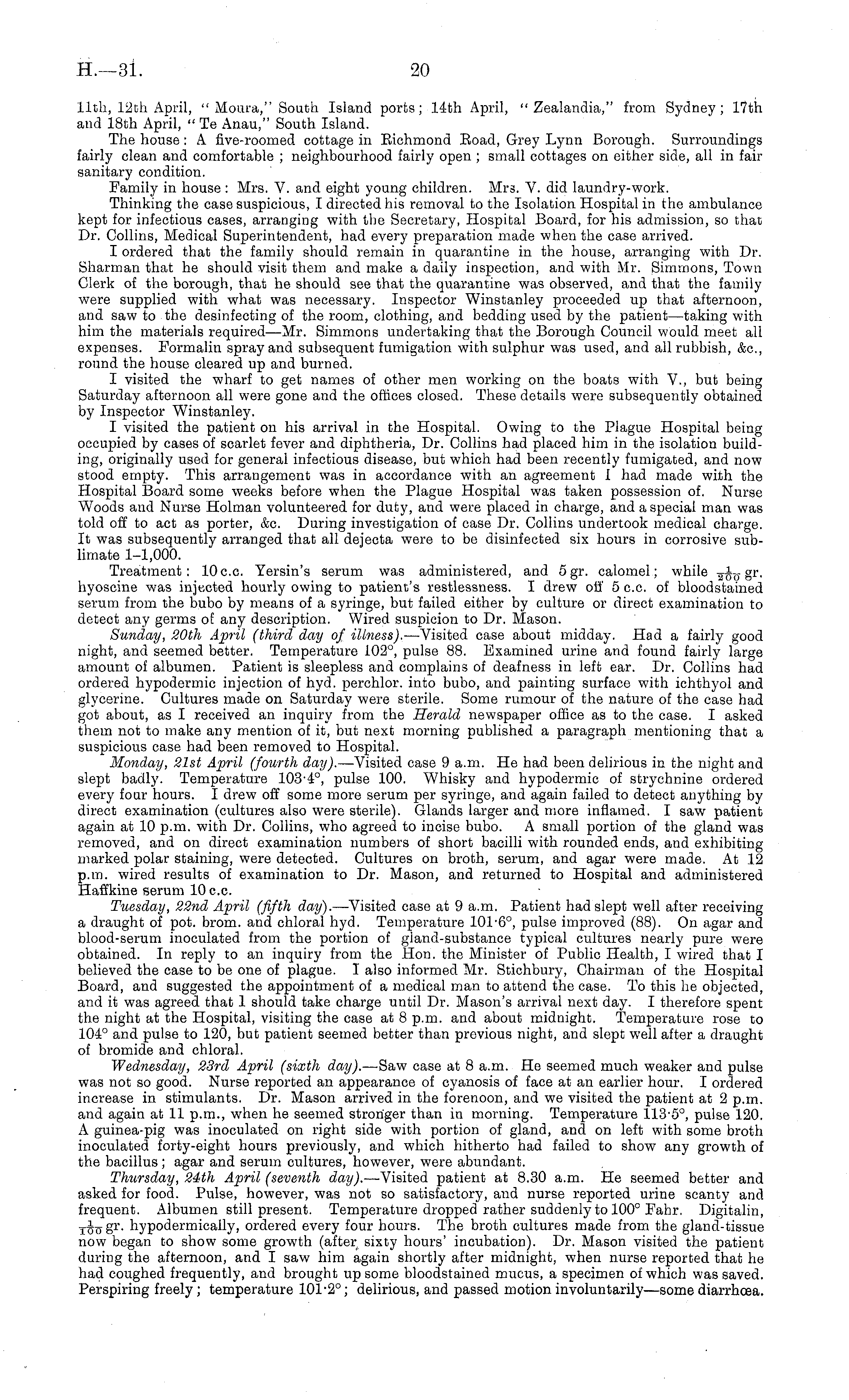 llth, 12th April, " Moura," South Island ports; 14th April, " Zealandia," from Sydney; 17th and 18th April, " Te Anau," South Island. The house : A five-roomed cottage in Bichmond Eoad, Grey Lynn Borough. Surroundings fairly clean and comfortable ; neighbourhood fairly open ; small cottages on either side, all in fair sanitary condition. Family in house : Mrs. V. and eight young children. Mrs. V. did laundry-work. Thinking the case suspicious, I directed his removal to the Isolation Hospital in the ambulance kept for infectious cases, arranging with the Secretary, Hospital Board, for his admission, so that Dr. Collins, Medical Superintendent, had every preparation made when the case arrived. I ordered that the family should remain in quarantine in the house, arranging with Dr. Sbarman that he should visit them and make a daily inspection, and with Mr. Simmons, Town Clerk of the borough, that he should see that the quarantine was observed, and that the family were supplied with what was necessary. Inspector Winstanley proceeded up that afternoon, and saw to the desinfecting of the room, clothing, and bedding used by the patient—taking with him the materials required—Mr. Simmons undertaking that the Borough Council would meet all expenses. Formalin spray and subsequent fumigation with sulphur was used, and all rubbish, &c, round the house cleared up and burned. I visited the wharf to get names of other men working on the boats with V., but being Saturday afternoon all were gone and the offices closed. These details were subsequently obtained by Inspector Winstanley. I visited the patient on his arrival in the Hospital. Owing to the Plague Hospital being occupied by cases of scarlet fever and diphtheria, Dr. Collins had placed him in the isolation building, originally used for general infectious disease, but which had been recently fumigated, and now stood empty. This arrangement was in accordance with an agreement I had made with the Hospital Board some weeks before when the Plague Hospital was taken possession of. Nurse Woods and Nurse Holman volunteered for duty, and were placed in charge, and a special man was told off to act as porter, &c. During investigation of case Dr. Collins undertook medical charge. It was subsequently arranged that all dejecta were to be disinfected six hours in corrosive sublimate 1-1,000. Treatment: lOc.c. Yersin's serum was administered, and sgr. calomel; while gr. hyoscine was injected hourly owing to patient's restlessness. I drew off 5 c.c. of bloodstained serum from the bubo by means of a syringe, but failed either by culture or direct examination to detect any germs of any description. Wired suspicion to Dr. Mason. Sunday, 20th April (third day of illness). —Visited case about midday. Had a fairly good night, and seemed better. Temperature 102°, pulse 88. Examined urine and found fairly large amount of albumen. Patient is sleepless and complains of deafness in left ear. Dr. Collins had ordered hypodermic injection of hyd. perchlor. into bubo, and painting surface with ichthyol and glycerine. Cultures made on Saturday were sterile. Some rumour of the nature of the case had got about, as I received an inquiry from the Herald newspaper office as to the case. I asked them not to make any mention of it, but next morning published a paragraph mentioning that a suspicious case had been removed to Hospital. Monday, 21st April (fourth day). —Visited case 9 a.m. He had been delirious in the night and slept badly. Temperature 1034°, pulse 100. Whisky and hypodermic of strychnine ordered every four hours. I drew off some more serum per syringe, and again failed to detect anything by direct examination (cultures also were sterile). Glands larger and more inflamed. I saw patient again at 10 p.m. with Dr. Collins, who agreed to incise bubo. A small portion of the gland was removed, and on direct examination numbers of short bacilli with rounded ends, and exhibiting marked polar staining, were detected. Cultures on broth, serum, and agar were made. At 12 p.m. wired results of examination to Dr. Mason, and returned to Hospital and administered Haffkine serum 10 c.c. Tuesday, 22nd April (fifth day). —Visited case at 9 a.m. Patient had slept well after receiving a draught of pot. brom. and chloral hyd. Temperature 101-6°, pulse improved (88). On agar and blood-serum inoculated from the portion of gland-substance typical cultures nearly pure were obtained. In reply to an inquiry from the Hon. the Minister of Public Health, I wired that I believed the case to be one of plague. I also informed Mr. Stichbury, Chairman of the Hospital Board, and suggested the appointment of a medical man to attend the case. To this he objected, and it was agreed that 1 should take charge until Dr. Mason's arrival next day. I therefore spent the night at the Hospital, visiting the case at 8 p.m. and about midnight. Temperature rose to 104° and pulse to 120, but patient seemed better than previous night, and slept well after a draught of bromide and chloral. Wednesday, 23rd April (sixth day). —Saw case at 8 a.m. He seemed much weaker and pulse was not so good. Nurse reported an appearance of cyanosis of face at an earlier hour. I ordered increase in stimulants. Dr. Mason arrived in the forenoon, and we visited the patient at 2 p.m. and again at 11 p.m., when he seemed stronger than in morning. Temperature 113 - s°, pulse 120. A guinea-pig was inoculated on right side with portion of gland, and on left with some broth inoculated forty-eight hours previously, and which hitherto had failed to show any growth of the bacillus; agar and serum cultures, however, were abundant. Thursday, 24th April (seventh day). —Visited patient at 8.30 a.m. He seemed better and asked for food. Pulse, however, was not so satisfactory, and nurse reported urine scanty and frequent. Albumen still present. Temperature dropped rather suddenly to 100° Fahr. Digitalin, gr. hypodermicaily, ordered every four
