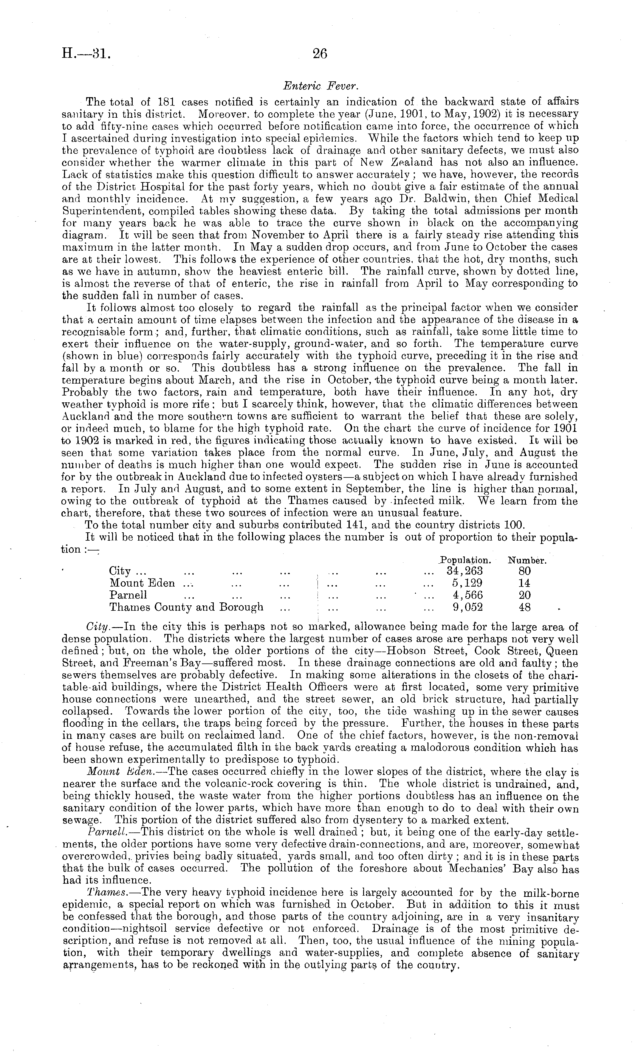 Enteric Fever. The total of 181 cases notified is certainly an indication of the backward state of affairs sanitary in this district. Moreover, to complete the year (June, 1901, to May, 1902) it is necessary to add fifty-nine cases which occurred before notification came into force, the occurrence of which I ascertained during investigation into special epidemics. While the factors which tend to keep up the prevalence of typhoid are doubtless lack of drainage and other sanitary defects, we must also consider whether the warmer climate in this part of New Zealand has not also an influence. Lack of statistics make this question difficult to answer accurately ; we have, however, the records of the District Hospital for the past forty years, which no doubt give a fair estimate of the annual and monthly incidence. At my suggestion, a few years ago Dr. Baldwin, then Chief Medical Superintendent, compiled tables showing these data. By taking the total admissions per month for many years back he was able to trace the curve shown in black on the accompanying diagram. It will be seen that from November to April there is a fairly steady rise attending this maximum in the latter month. In May a sudden drop occurs, and from June to October the cases are at their lowest. This follows the experience of other countries, that the hot, dry months, such as we have in autumn, show the heaviest enteric bill. The rainfall curve, shown by dotted line, is almost the reverse of that of enteric, the rise in rainfall from April to May corresponding to the sudden fall in number of cases. It follows almost too closely to regard the rainfall as the principal factor when we consider that a certain amount of time elapses between the infection and the appearance of the disease in a recognisable form; and, further, that climatic conditions, such as rainfall, take some little time to exert their influence on the water-supply, ground-water, and so forth. The temperature curve (shown in blue) corresponds fairly accurately with the typhoid curve, preceding it in the rise and fall by a month or so. This doubtless has a strong influence on the prevalence. The fall in temperature begins about March, and the rise in October, 'the typhoid curve being a month later. Probably the two factors, rain and temperature, both have their influence. In any hot, dryweather typhoid is more rife; but I scarcely think, however, that the climatic differences between Auckland and the more southern towns are sufficient to warrant the belief that these are solely, or indeed much, to blame for the high typhoid rate. On the chart the curve of incidence for 1901 to 1902 is marked in red, the figures indicating those actually known to have existed. It will be seen that some variation takes place from the normal curve. In June, July, and August the number of deaths is much higher than one would expect. The sudden rise in June is accounted for by the outbreak in Auckland due to infected oysters —a subject on which I have already furnished a report. In July and August, and to some extent in September, the line is higher than normal, owing to the outbreak of typhoid at the Thames caused by infected milk. We learn from the chart, therefore, that these two sources of infection were an unusual feature. To the total number city and suburbs contributed 141, and the country districts 100. It will be noticed that in the following places the number is out of proportion to their population :— Population. Number. City ... ... ... ... , ... ... ... 34,263 80 Mount Eden ... ... ... ! ... ... ... 5,129 14 Parnell ... ... ... ... ... ' ... 4,566 20 Thames County and Borough ... ... ... ... 9,052 48 City. —ln the city this is perhaps not so marked, allowance being made for the large area of dense population. The districts where the largest number of cases arose are perhaps not very well defined ; but, on the whole, the older portions of the city—Hobson Street, Cook Street, Queen Street, and Freeman's Bay—suffered most. In these drainage connections are old and faulty ; the sewers themselves are probably defective. In making some alterations in the closets of the chari-table-aid buildings, where the District Health Officers were at first located, some very primitive house connections were unearthed, and the street sewer, an old brick structure, had partially collapsed. Towards the lower portion of the city, too, the tide washing up in the sewer causes flooding in the cellars, the traps being forced by the pressure. Further, the houses in these parts in many cases are built on reclaimed land. One of the chief factors, however, is the non-removal of house refuse, the accumulated filth in the back yards creating a malodorous condition which has been shown experimentally to predispose to typhoid. Mount Isden. —The cases occurred chiefly in the lower slopes of the district, where the clay is nearer the surface and the volcanic-rock covering is thin. The whole district is undrained, and, being thickly housed, the waste water from the higher portions doubtless has an influence on the sanitary condition of the lower parts, which have more than enough to do to deal with their own sewage. This portion of the district suffered also from dysentery to a marked extent. Parnell. —This district on the whole is well drained ; but, it being one of the early-day settlements, the older portions have some very defective drain-connections, and are, moreover, somewhat overcrowded,, privies being badly situated, yards small, and too often dirty ; and it is in these parts that the bulk of cases occurred. The pollution of the foreshore about Mechanics' Bay also has had its influence. Thames. —The very heavy typhoid incidence here is largely accounted for by the milk-borne epidemic, a special report on which was furnished in October. But in addition to this it must be confessed that the borough, and those parts of the country adjoining, are in a very insanitary condition —nightsoi
