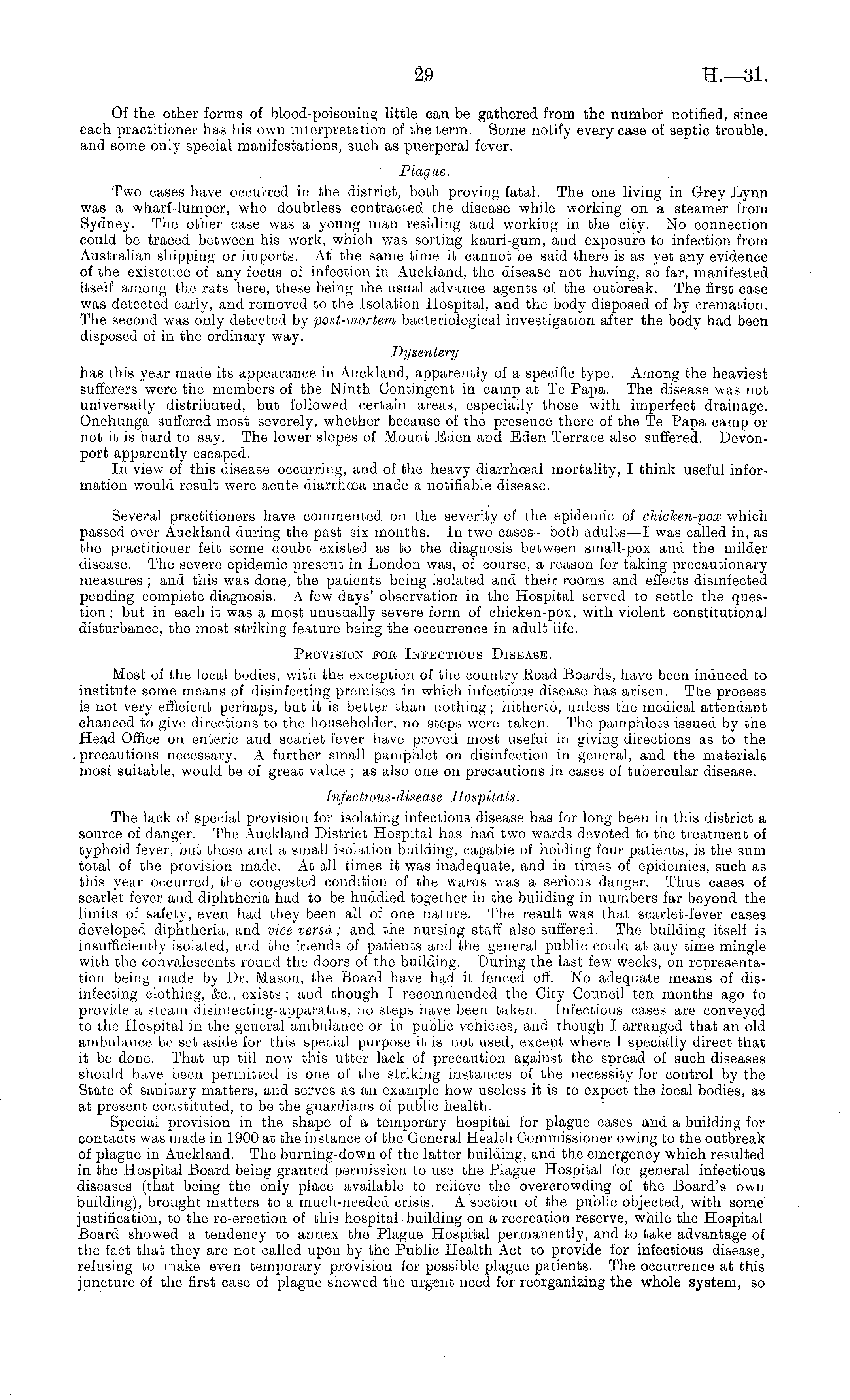 Of the other forms of blood-poisoning little can be gathered from the number notified, since each practitioner has his own interpretation of the term. Some notify every case of septic trouble, and some only special manifestations, such as puerperal fever. Plague. Two cases have occurred in the district, both proving fatal. The one living in Grey Lynn was a wharf-lumper, who doubtless contracted the disease while working on a steamer from Sydney. The other case was a young man residing and working in the city. No connection could be traced between his work, which was sorting kauri-gum, and exposure to infection from Australian shipping or imports. At the same time it cannot be said there is as yet any evidence of the existence of any focus of infection in Auckland, the disease not having, so far, manifested itself among the rats here, these being the usual advance agents of the outbreak. The first case was detected early, and removed to the Isolation Hospital, and the body disposed of by cremation. The second was only detected by post-?nortem bacteriological investigation after the body had been disposed of in the ordinary way. Dysentery has this year made its appearance in Auckland, apparently of a specific type. Among the heaviest sufferers were the members of the Ninth Contingent in camp at Te Papa. The disease was not universally distributed, but followed certain areas, especially those with imperfect drainage. Onehunga suffered most severely, whether because of the presence there of the Te Papa camp or not it is hard to say. The lower slopes of Mount Eden and Eden Terrace also suffered. Devonport apparently escaped. In view of this disease occurring, and of the heavy diarrhoeal mortality, I think useful information would result were acute diarrhoea made a notifiable disease. Several practitioners have commented on the severity of the epidemic of chicken-pox which passed over Auckland during the past six months. In two cases —both adults —I was called in, as the practitioner felt some doubt existed as to the diagnosis between small-pox and the milder disease. The severe epidemic present in London was, of course, a reason for taking precautionary measures ; and this was done, the patients being isolated and their rooms and effects disinfected pending complete diagnosis. A few days' observation in the Hospital served to settle the question ; but in each it was a most unusually severe form of chicken-pox, with violent constitutional disturbance, the most striking feature being the occurrence in adult life. Provision foe Infectious Disease. Most of the local bodies, with the exception of the country Boad Boards, have been induced to institute some means of disinfecting premises in which infectious disease has arisen. The process is not very efficient perhaps, but it is better than nothing; hitherto, unless the medical attendant chanced to give directions to the householder, no steps were taken. The pamphlets issued by the Head Office on enteric and scarlet fever have proved most useful in giving directions as to the precautions necessary. A further small pamphlet on disinfection in general, and the materials most suitable, would be of great value ; as also one on precautions in cases of tubercular disease. Infectious-disease Hospitals. The lack of special provision for isolating infectious disease has for long been in this district a source of danger. The Auckland District Hospital has had two wards devoted to the treatment of typhoid fever, but these and a small isolation building, capable of holding four patients, is the sum total of the provision made. At all times it was inadequate, and in times of epidemics, such as this year occurred, the congested condition of the wards was a serious danger. Thus cases of scarlet fever and diphtheria had to be huddled together in the building in numbers far beyond the limits of safety, even had they been all of one nature. The result was that scarlet-fever cases developed diphtheria, and vice versa; and the nursing staff also suffered. The building itself is insufficiently isolated, and the friends of patients and the general public could at any time mingle with the convalescents round the doors of the building. During the last few weeks, on representation being made by Dr. Mason, the Board have had it fenced off. No adequate means of disinfecting clothing, &c, exists; and though I recommended the City Council ten months ago to provide a steam disinfecting-apparatus, no steps have been taken. Infectious cases are conveyed to the Hospital in the general ambulance or in public vehicles, and though I arranged that an old ambulance be set aside for this special purpose it is not used, except where I specially direct that it be done. That up till now this utter lack of precaution against the spread of such diseases should have been permitted is one of the striking instances of the necessity for control by the State of sanitary matters, and serves as an example how useless it is to expect the local bodies, as at present constituted, to be the guardians of public health. Special provision in the shape of a temporary hospital for plague cases and a building for contacts was made in 1900 at the instance of the General Health Commissioner owing to the outbreak of plague in Auckland. The burning-down of the latter building, and the emergency which resulted in the Hospital Board being granted permission to use the Plague Hospital for general infectious diseases (that being the only place available to relieve the overcrowding of the Board's own building), brought matters to a much-needed crisis. A section of the public objected, with some justification, to the re-erection of this hospital building on a recreation reserve, while the Hospital Board showed a tendency to annex the Plague Hospital permanently, and to take advantage of the fact that they are not called upon by the Public Health Act to provide for infectious disease, refusing to make even temporar
