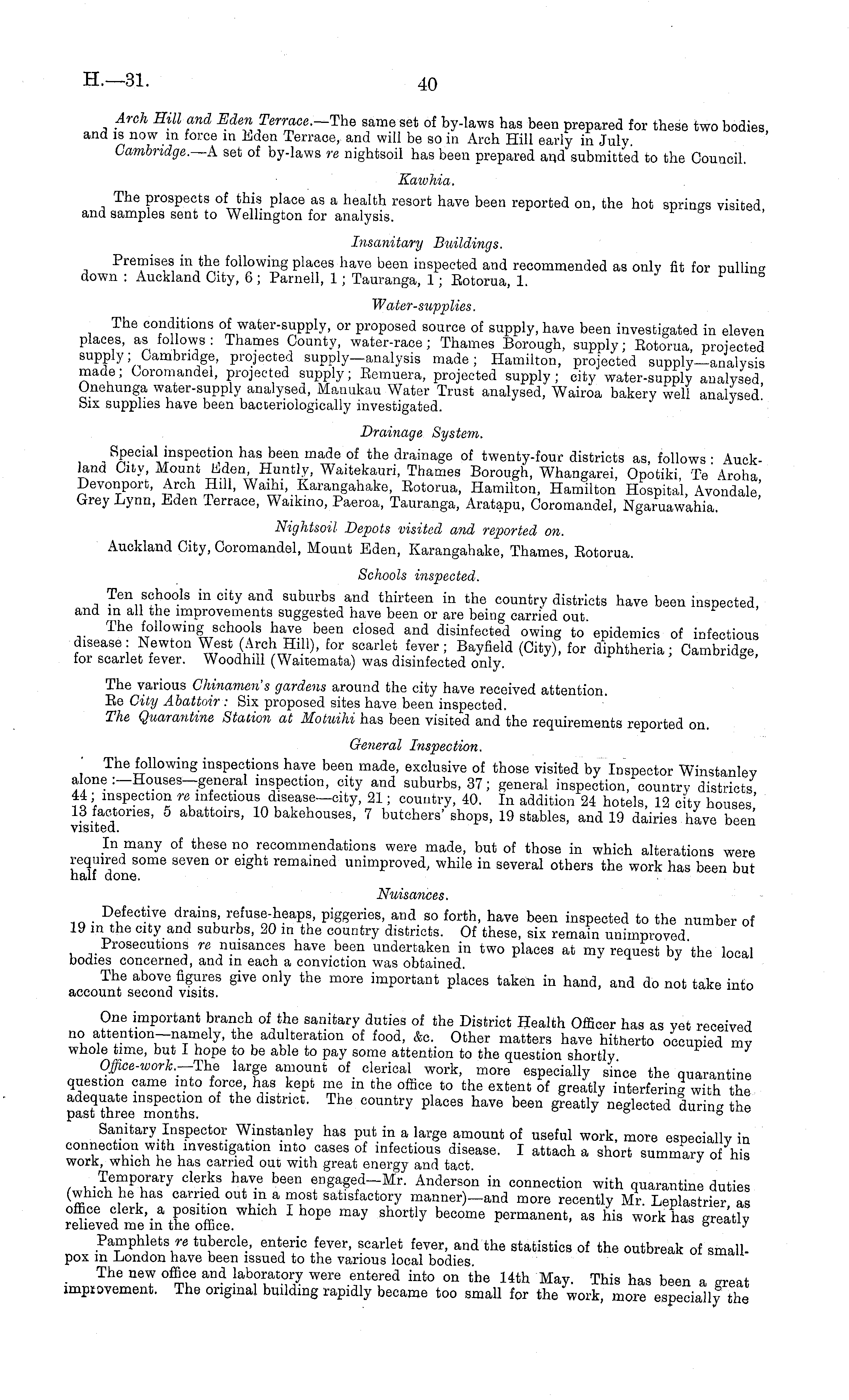 Arch Hill and Eden Terrace.—The same set of by-laws has been prepared for these two bodies and is now in force in Eden Terrace, and will be so in Arch Hill early in July. Cambridge.—k set of by-laws re nightsoil has been prepared and submitted to the Council. Kaivhia. The prospects of this place as a health resort have been reported on, the hot springs visited and samples sent to Wellington for analysis. ° Insanitary Buildings. Premises in the following places have been inspected and recommended as only fit for pullin°down : Auckland City, 6 ; Parnell, 1; Tauranga, 1; Eotorua, 1. Water-supplies. The conditions of water-supply, or proposed source of supply, have been investigated in eleven places, as follows : Thames County, water-race ; Thames Borough, supply; Eotorua, projected supply; Cambridge, projected supply—analysis made; Hamilton, projected supply—analysis made; Coromandel, projected supply; Eemuera, projected supply; city water-supply analysed Onehunga water-supply analysed, Mauukau Water Trust analysed, Wairoa bakery well analysed' bix supplies have been bacteriologically investigated. Drainage System. Special inspection has been made of the drainage of twenty-four districts as follows • Auckland City, Mount Uden, Huntly, Waitekauri, Thames Borough, Whangarei Opotiki Te A.roha Devonport, Arch Hill, Waihi, Karangahake, Eotorua, Hamilton, Hamilton Hospital Avondale' Grey Lynn, Eden Terrace, Waikino, Paeroa, Tauranga, Aratapu, Coromandel, Ngaruawahia. Nightsoil Depots visited and reported on. Auckland City, Coromandel, Mount Eden, Karangahake, Thames, Eotorua. Schools inspected. Ten schools in city and suburbs and thirteen in the country districts have been inspected and in all the improvements suggested have been or are being carried out. The following schools have been closed and disinfected owing to'epidemics of infectious disease: Newton West (Arch Hill), for scarlet fever; Bayfield (City), for diphtheria; Cambridge, for scarlet fever. Woodhill (Waicemata) was disinfected only. The various Chinamen's gardens around the city have received attention. Ec City Abattoir : Six proposed sites have been inspected. The Quarantine Station at Motuihi has been visited and the requirements reported on. General Inspection. ' The following inspections have been made, exclusive of those visited by Inspector Winstanlev alone :—Houses—general inspection, city and suburbs, 37; general inspection, country districts 44; inspection re infectious disease—city, 21; country, 40. In addition 24 hotels, 12 city houses' 13 factories, 5 abattoirs, 10 bakehouses, 7 butchers' shops, 19 stables, and 19 dairies have been visited. In many of these no recommendations were made, but of those in which alterations were required some seven or eight remained unimproved, while in several others the work has been but half done. Nuisances. Defective drains refuse-heaps, piggeries, and so forth, have been inspected to the number of 19 in the city and suburbs, 20 in the country districts. Of these, six remain unimproved Prosecutions re nuisances have been undertaken in two places at my request by the local bodies concerned, and in each a conviction was obtained. The above figures give only the more important places taken in hand, and do not take into account second visits. One important branch of the sanitary duties of the District Health Officer has as yet received no attention—namely, the adulteration of food, &c. Other matters have hitherto occupied mv whole time, but 1 hope to be able to pay some attention to the question shortly Office-work.—The large amount of clerical work, more especially since the quarantine question came into force, has kept me in the office to the extent of greatly interfering with the adequate inspection of the district. The country places have been greatly neglected during the pSiSt tiiree months. ° Sanitary Inspector Winstanley has put in a large amount of useful work, more especially in connection with investigation into cases of infectious disease. I attach a short summary of his work, which he has carried out with great energy and tact. / u- T v,T P °v. rary derk f h ? Ve beeD en g a B ed - Mr - Anderson in connection with quarantine duties (which he has carried out in a most satisfactory manner)—and more recently Mr. Leplastrier as rlrvefme'in%re S o t ffic n e. P6 beC ° me P ermanent - as work has greatly Pamphlets re tubercle, enteric fever, scarlet fever, and the statistics of the outbreak of smallpox m London have been issued to the various local bodies. _ The new office and laboratory were entered into on the 14th May. This has been a great improvement. The original building rapidly became too small for the work, more especially the