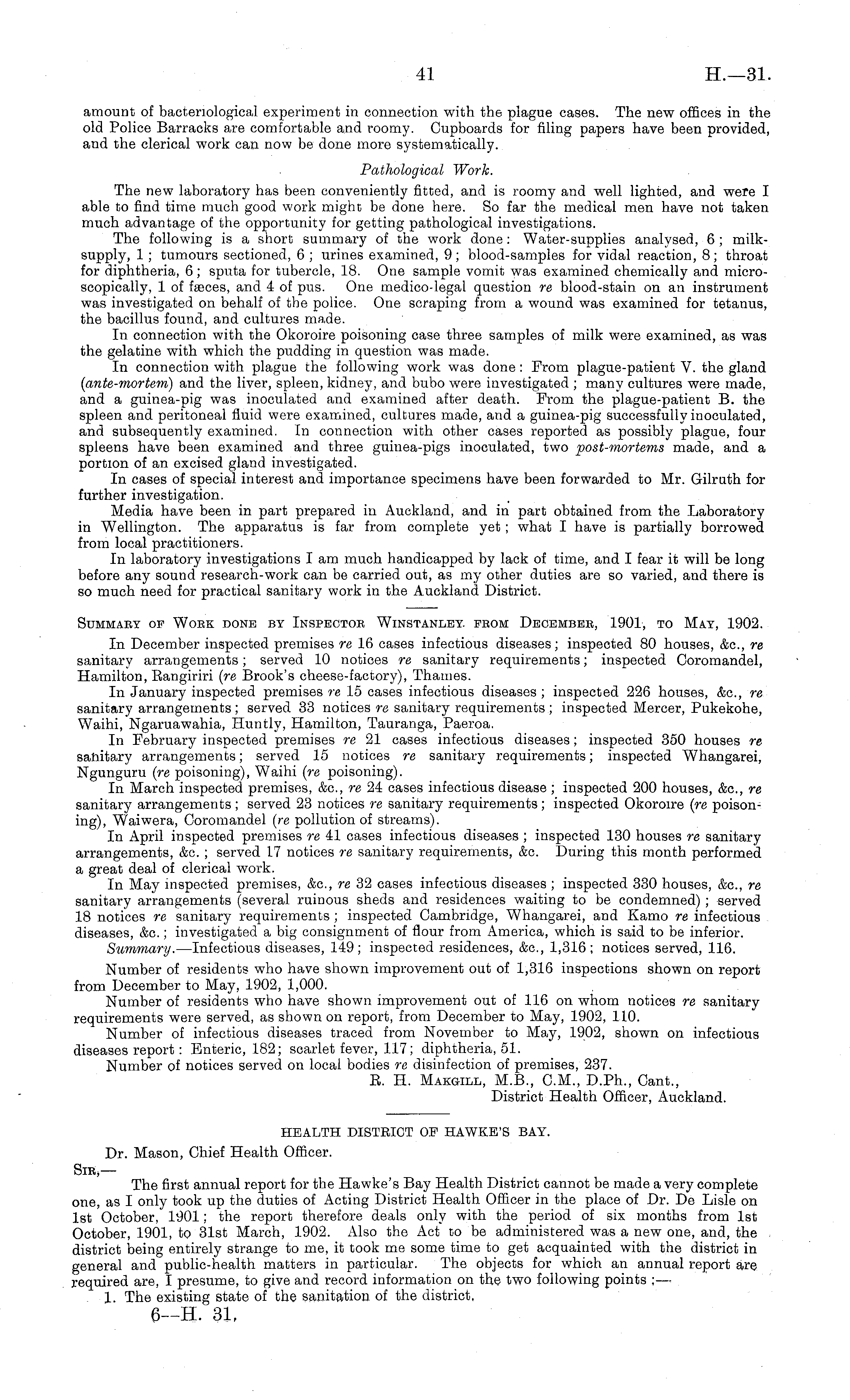 amount of bacteriological experiment in connection with the plague cases. The new offices in the old Police Barracks are comfortable and roomy. Cupboards for filing papers have been provided, and the clerical work can now be done more systematically. Pathological Work. The new laboratory has been conveniently fitted, and is roomy and well lighted, and were I able to find time much good work might be done here. So far the medical men have not taken much advantage of the opportunity for getting pathological investigations. The following is a short summary of the work done: Water-supplies analysed, 6 ; milksupply, 1 ; tumours sectioned, 6 ; urines examined, 9; blood-samples for vidal reaction, 8; throat for diphtheria, 6 ; sputa for tubercle, 18. One sample vomit was examined chemically and microscopically, lof fseces, and 4of pus. One medico-legal question re blood-stain on an instrument was investigated on behalf of the police. One scraping from a wound was examined for tetanus, the bacillus found, and cultures made. In connection with the Okoroire poisoning case three samples of milk were examined, as was the gelatine with which the pudding in question was made. In connection with plague the following work was done : From plague-patient V. the gland (ante-mortem) and the liver, spleen, kidney, and bubo were investigated ; many cultures were made, and a guinea-pig was inoculated and examined after death. From the plague-patient B. the spleen and peritoneal fluid were examined, cultures made, and a guinea-pig successfully inoculated, and subsequently examined. In connection with other cases reported as possibly plague, four spleens have been examined and three guinea-pigs inoculated, two post-mortems made, and a portion of an excised gland investigated. In cases of special interest and importance specimens have been forwarded to Mr. Gilruth for further investigation. Media have been in part prepared in Auckland, and in part obtained from the Laboratory in Wellington. The apparatus is far from complete yet ; what I have is partially borrowed from local practitioners. In laboratory investigations I am much handicapped by lack of time, and I fear it will be long before any sound research-work can be carried out, as my other duties are so varied, and there is so much need for practical sanitary work in the Auckland District. Summaey of Woek done by Inspectob Winstanlbt. peom Dbcbmbbe, 1901, to May, 1902. In December inspected premises re 16 cases infectious diseases; inspected 80 houses, &c, re sanitary arrangements; served 10 notices re sanitary requirements; inspected Coromandel, Hamilton, Eangiriri (re Brook's cheese-factory), Thames. In January inspected premises re 15 cases infectious diseases ; inspected 226 houses, &c, re sanitary arrangements ; served 33 notices re sanitary requirements ; inspected Mercer, Pukekohe, Waihi, Ngaruawahia, Huntly, Hamilton, Tauranga, Paeroa. In February inspected premises re 21 cases infectious diseases; inspected 350 houses re sanitary arrangements; served 15 notices re sanitary requirements; inspected Whangarei, Ngunguru (re poisoning), Waihi (re poisoning). In March inspected premises, &c, re 24 cases infectious disease ; inspected 200 houses, &c, re sanitary arrangements ; served 23 notices re sanitary requirements ; inspected Okoroire (re poisoning), Waiwera, Coromandel (re pollution of streams). In April inspected premises re 41 cases infectious diseases ; inspected 130 houses re sanitary arrangements, &c. ; served 17 notices re sanitary requirements, &c. During this month performed a great deal of clerical work. In May inspected premises, &c, re 32 cases infectious diseases ; inspected 330 houses, &c, re sanitary arrangements (several ruinous sheds and residences waiting to be condemned) ; served 18 notices re sanitary requirements ; inspected Cambridge, Whangarei, and Kamo re infectious diseases, &c.; investigated a big consignment of flour from America, which is said to be inferior. Summary. —lnfectious diseases, 149; inspected residences, &c, 1,316; notices served, 116. Number of residents who have shown improvement out of 1,316 inspections shown on report from December to M!ay, 1902, 1,000. Number of residents who have shown improvement out of 116 on whom notices re sanitary requirements were served, as shown on report, from December to May, 1902, 110. Number of infectious diseases traced from November to May, 1902, shown on infectious diseases report: Enteric, 182; scarlet fever, 117; diphtheria, 51. Number of notices served on local bodies re disinfection of premises, 237. E. H. Makgill, M.8., CM., D.Ph., Cant., District Health Officer, Auckland.