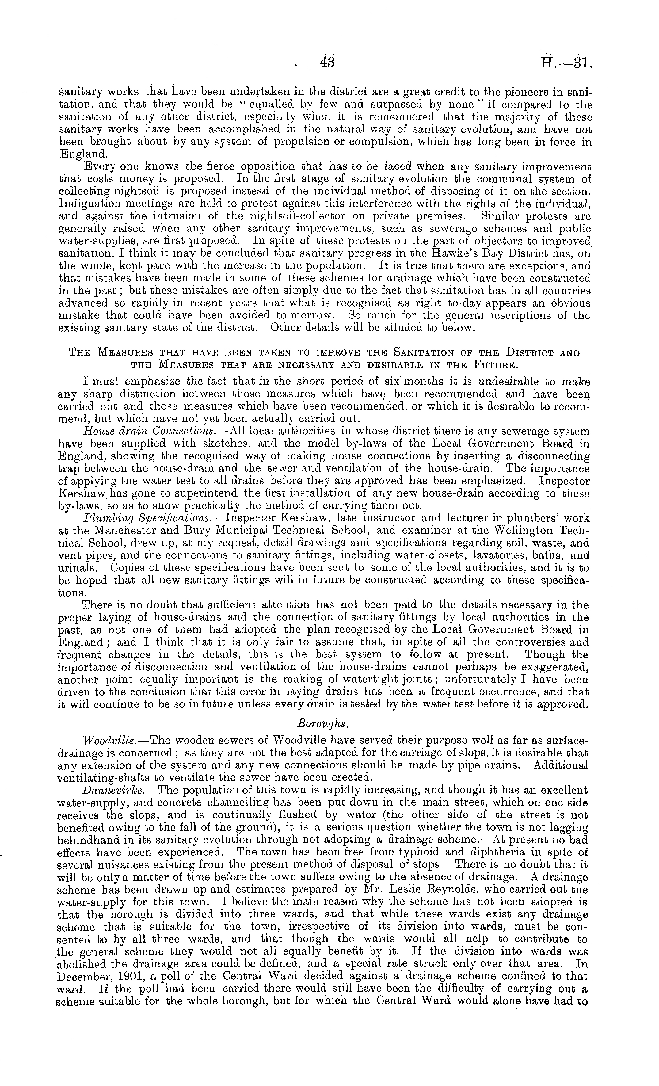 sanitary works that have been undertaken in the district are a great credit to the pioneers in sanitation, and that they would be " equalled by few and surpassed by none " if compared to the sanitation of any other district, especially when it is remembered that the majority of these sanitary works have been accomplished in the natural way of sanitary evolution, and have not been brought about by any system of propulsion or compulsion, which has long been in force in England. Every one knows the fierce opposition that has to be faced when any sanitary improvement that costs money is proposed. In the first stage of sanitary evolution the communal system of collecting nightsoil is proposed instead of the individual method of disposing of it on the section. Indignation meetings are held to protest against this interference with the rights of the individual, and against the intrusion of the nightsoil-collector on private premises. Similar protests are generally raised when any other sanitary improvements, such as sewerage schemes and public water-supplies, are first proposed. In spice of these protests on the part of objectors to improved sanitation, I think it may be concluded that sanitary progress in the Hawke's Bay District has, on the whole, kept pace with the increase in the population. It is true that there are exceptions, and that mistakes have been made in some of these schemes for drainage which have been constructed in the past; but these mistakes are often simply due to the fact that sanitation has in all countries advanced so rapidly in recent years that what is recognised as right to-day appears an obvious mistake that could have been avoided to-morrow. So much for the general descriptions of the existing sanitary state of the district. Other details will be alluded to below. The Measures that have been taken to impkove the Sanitation op the Disteict and the Measures that are necessary and desirable in the Futuee. I must emphasize the fact that in the short period of six months it is undesirable to make any sharp distinction between those measures which have been recommended and have been carried out and those measures which have been recommended, or which it is desirable to recommend, but which have not yet been actually carried out. House-drain Connections. —All local authorities in whose district there is any sewerage system have been supplied with sketches, and the model by-laws of the Local Government Board in England, showing the recognised way of making house connections by inserting a disconnecting trap between the house-drain and the sewer and ventilation of the house-drain. The importance of applying the water test to all drains before they are approved has been emphasized. Inspector Kershaw has gone to superintend the first installation of any new house-drain according to these by-laws, so as to show practically the method of carrying them out. Plumbing Specifications. —lnspector Kershaw, late instructor and lecturer in plumbers' work at the Manchester and Bury Municipal Technical School, and examiner at the Wellington Technical School, drew up, at my request, detail drawings and specifications regarding soil, waste, and vent pipes, and the connections to sanitary fittings, including water-closets, lavatories, baths, and urinals. Copies of these specifications have been sent to some of the local authorities, and it is to be hoped that all new sanitary fittings will in future be constructed according to these specifications. There is no doubt that sufficient attention has not been paid to the details necessary in the proper laying of house-drains and the connection of sanitary fittings by local authorities in the past, as not one of them had adopted the plan recognised by the Local Government Board in England ; and I think that it is only fair to assume that, in spite of all the controversies and frequent changes in the details, this is the best system to follow at present. Though the importance of disconnection and ventilation of the house-drains cannot perhaps be exaggerated, another point equally important is the making of watertight joints; unfortunately I have been driven to the conclusion that this error in laying drains has been a frequent occurrence, and that it will continue to be so in future unless every drain is tested by the water test before it is approved. Boroughs. Woodville. —The wooden sewers of Woodville have served their purpose well as far as surfacedrainage is concerned ; as they are not the best adapted for the carriage of slops, it is desirable that any extension of the system and any new connections should be made by pipe drains. Additional ventilating-shafts to ventilate the sewer have been erected. Dannevirke. —The population of this town is rapidly increasing, and though it has an excellent water-supply, and concrete channelling has been put down in the main street, which on one side receives the slops, and is continually flushed by water (the other side of the street is not benefited owing to the fall of the ground), it is a serious question whether the town is not lagging behindhand in its sanitary evolution through not adopting a drainage scheme. At present no bad effects have been experienced. The town has been free from typhoid and diphtheria in spite of several nuisances existing from the present method of disposal of slops. There is no doubt that it will be only a matter of time before the town suffers owing to the absence of drainage. A drainage scheme has been drawn up and estimates prepared by Mr. Leslie Eeynolds, who carried out the water-supply for this town. I believe the main reason why the scheme has not been adopted is that the borough is divided into three wards, and that while these wards exist any drainage scheme that is suitable for the town, irrespective of its division into wards, must be consented to by all three wards, and that though the wards would all help to contribute to the general scheme they would not
