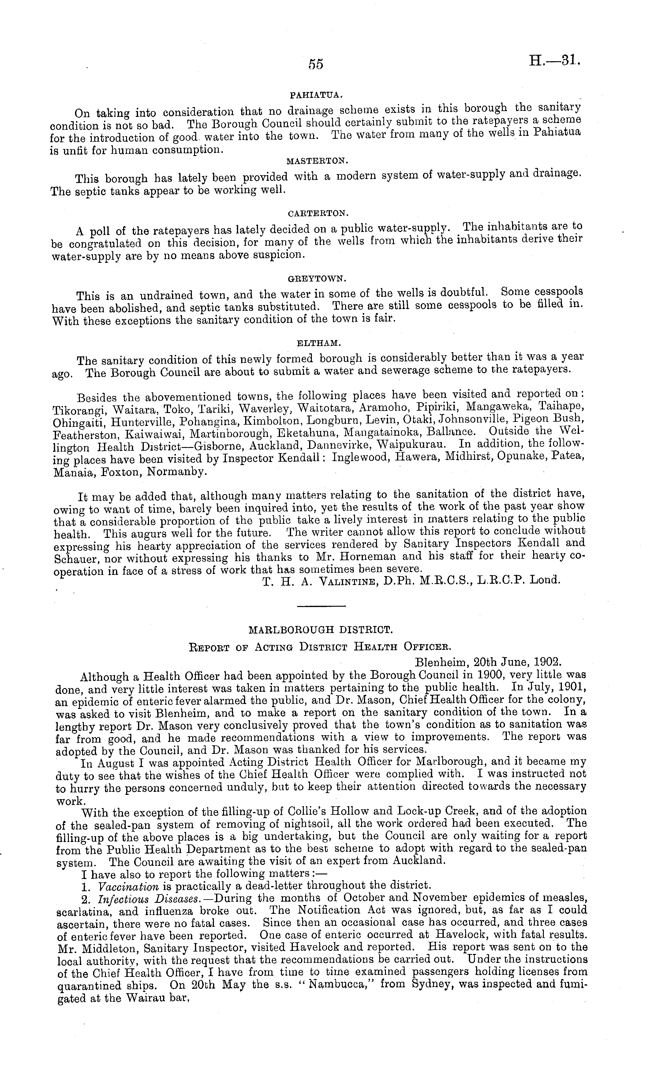 MARLBOROUGH DISTRICT. Ebpoet of Acting District Health Officer. Blenheim, 20th June, 1902. Although a Health Officer had been appointed by the Borough Council in 1900, very little was done, and very little interest was taken in matters pertaining to the public health. In July, 1901, an epidemic of enteric fever alarmed the public, and Dr. Mason, Chief Health Officer for the colony, was asked to visit Blenheim, and to make a report on the sanitary condition of the town. In a lengthy report Dr. Mason very conclusively proved that the town's condition as to sanitation was far°from good, and he made recommendations with a view to improvements. The report was adopted by the Council, and Dr. Mason was thanked for his services. In August I was appointed Acting District Health Officer for Marlborough, and it became my duty to see that the wishes of the Chief Health Officer were complied with. I was instructed not to hurry the persons concerned unduly, but to keep their attention directed towards the necessary work. With the exception of the filling-up of Collie's Hollow and Lock-up Creek, and of the adoption of the sealed-pan system of removing of nightsoil, all the work ordered had been executed. The filling-up of the above places is a big undertaking, but the Council are only waiting for a report from the Public Health Department as to the best scheme to adopt with regard to the sealed-pan system. The Council are awaiting the visit of an expert from Auckland. I have also to report the following matters: — 1. Vaccination is practically a dead-letter throughout the district. 2. Infectious Diseases. —During the months of October and November epidemics of measles, scarlatina, and influenza broke out. The Notification Act was ignored, but, as far as I could ascertain, there were no fatal cases. Since then an occasional case has occurred, and three cases of enteric fever have been reported. One case of enteric occurred at Havelock, with fatal results. Mr. Middleton, Sanitary Inspector, visited Havelock and reported. His report was sent on to the local authority, with the request that the recommendations be carried out. Under the instructions of the Chief Health Officer, I have from time to time examined passengers holding licenses from quarantined ships. On 20th May the s.s. " Nambueca," from Sydney, was inspected and fumigated at the Wairau bar,